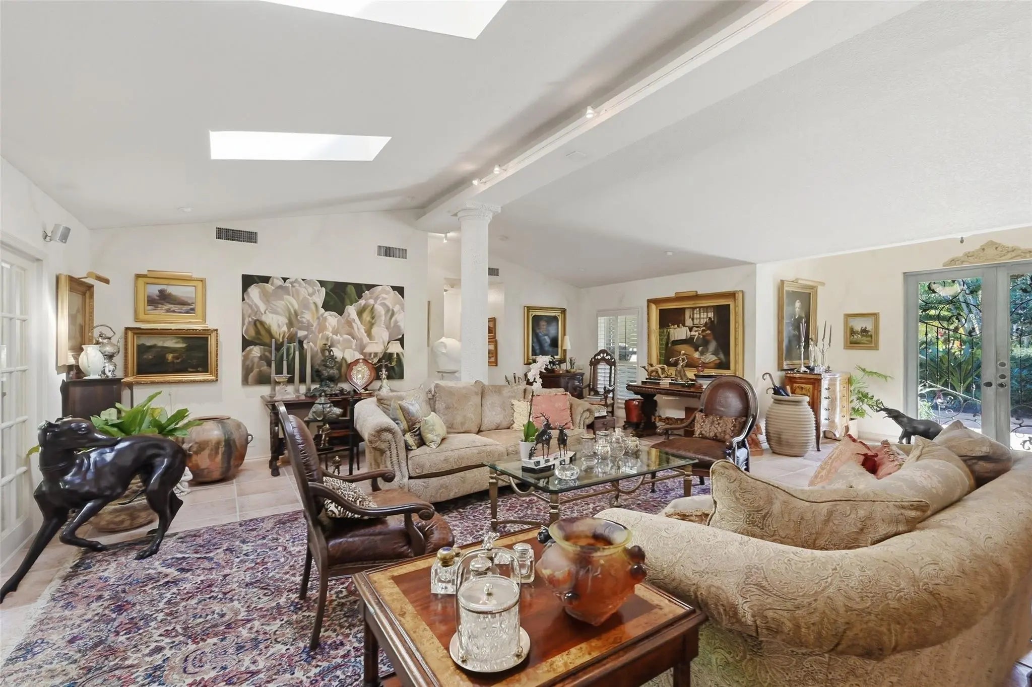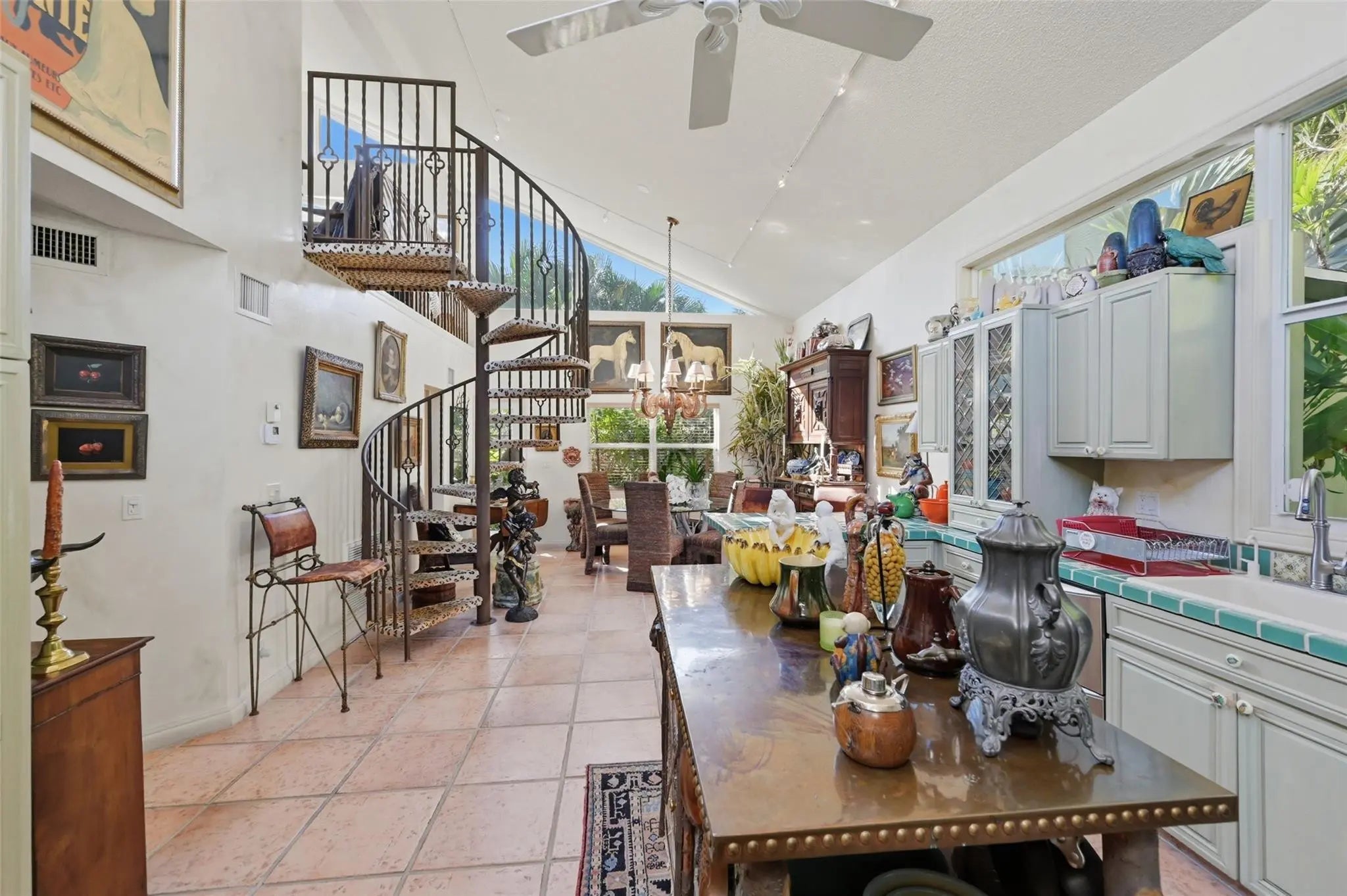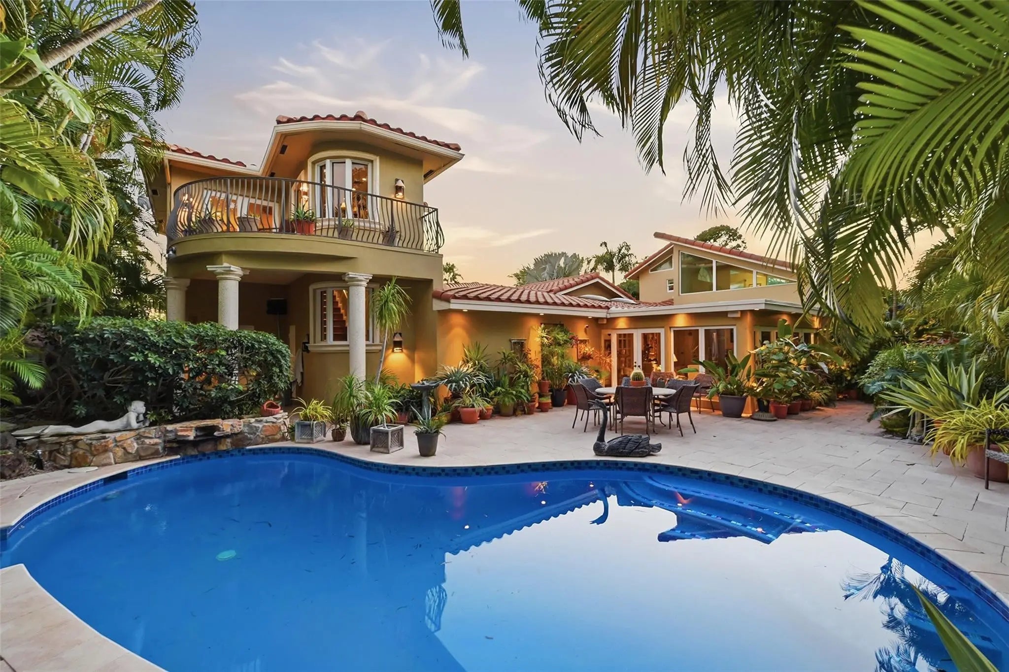Experience light-filled luxury in this 3BD/3BA Mediterranean estate on a lush 10,005 SF lot. An open floor plan reveals vaulted ceilings, Brazilian Cherry and Maple floors, and a dramatic eat-in kitchen with a spiral staircase leading to a loft home office. The airy Florida Room overlooks tropical gardens cultivated over 30 years and a newly remodeled pool (2025) with an outdoor shower. Dual Primary Suites offer total privacy: the 1st-floor retreat boasts a spa-bath, while the upstairs suite features a private balcony. The main level is further rounded out by a cozy den and a separate guest bedroom with a European-style bath. A unique 2-story garage serves as the ultimate hobbyist’s dream with a commercial door, car lift, catering ovens, and ample storage. Freshly painted!