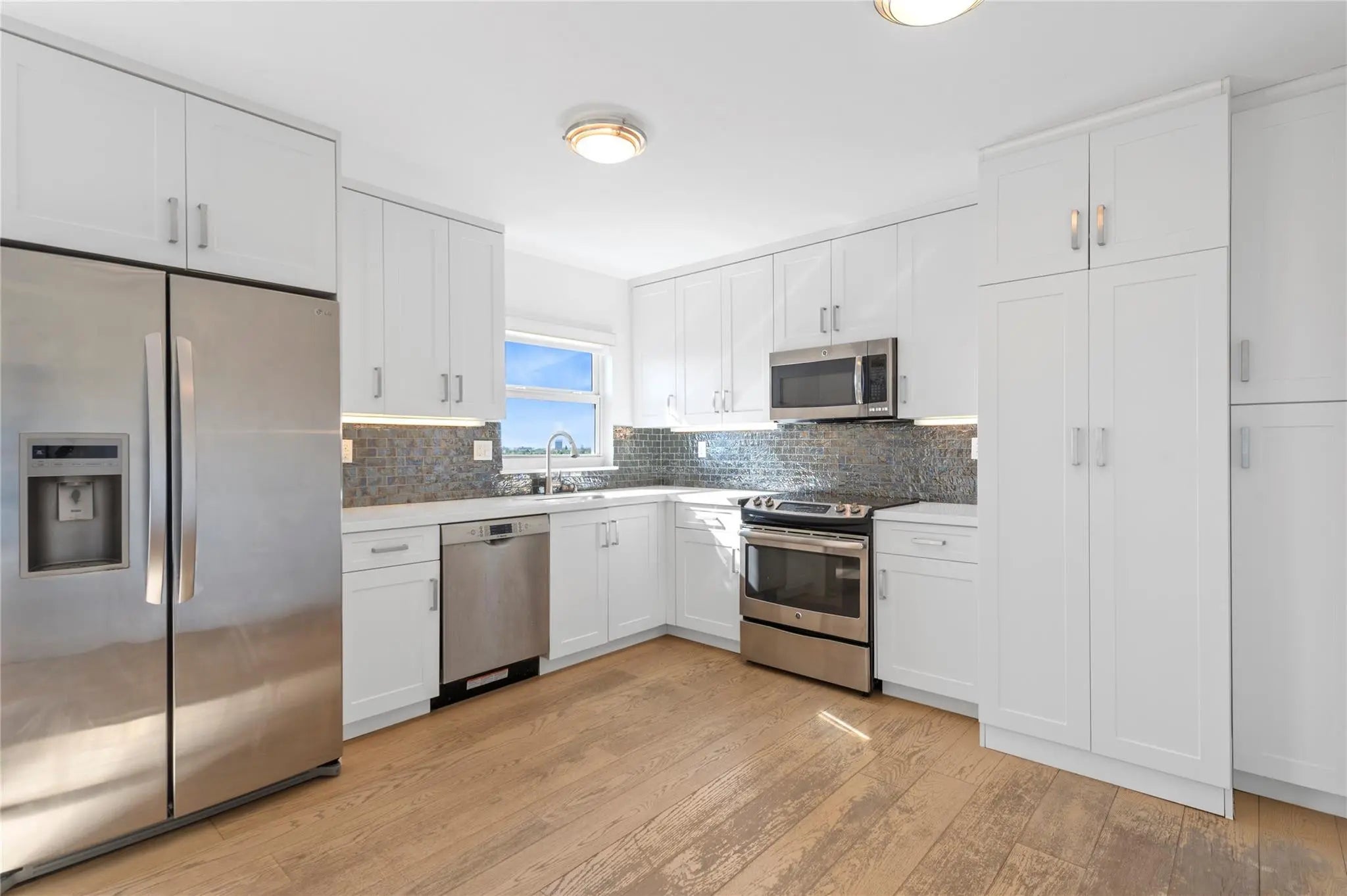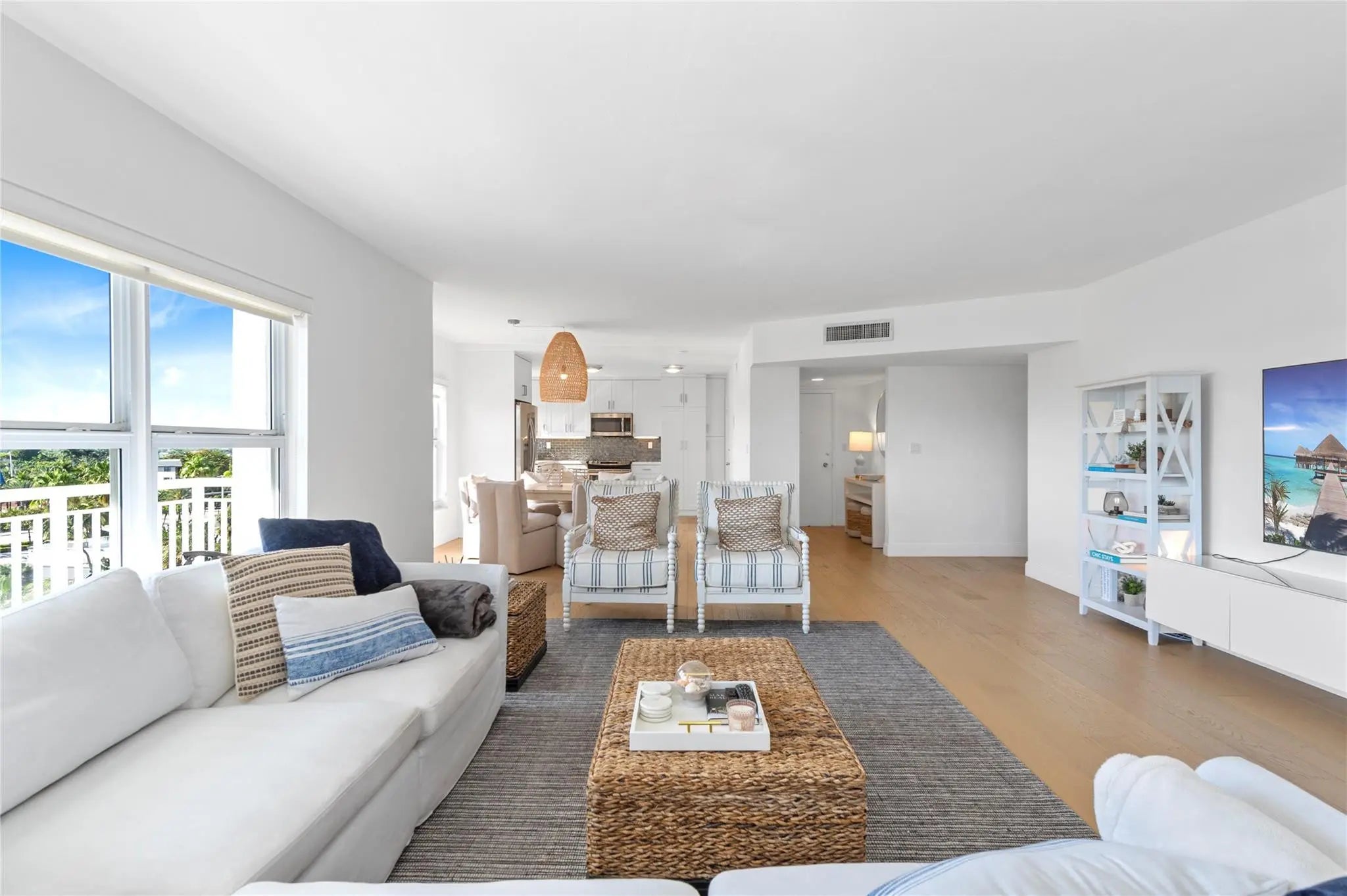 Located in the Bayview school district, stunning southwest annual unfurnished corner unit with an expansive wrap-around balcony! The open floor-plan, with engineered hardwood floors and contemporary fixtures, has produced a living area that is spacious, airy, and bright. The kitchen sports shaker-style white kitchen cabinets, gray subway tile backsplash, and quartz countertops along with washer & dryer. Second bedroom and ensuite bathroom are spacious and has a walk-in closet. The master bathroom has double sinks, a large walk-in closet. Impact windows and doors throughout. Brand new AC and water heater. Storage locker on the same floor. Amenities include a fitness center, game room, beach chairs/umbrellas, and more. WiFi, cable w/HBO, water, sewer, trash all included in rental payment.