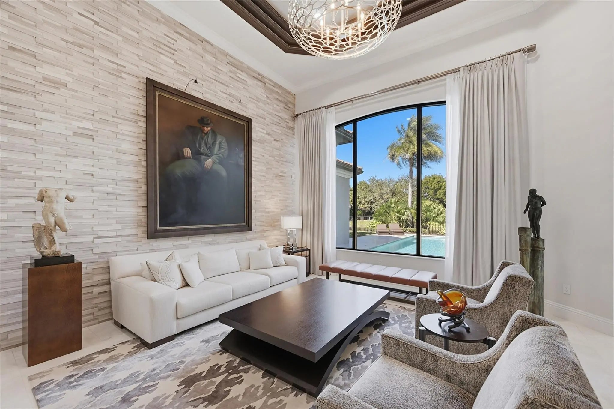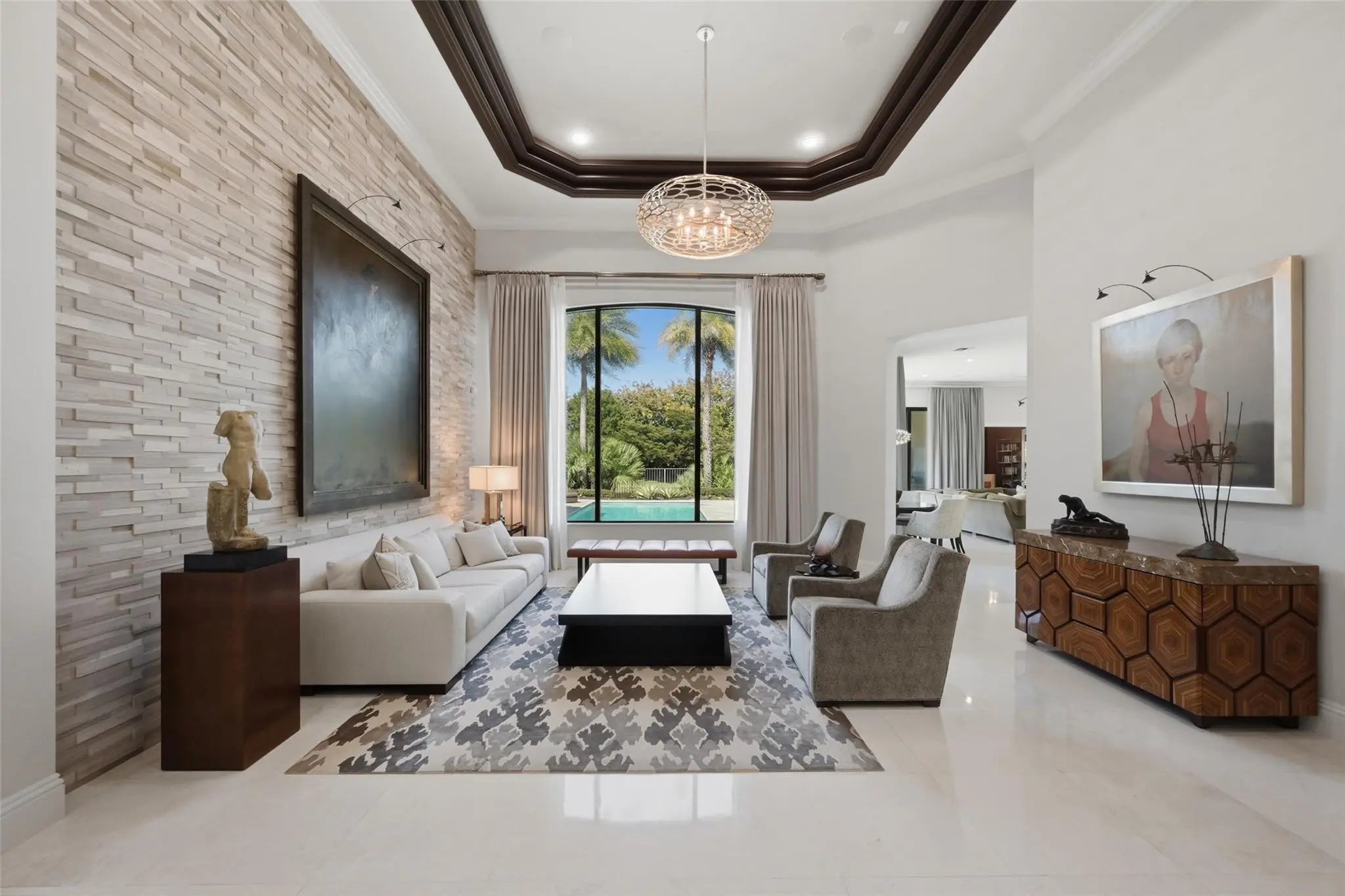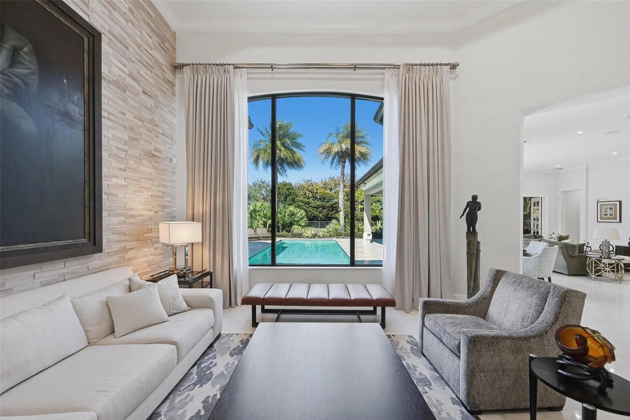 Walk into sophisticated living in this magnificent Turn Key, professionally designed modern masterpiece. A Belvedere Extended model, is 4,956 SF under air, on 1/2 acre waterfront paradise. The grand entry unfolds 4 BR/ 5 1/2 BA, Library or 5th BR + OFFICE with stylish custom finishes, an indoor/outdoor lifestyle overlooking picturesque views. Relax in the resort styled pool & lanai complete with a summer kitchen in total privacy from neighbors. The open plan is elevated with professionally designed furnishings, window coverings & custom wall paper creating the perfect furnished home; Turn Key & Move in ready. Seven Bridges boasts a resort lifestyle with unmatched amenities for vibrant people of all ages: Clubhouse, Pools, Playground, Restaurant, Tennis/Pickleball & Social Clubs. This modern masterpiece is conveyed Fully Furnished and Turn Key. Exceptions to the purchase are original art and sculpture, LR Buffet and Drop lid Antique Desk in Primary Bedroom Hall & personal items. List of Upgrades and Exceptional Features is available.