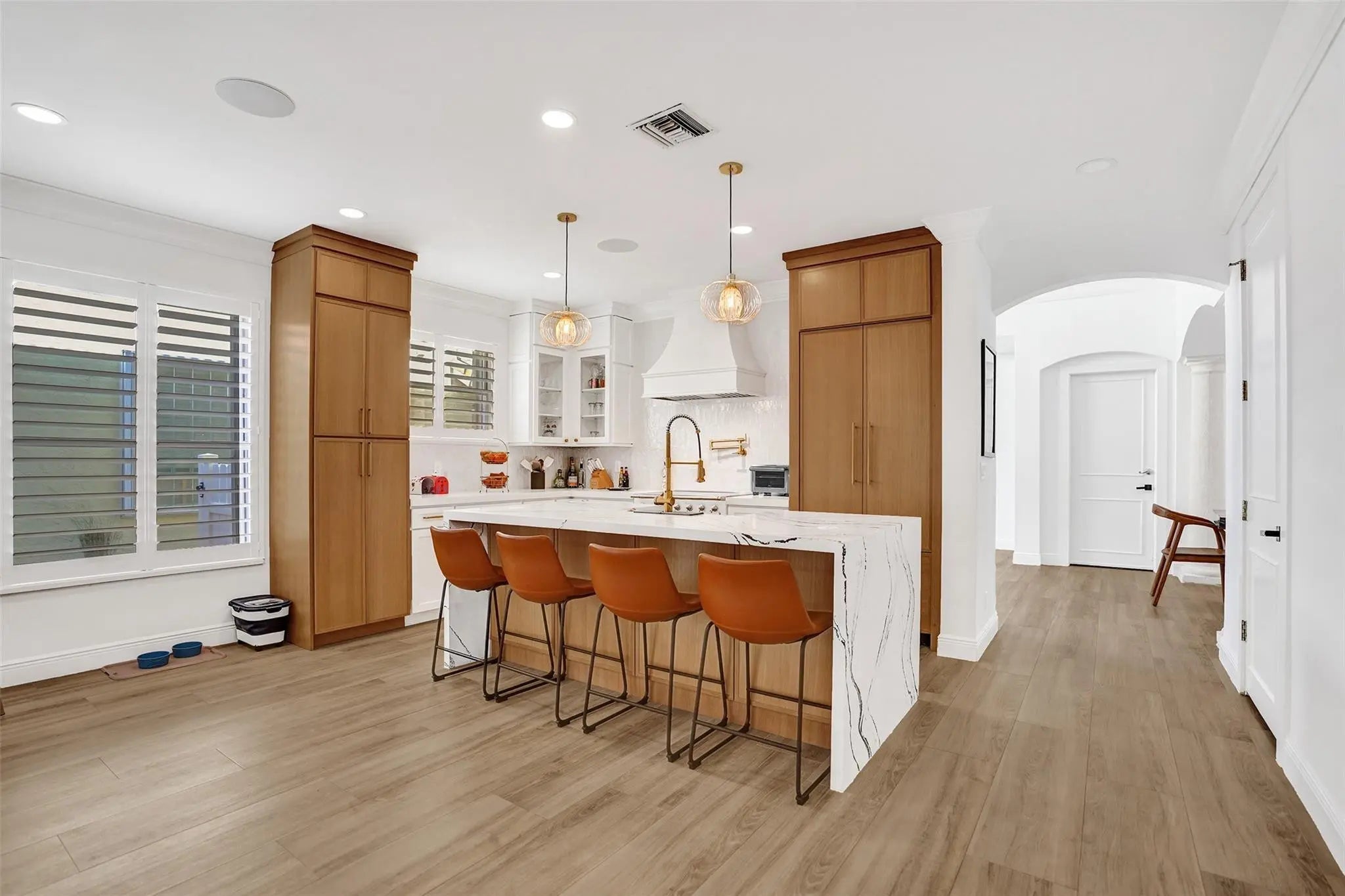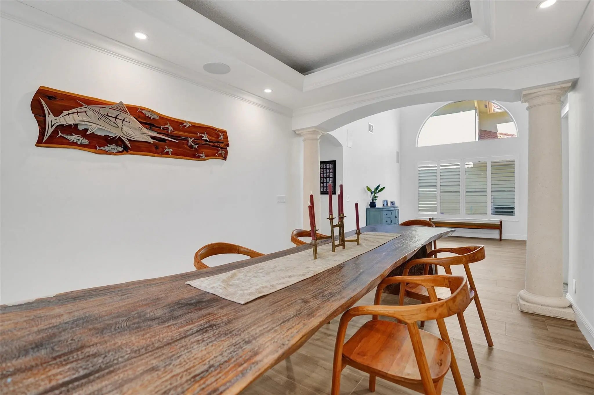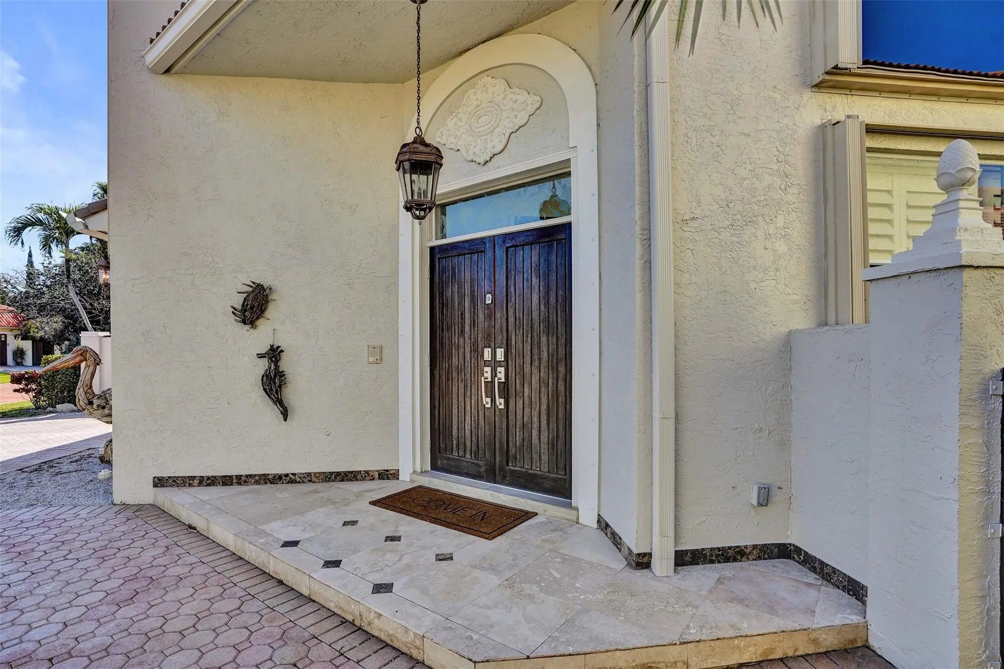 Magnificent 2 story estate in Pelican Harbor w/ a 70' dock & no fixed bridges, close to Lake Boca & ocean. This elegant home was renovated less than 2 years ago & features a grand entrance w/ dramatic volume ceilings, crown molding, arched windows, custom lighting, & wood floors throughout. Enjoy a whole-house audio system & a luxurious primary suite w/ dual closets & vanities, soaking tub, & a glass steam shower. Gourmet eat-in kitchen offers a center island, custom wood cabinetry, quartz countertops, & top-of-the-line appliances. Additional highlights include designer finishes & wallpaper, immaculate landscaping, a private patio ideal for entertaining, impact doors, a paver driveway, & a 2 car garage. Resort-style amenities include 2 pools, tennis, pickleball, a fitness center, and more.