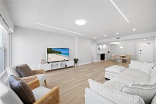 Turnkey beachfront condo with no expense spared. This spacious residence has been fully renovated from top to bottom. The open kitchen features matching quartz countertops, navy blue & white cabinetry, stainless steel appliances, and recessed lighting throughout. High-end luxury vinyl flooring complements the modern design. Both bathrooms are beautifully remodeled with coordinating vanities and finishes. Custom recessed lighting in every room creates a bright, inviting feel. Enjoy expansive ocean views from the large balcony. Impact windows and doors throughout. Includes a garage parking space & extra storage. Resort-style amenities: pool, two gyms, community room with kitchen, media room, game room & car wash area. Walking distance to grocery, entertainment, pharmacies, banks and more.