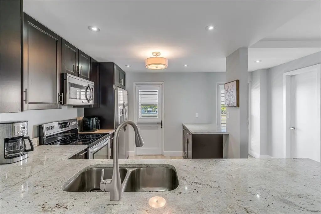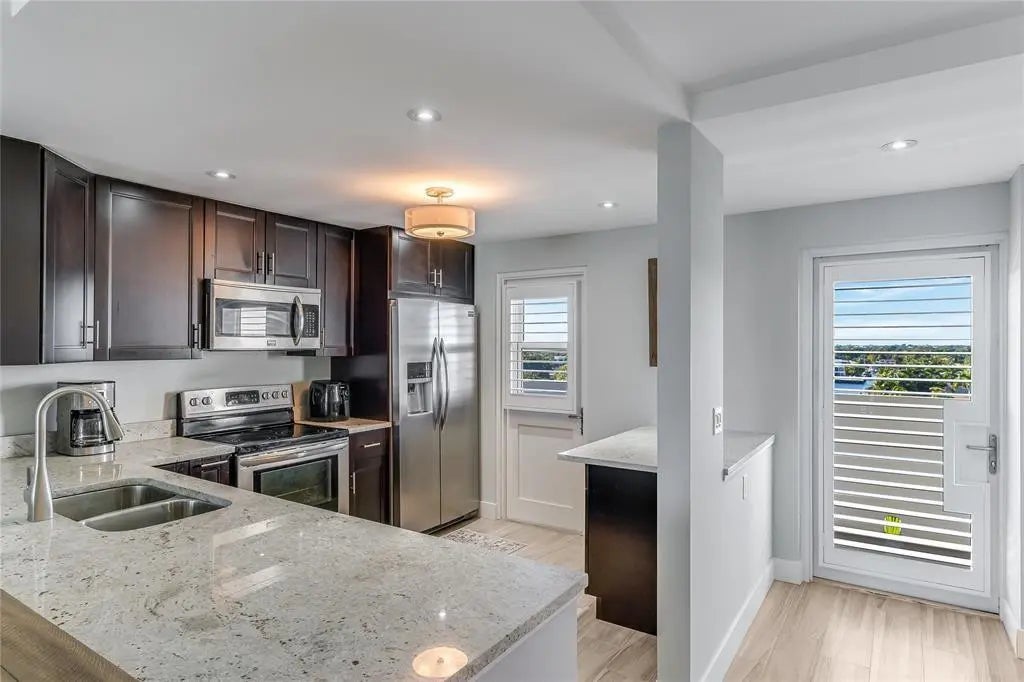 Beach Lifestyle~Completely Remodeled & furnished! Ocean views when entering. Huge 1 bedroom 1.5 baths Open, flexible floor plan w/contemporary flair. Parking space near entrance door. Beautiful custom kitchen. Spacious primary bedroom suite, custom built walk-in closet, slider opening to balcony. Lots of storage w/custom closets & a wall unit disguised as a queen size Murphy bed. Impact windows, sliders, doors & window treatments. 50 Year inspection completed! 24/7 desk & security, gym, pool, clubhouse & BBQ area. Pet friendly. Enjoy the best of both worlds by experiencing gorgeous sunrises & intercoastal views w/spectacular sunsets! Tropical lifestyle in-convenient location walk to restaurants, shopping & parks close by.