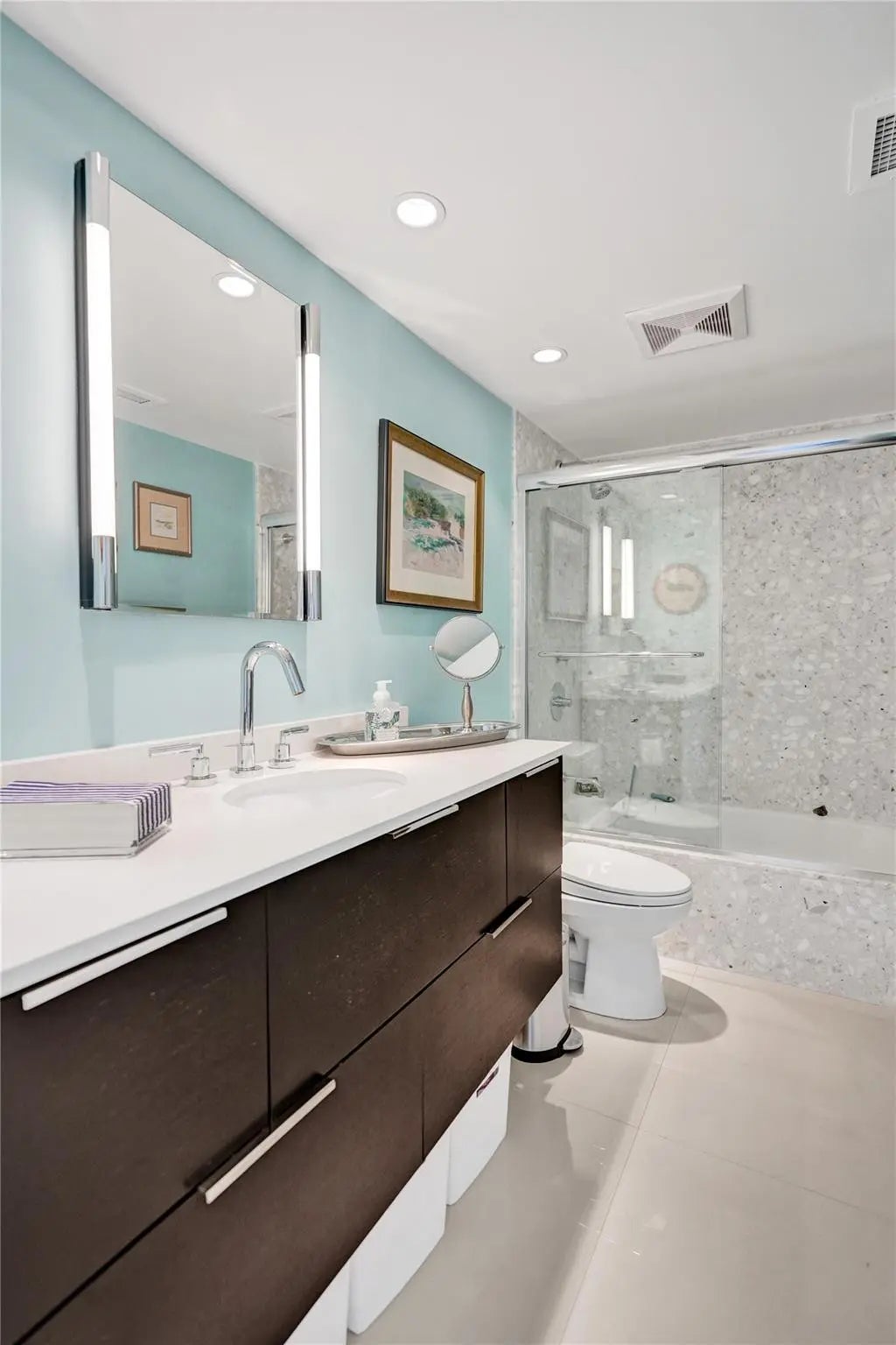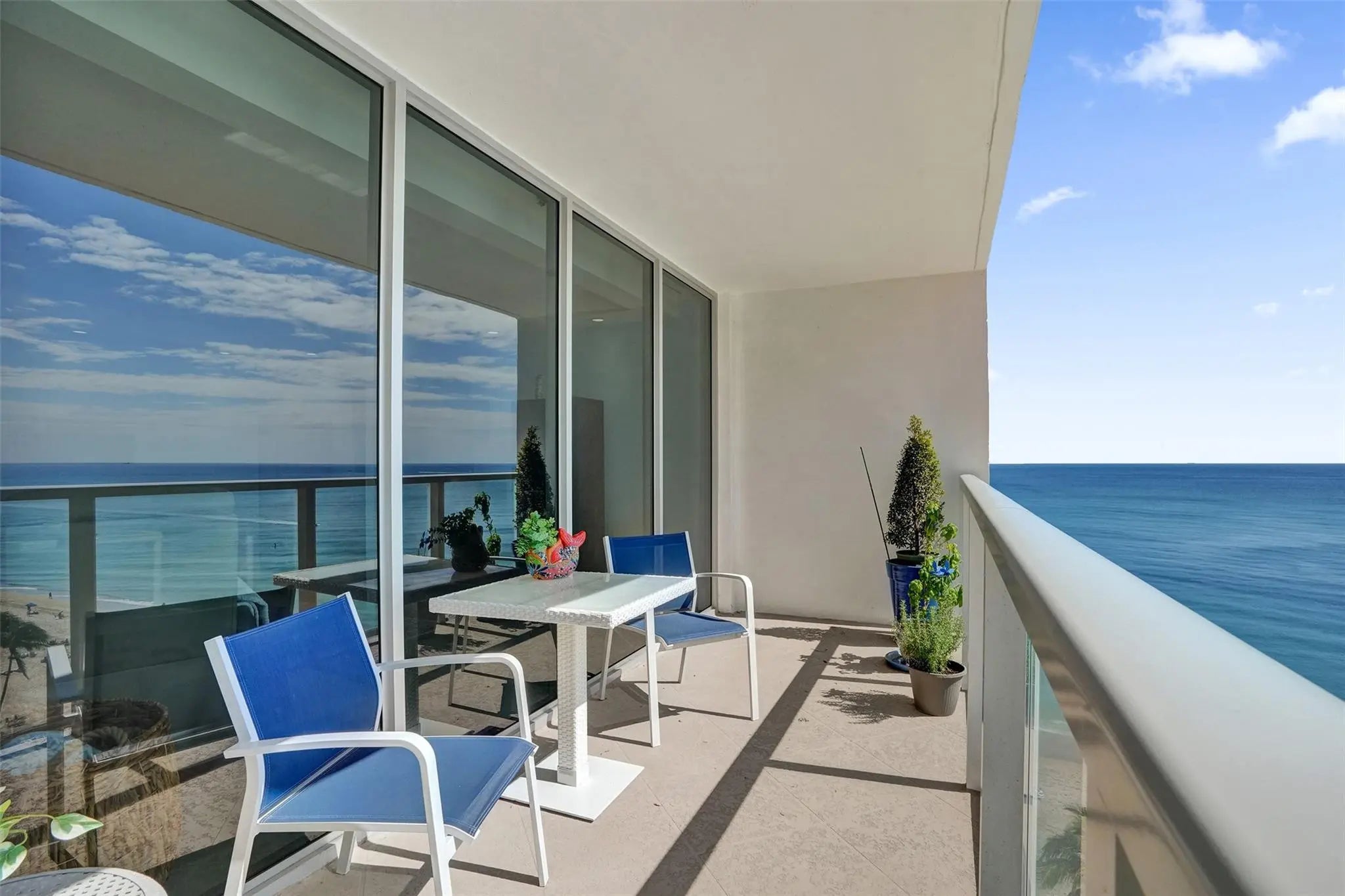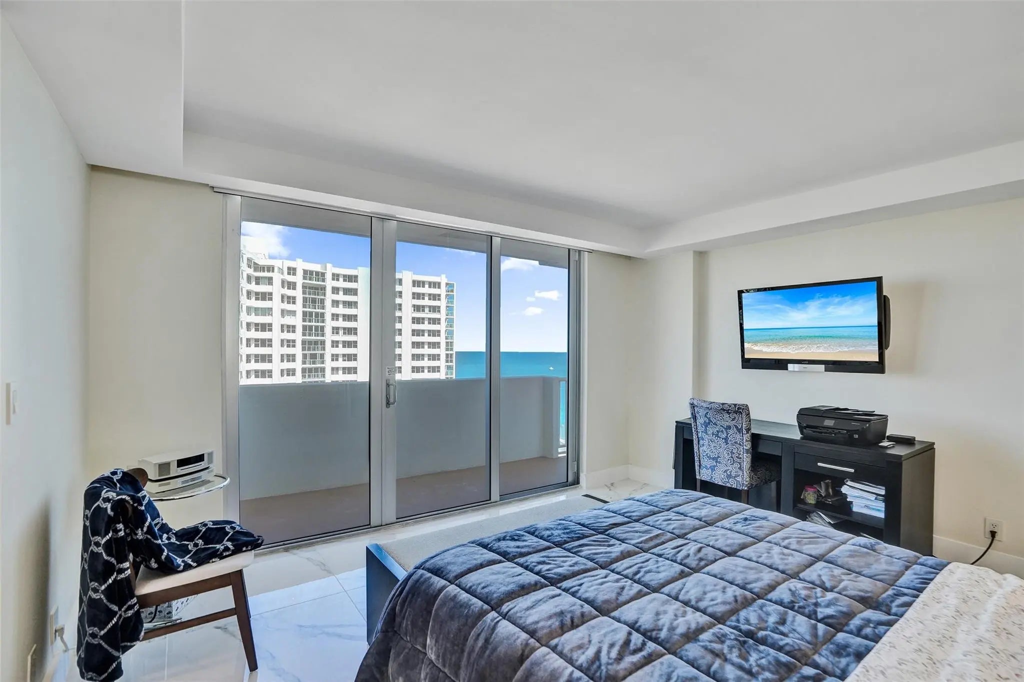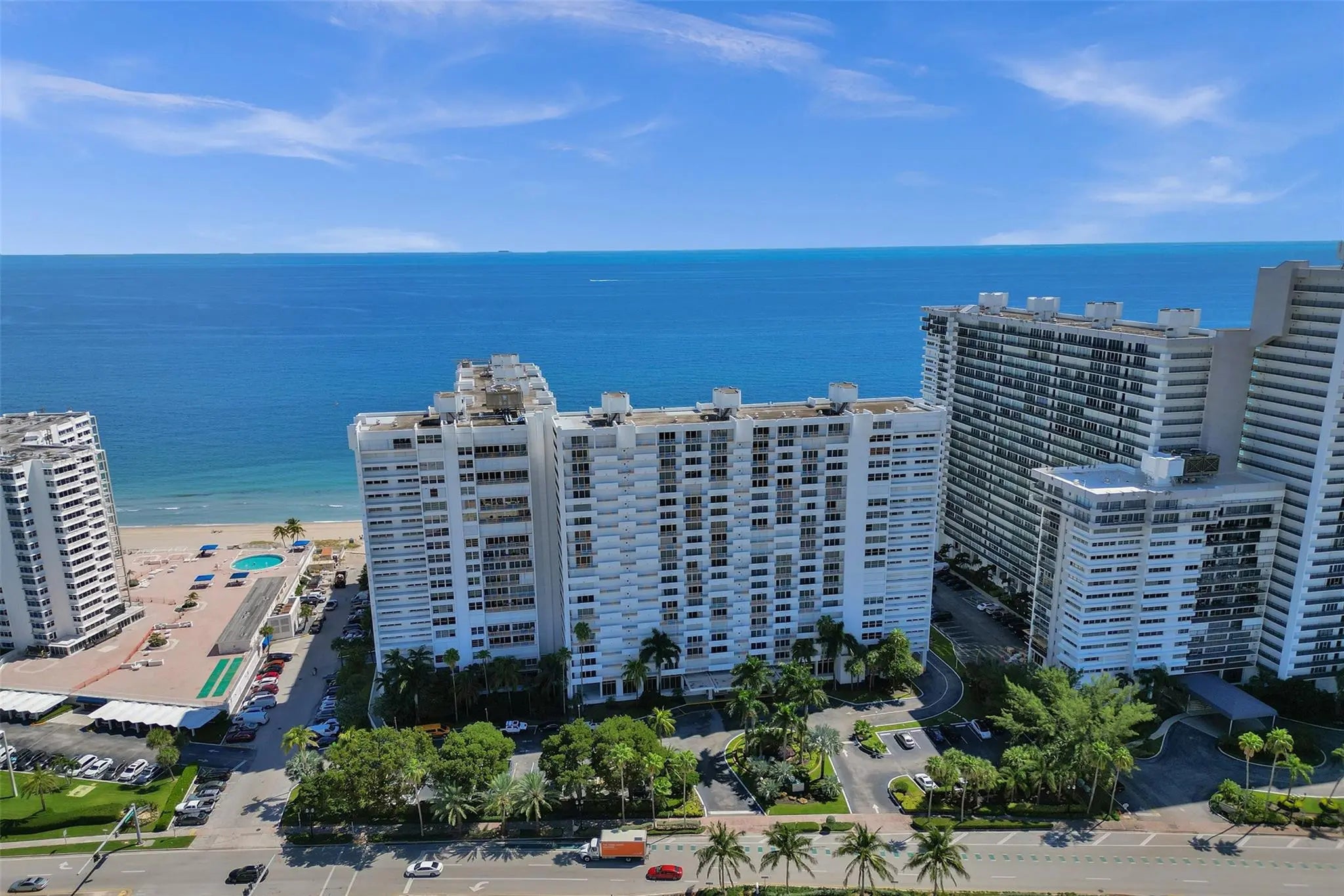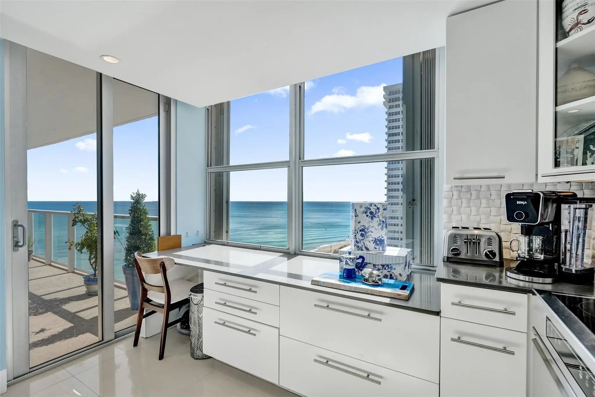 Stunning, fully renovated 2 Bedroom, 2 Bath condo with breathtaking ocean and city views from both the north and south exposures. Semi private elevator opens to a bright, open floor plan featuring an updated kitchen with stainless steel appliances, tile flooring throughout, and floor to ceiling impact windows and doors. Spacious primary suite offers a beautifully updated bath and walk in closet. Generous second bedroom also enjoys ocean and city views. In unit laundry, abundant storage, and garage parking included. Enjoy a large balcony overlooking the ocean and pool. Luxury amenities include 24 hour security, valet, resort style pool, putting green, fitness center, and private beach access. Just minutes to dining and shopping.