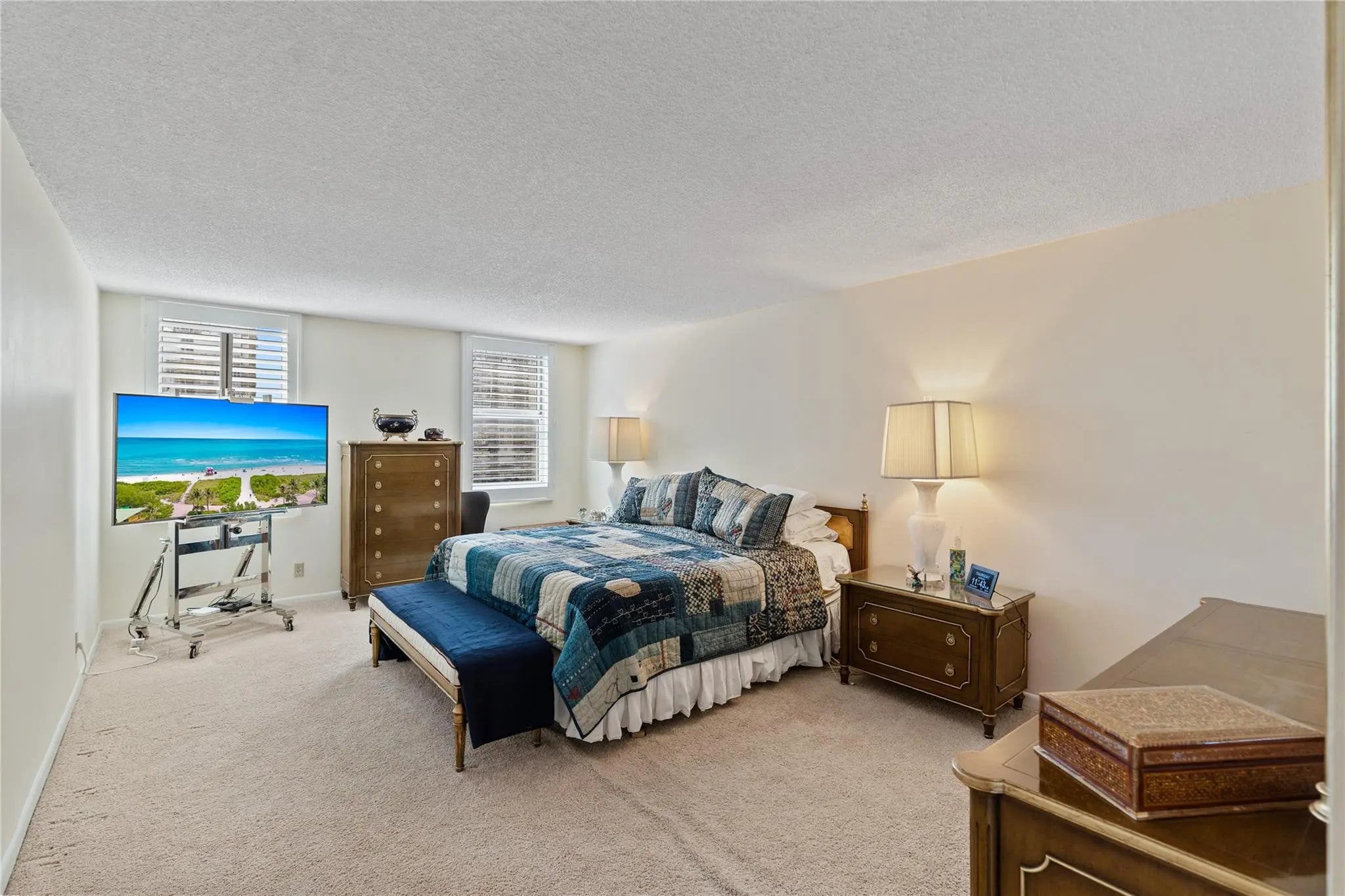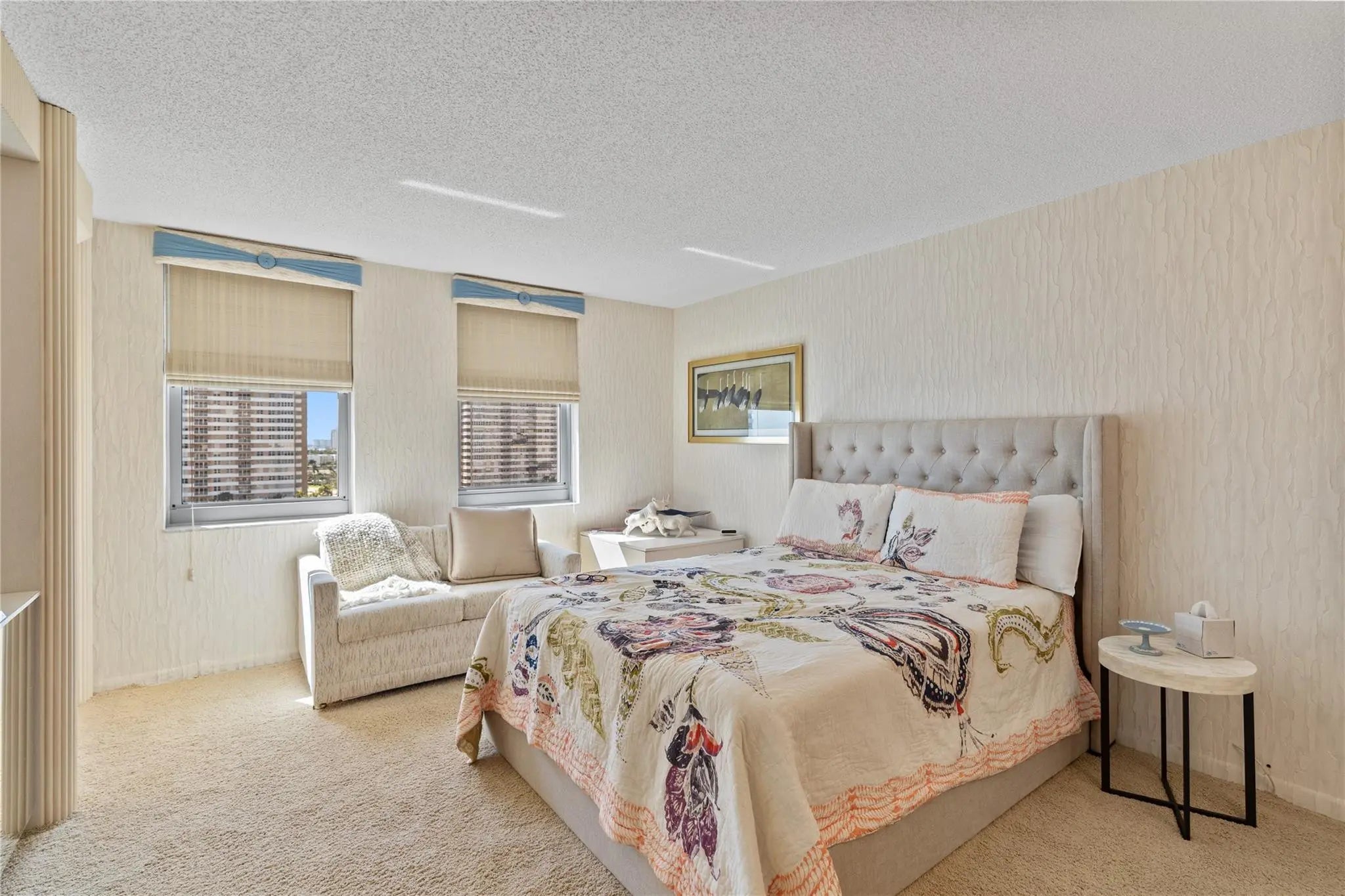 Fully furnished two bedroom two and half bathrooms located on 11th floor overlooking ocean. Walk in closet in hall next to half bathroom converted into two twin bed childrens room. Large corner unit. Only four units per floor. Owner willing to rent yearly or month to month minimum 9 months.