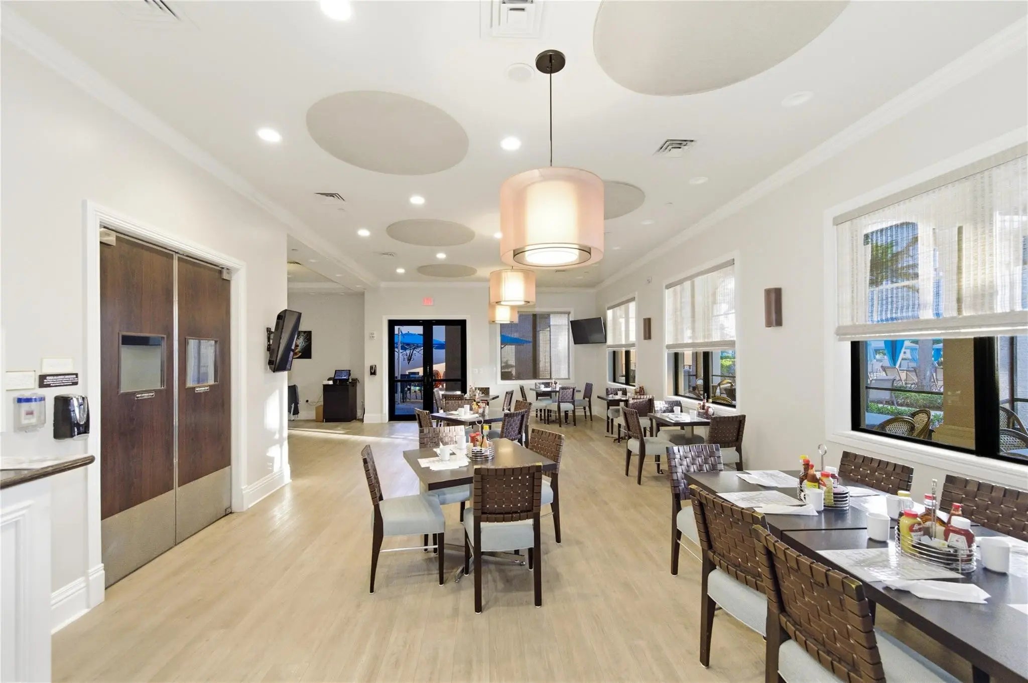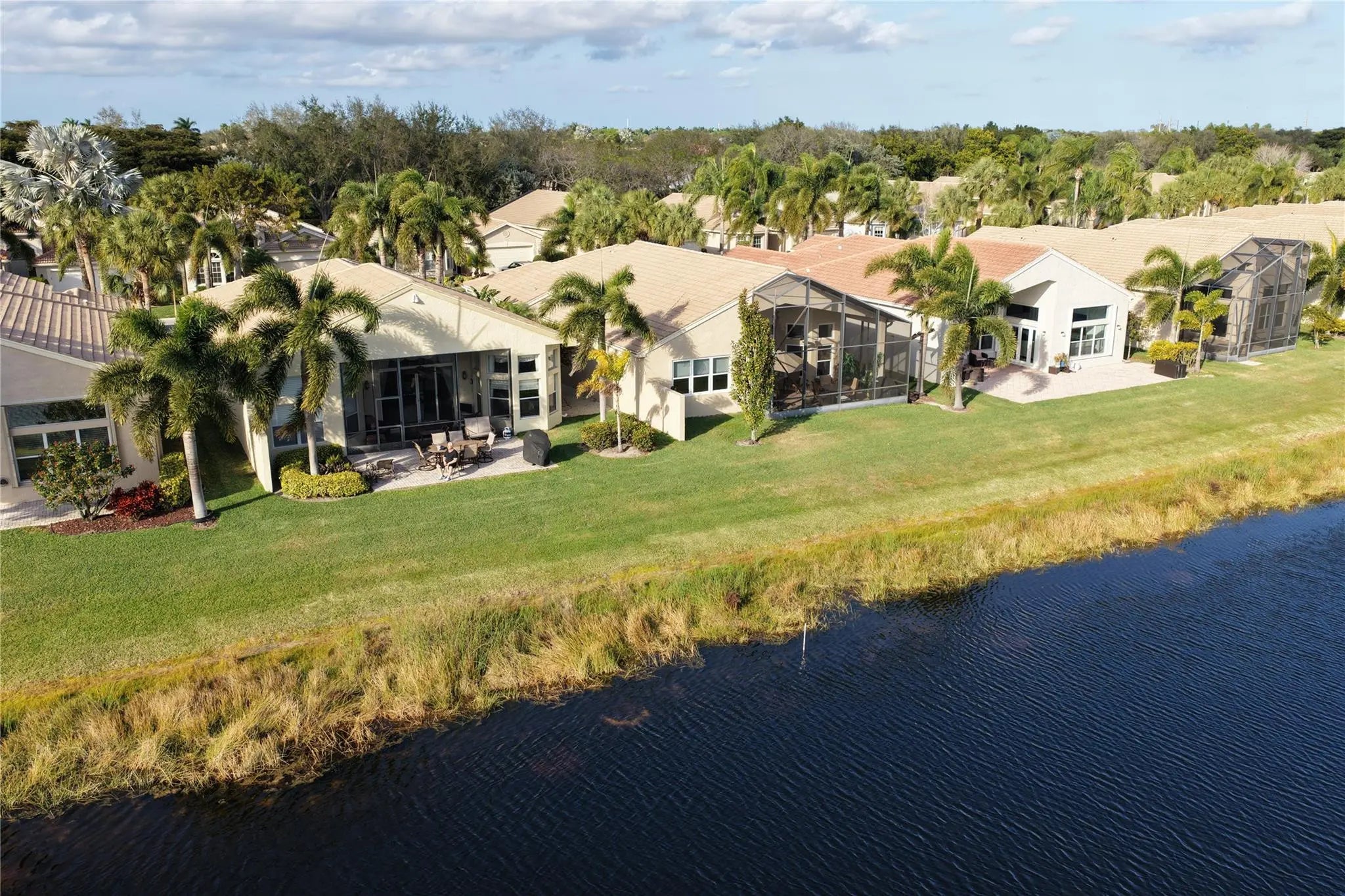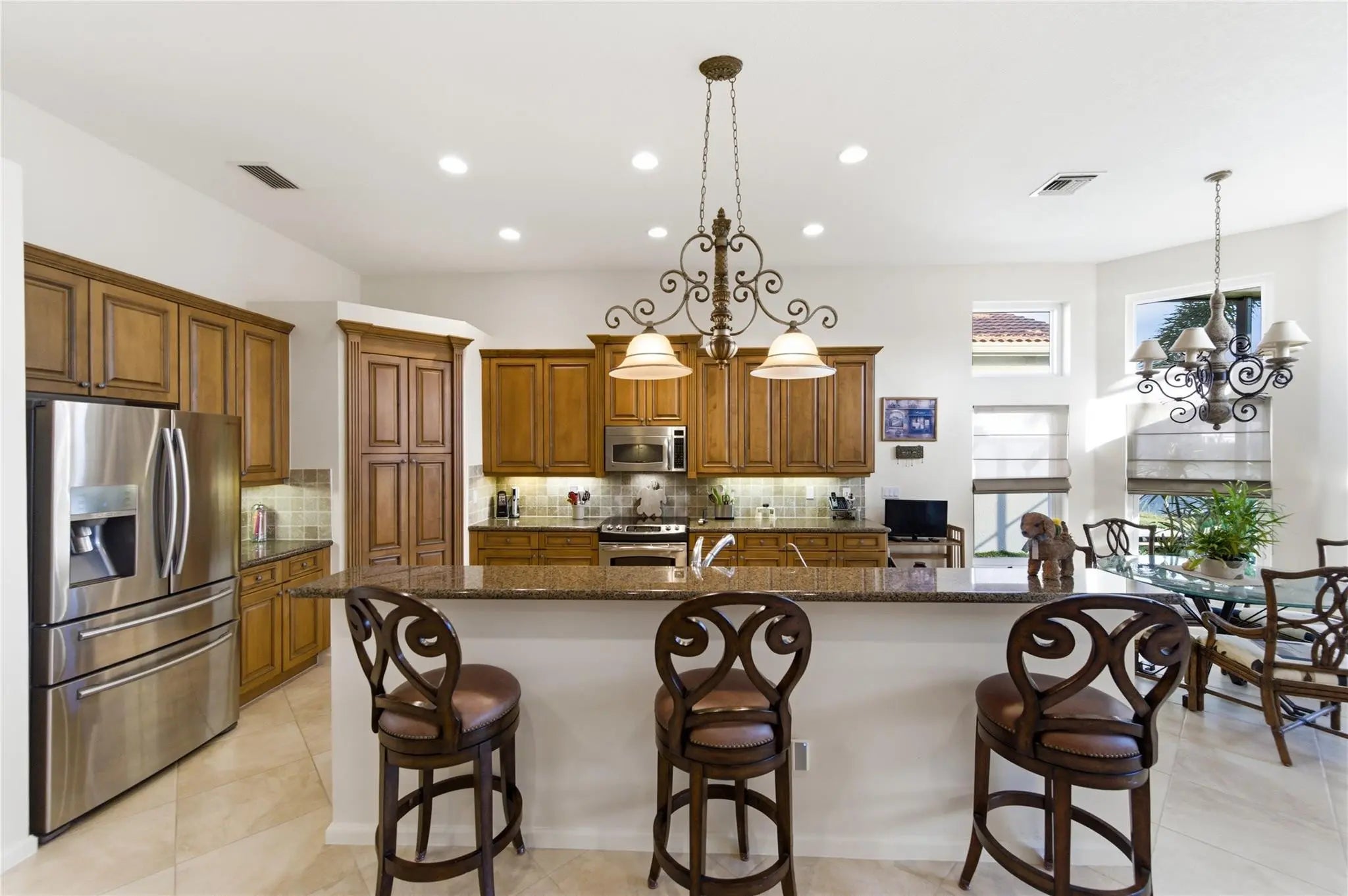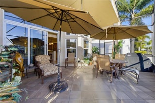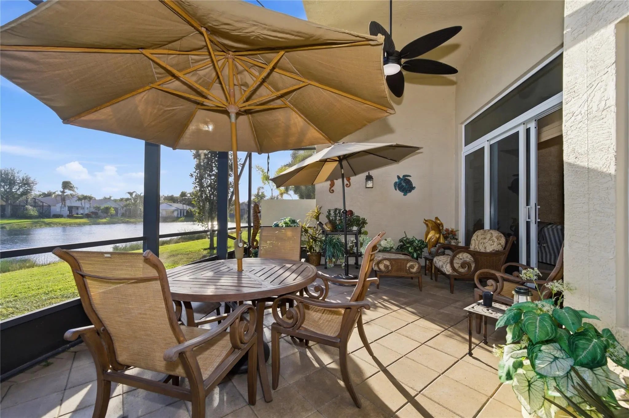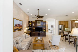 Welcome to 2321 sq ft of luxurious living in this 2 bedroom, 2.5 bath plus office/den. Freshly painted and enhanced with NEWLY INSTALLED IMPACT WINDOWS AND DOORS, this beautiful home offers both elegance and peace of mind. The spacious kitchen is a chef's delight, featuring solid wood cabinetry, convenient pull-out drawers, a walk-in pantry, and stunning granite countertops. The adjoining family room and breakfast area create the perfect setting for casual gatherings or relaxed everyday living. Step outside to your private tropical lanai and enjoy tranquil water views. The expansive primary suite offers generous walk-in closets and a large en-suite bath. The formal living room and Dining room allow further space for friendly gatherings.