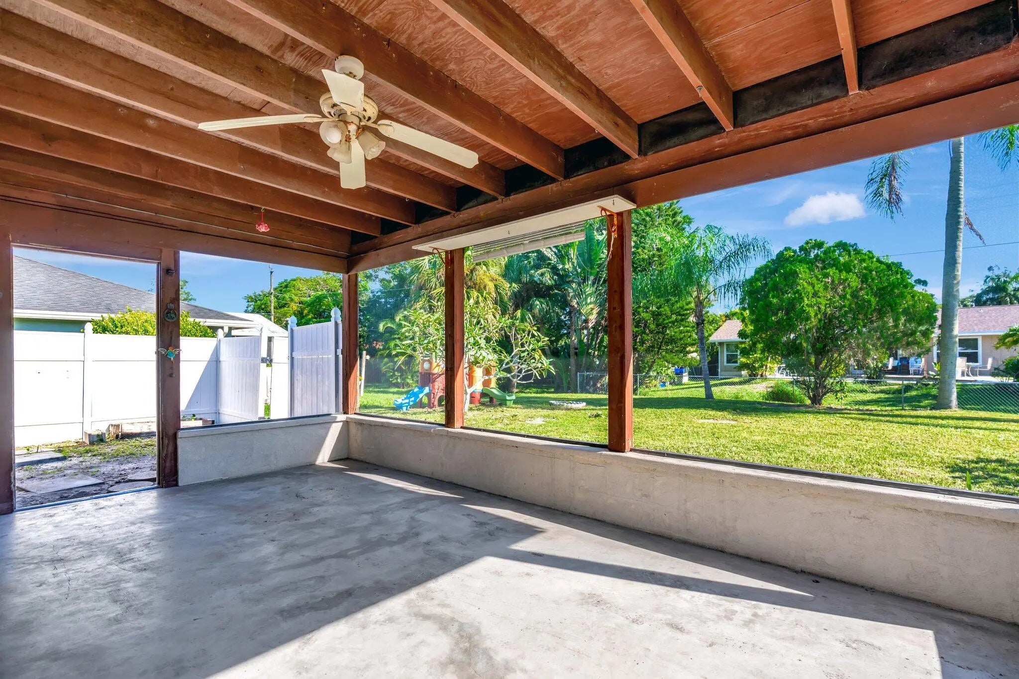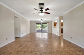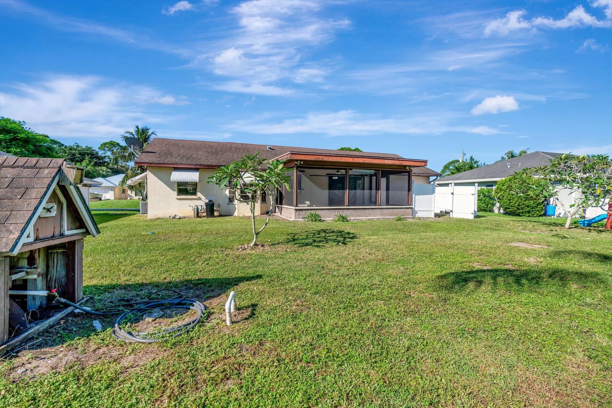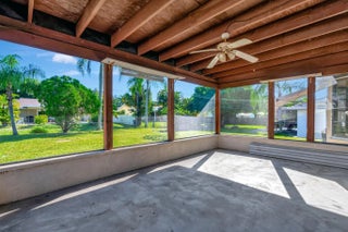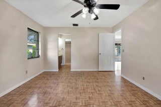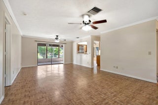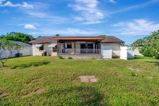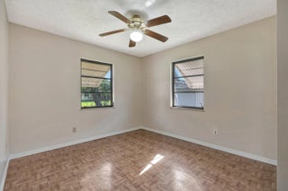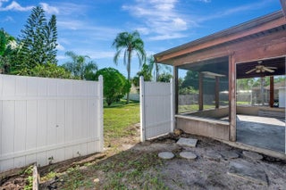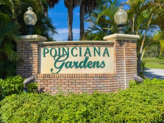 Sought after Poinciana Gardens! A two bedroom two bath split with 1,220sq ft of living space! This home is a wonderful family home with an eat in kitchen, stainless appliances, great room entrance opening up onto a newly screened in porch. The over sized primary bedroom has a huge walk in closet. A fresh coat of paint throughout the home, water softner system, and ceiling fans throughout, new garage door opener. Poinciana Gardens is a NO HOA community. Located close to all, shops, restaurants,Stuart, Jupiter, and I-95.