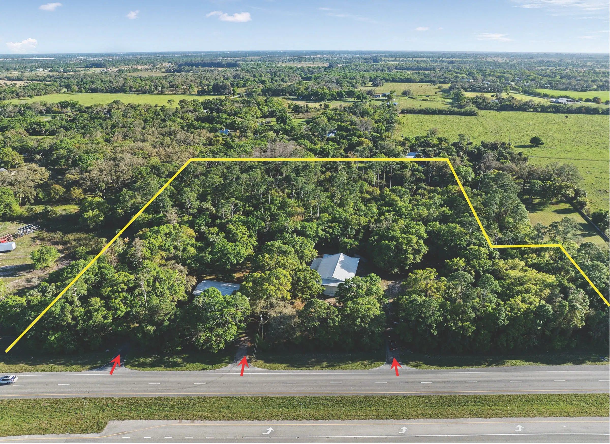 Home or Office plus versatile Shop building on wooded acreage. Mid-century CBS 3BR home with beautiful wood floors and large deck overlooking shaded yard of virgin oaks and pines. 3,344sf CBS Shop has four 18ft wide X 10ft high roll doors and 2,000sf concrete apron. Both have metal roofs. 3 driveways onto SR70 provide quick easy access to both I-95 & Turnpike. ~ Please see our BROCHURE for additional details ~