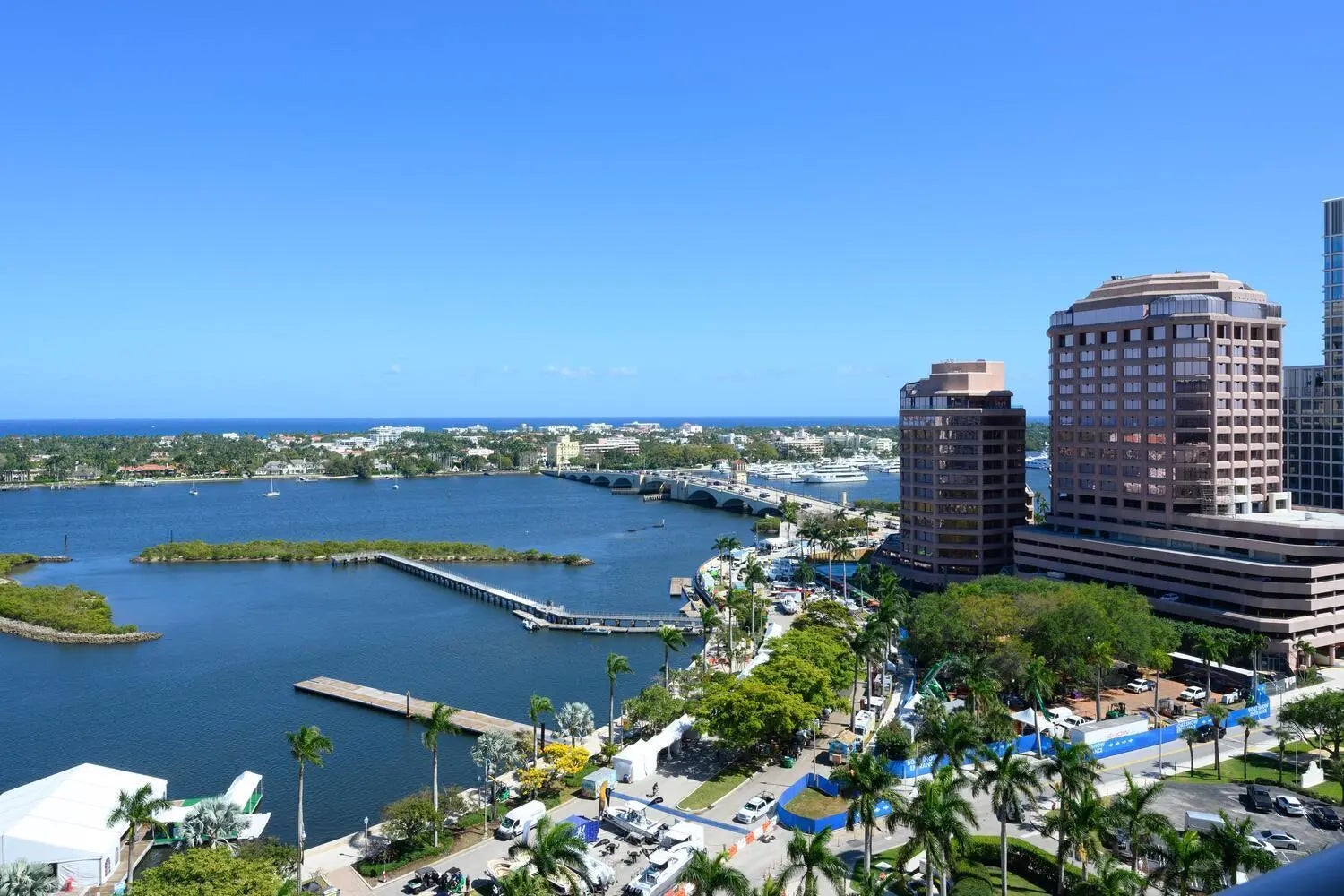 Exceptional opportunity to invest in the Plaza of the Palm Beaches. Two Bedroom, two bathrooms, over 1900 sq.ft. under air. Stunning views of the Ocean, Island of Palm Beach and Intracoastal Waterway. East and West exposures. Plenty of balcony space for outdoor dining. Full service, luxury building with 24-hour security, valet parking, concierge, two swimming pools, fitness room, conference room, and tennis court with pickleball. Pet friendly. Easy distance to all that the area has to offer: shops, restaurants, CityPlace, Kravis Center and Norton Museum of Art, ocean beaches and Palm Beach nightlife. Call today to preview this move-in ready residence. A must see.