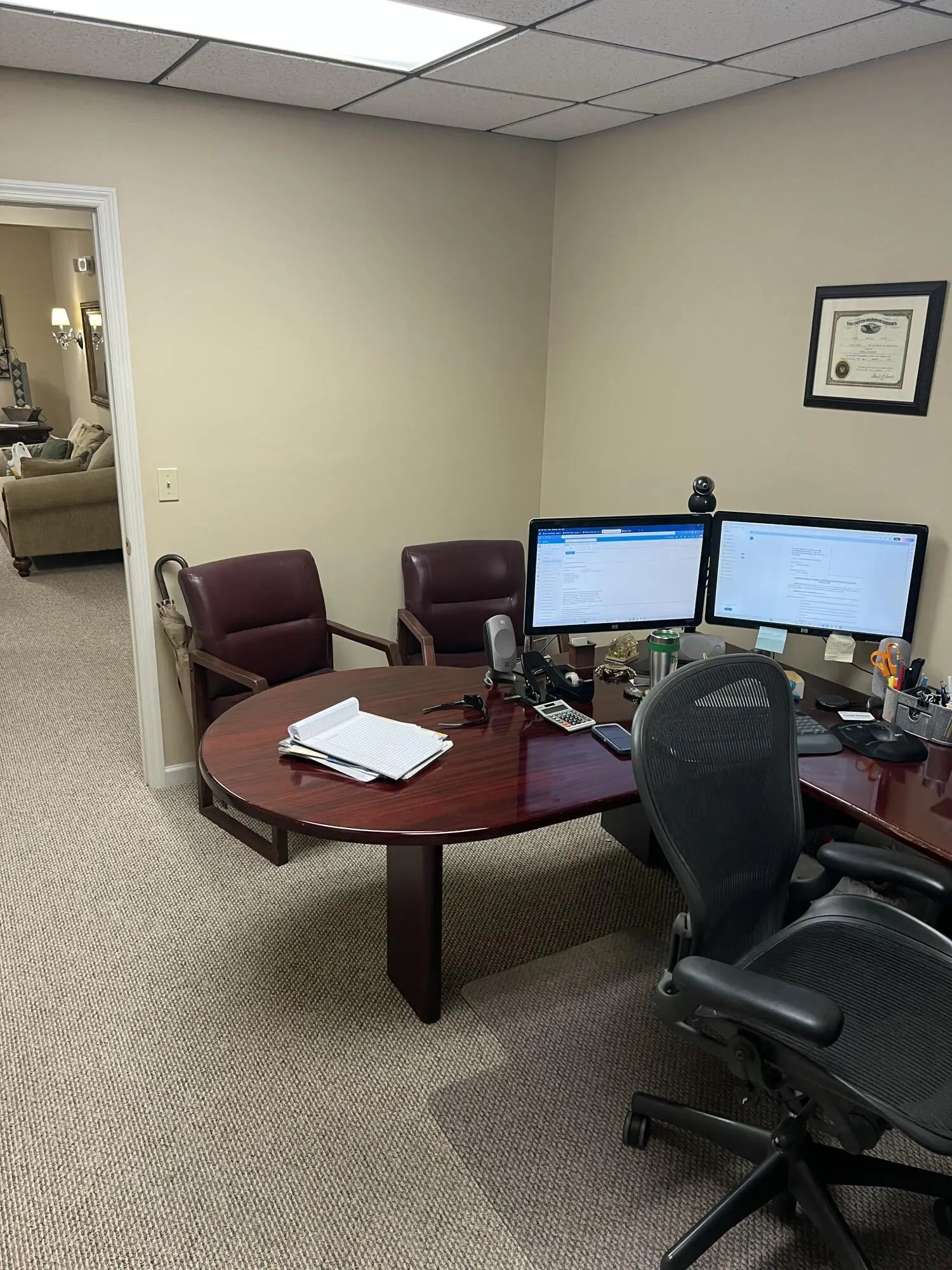 Welcome to your next office space — a beautifully appointed, second-story end-unit office condo offering 1,200 square feet of versatile workspace in the heart of downtown West Palm Beach. Overlooking a beautiful courtyard. This light-filled corner unit is located just one block from City Hall and two blocks from the Courthouse, making it an ideal location for attorneys, financial professionals, or any business seeking a prestigious downtown presence. The suite features three private offices, a dedicated conference room that comfortably seats eight, an open work area perfect for collaborative staff, two storage closets, and a welcoming reception area for clients. High ceilings throughout create a bright and spacious feel, while fresh paint and new carpeting provide a move-in-ready environment. Located in a professional courtyard-style building, tenants also have access to shared restrooms and a large communal conference room that seats up to 20 ideal for larger presentations or team meetings. With its unbeatable location, professional layout, and access to key downtown amenities, this office condo is an exceptional opportunity for any business ready to elevate its presence in West Palm Beach.