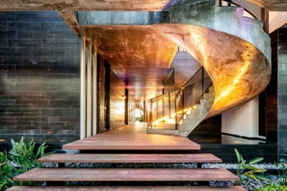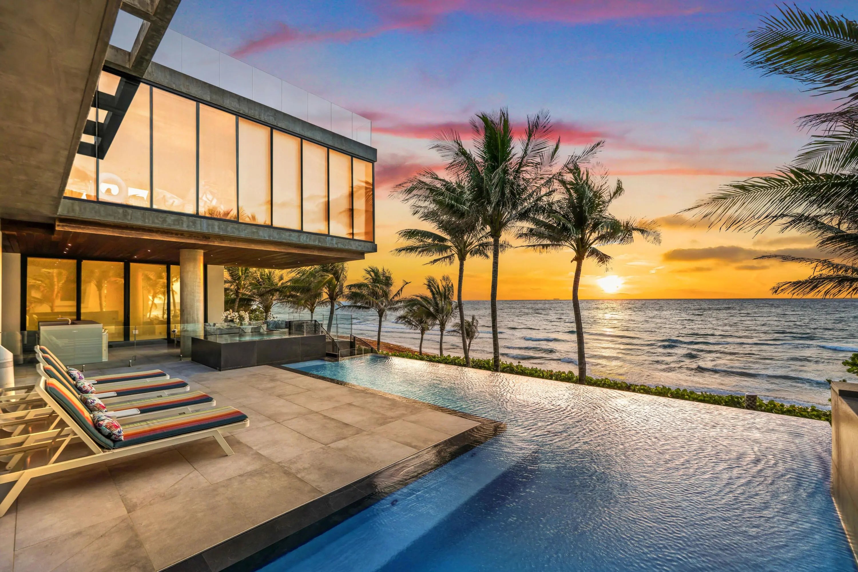 This exquisite custom-built oceanfront estate is a true masterpiece of modern luxury, designed to deliver a five-star resort lifestyle at home. Elevated 17 feet above sea level, it showcases 120 feet of direct ocean frontage and sweeping Atlantic views, offering a remarkable sense of exclusivity. Spanning four levels and over 15,000 total square feet, the residence includes seven bedrooms, seven bathrooms, and two powder rooms—each space thoughtfully designed for comfort and elegance. A garage for six vehicles, private elevator, and expansive multi-level terraces enhance both functionality and the connection to the coastal surroundings. A 3,000-square-foot rooftop sky terrace offers panoramic views, ideal for grand-scale entertaining or quiet relaxation. The second level features.. a striking infinity-edge pool and spa, seamlessly integrated into a fully renovated outdoor setting that maximizes views and tranquility. Inside, refined finishes elevate every detail: lava stone floors and walls, a dramatic 1,200-bottle illuminated wine wall, and a living green wall that brings a bold organic element to the interior. The open-concept main kitchen is built for entertaining and complemented by a full catering kitchen to accommodate your private chef or larger gathering. A private home theater and expansive, light-filled living spaces with refined architectural details offer both comfort and sophistication. The primary suite serves as a luxurious retreat, featuring a glass-enclosed office, gym, morning bar, and open-air Jacuzzi terrace. The spa-like marble bathroom offers dual vanities, soaking tub, and custom designer closets combining functionality with high-end style. An architecturally stunning outdoor staircase connects the pool level to a beachfront entertainment area, which includes a covered loggia, spacious beachfront turf-yard, and outdoor shower for effortless indoor-outdoor living. Mature palms, lush tropical foliage, and artfully designed landscaping create a serene, private coastal oasis. At night, exterior lighting and fire features transform the estate into a glowing sanctuary. Minutes from downtown Boca Raton, Delray Beach, and the Boca Raton Private Aviation Airport, this rare property is just 25 minutes from Palm Beach Island, home to world-class shopping and dining. This exceptional estate exemplifies refined oceanfront living, offering unmatched privacy, sophistication, and lifestyle to the most discerning ultra-luxury buyer.