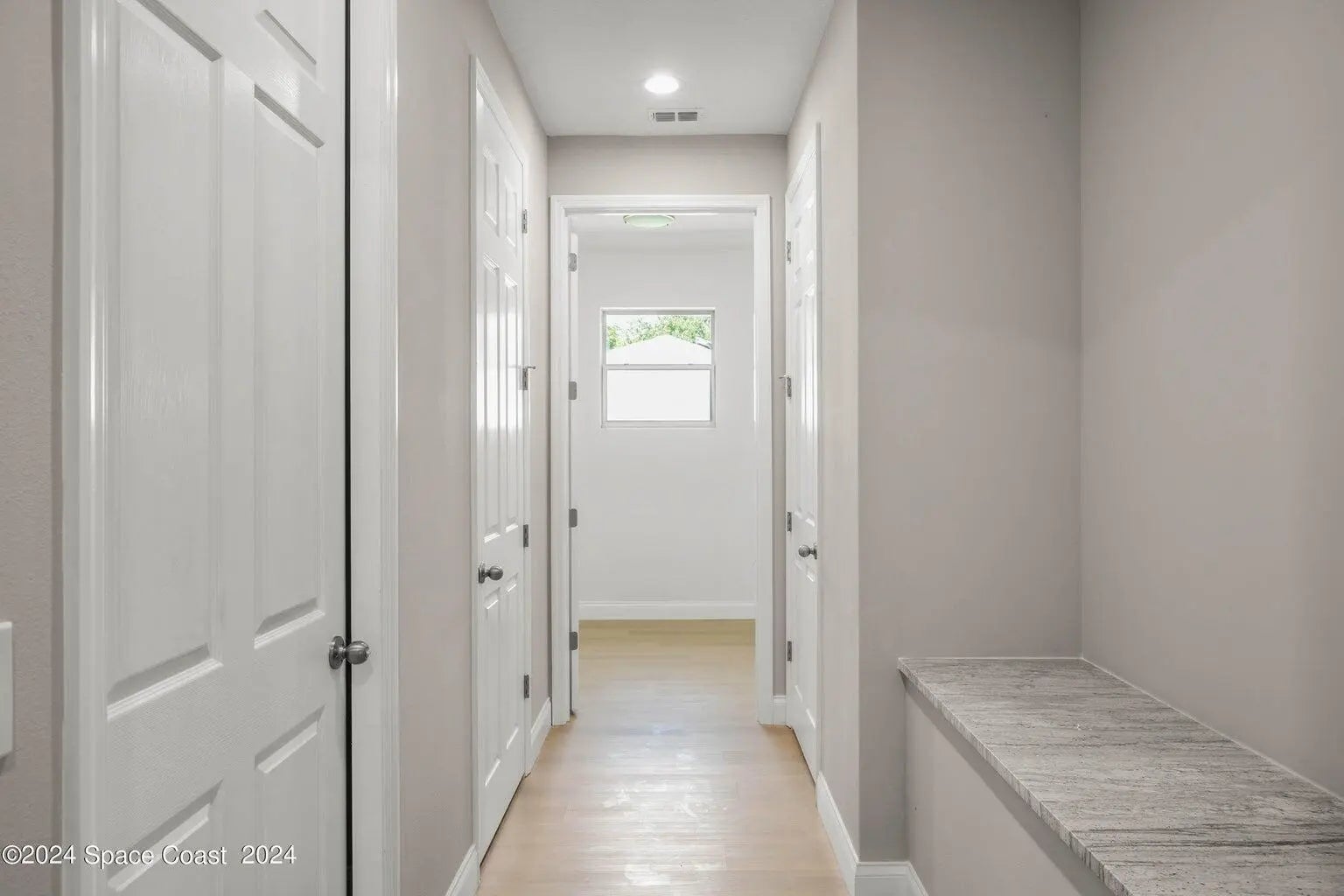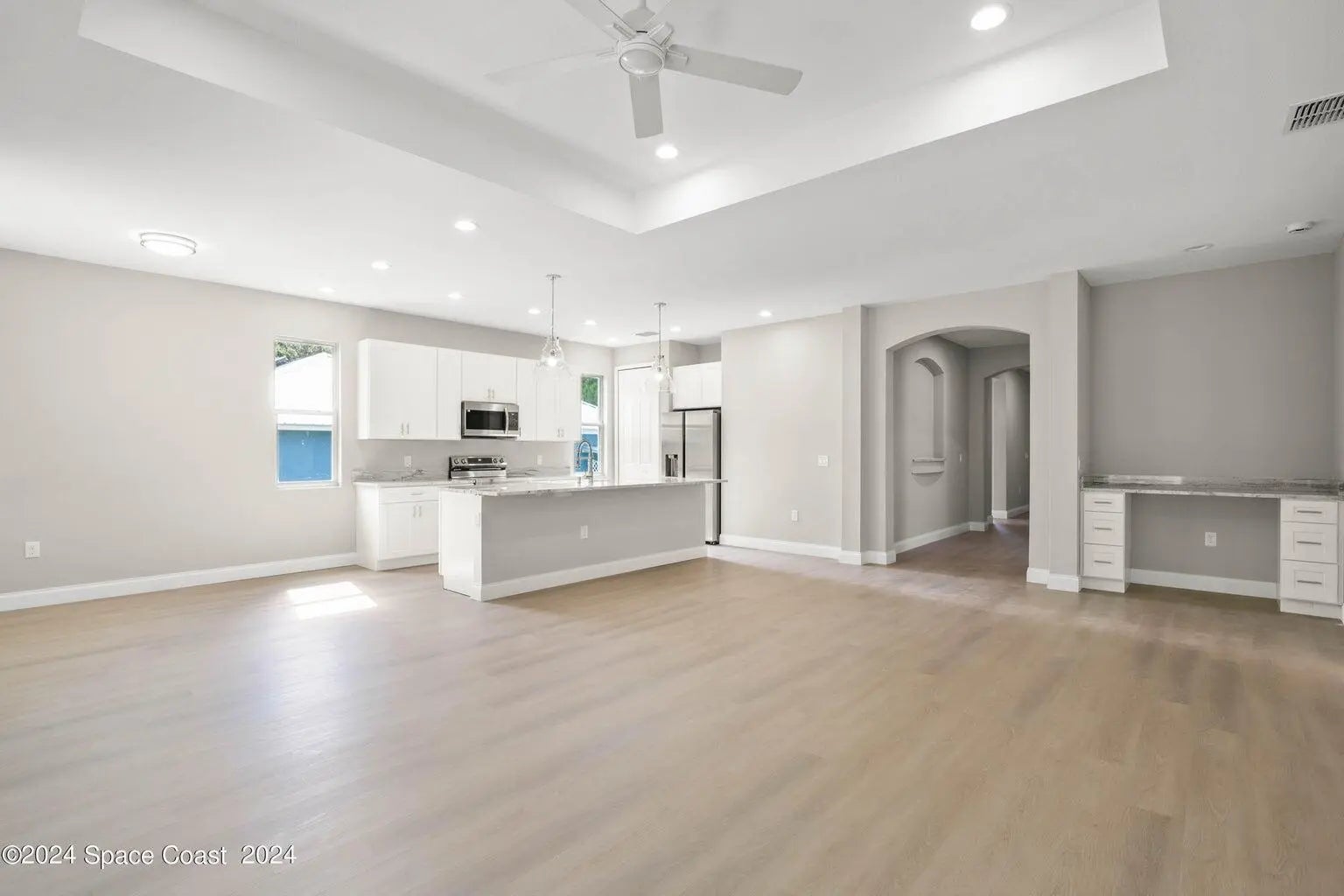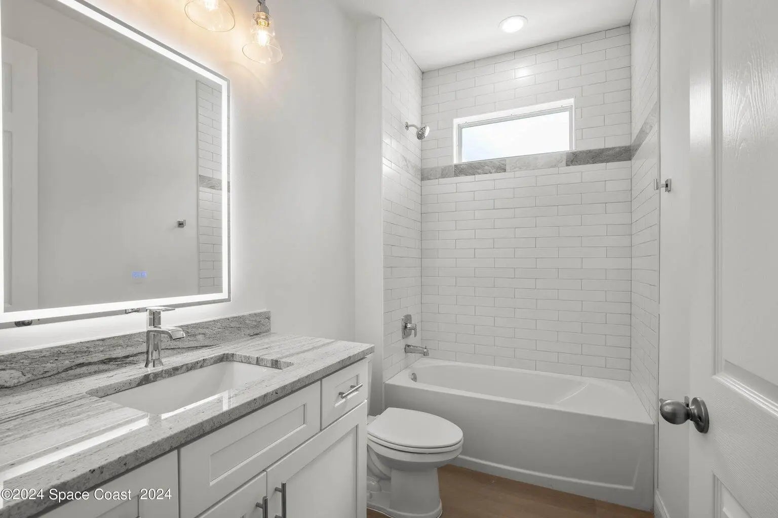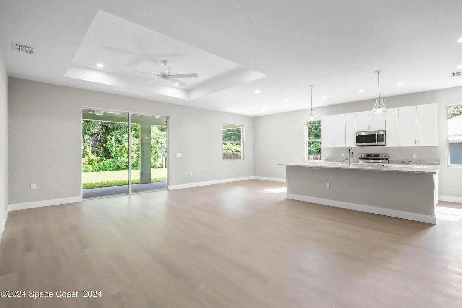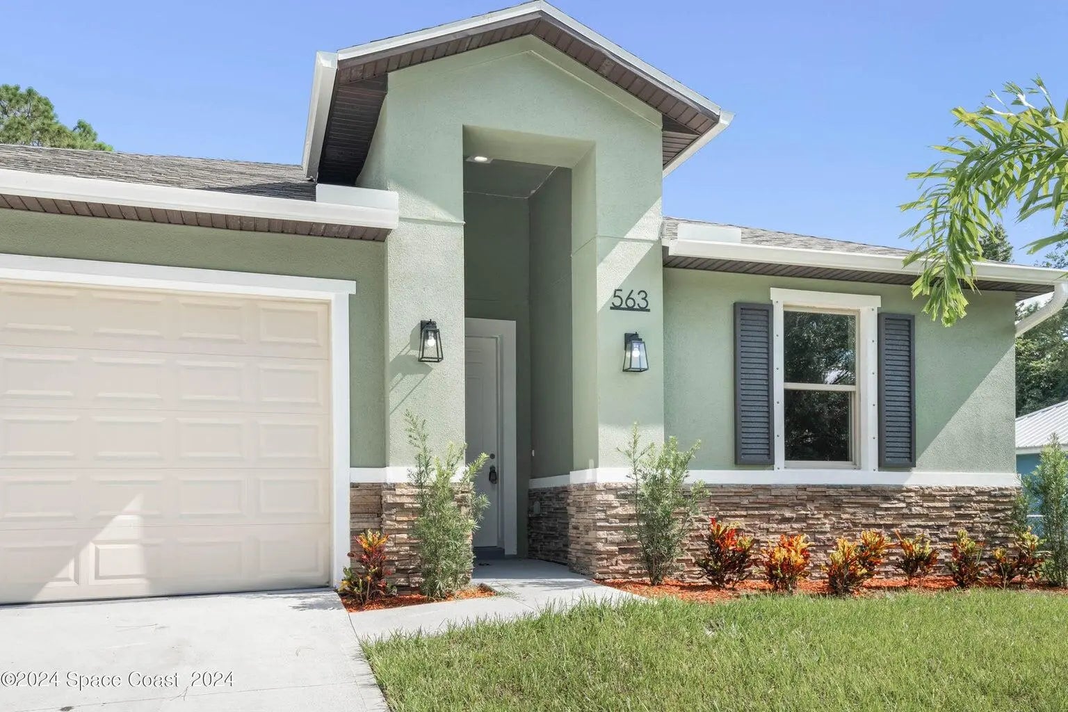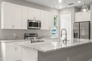 New Construction. Photos are of like model and are used for display purposes only. This Luxurious 3-bedroom, 2.5 Bath Property is exquisitely built with all of the upgrades nestled in the heart of Palm Bay. Inside you will find a wonderfully open floor plan gatherings and entertaining. The capacious Chef's Kitchen is stylishly equipped with a prep island, solid wood cabinets, stainless steel appliances and ample storage. The contemporary living space is bursting with natural light and a flowing layout that is inviting and relaxing. Luxuriate in the vast Primary Suite that offers a collection of modern conveniences. This beautiful house is full of INCLUDED upgrades: solid wood soft close cabinets in the kitchen and in the bathrooms, luxury vinyl plank flooring (no carpet tiled bathroom floors and floor-to-ceiling tiles in the showers, bathroom niches, granite countertops in the kitchen and baths, 9'4'' ceilings, 8-foot doors, luxury handles and electric garage.