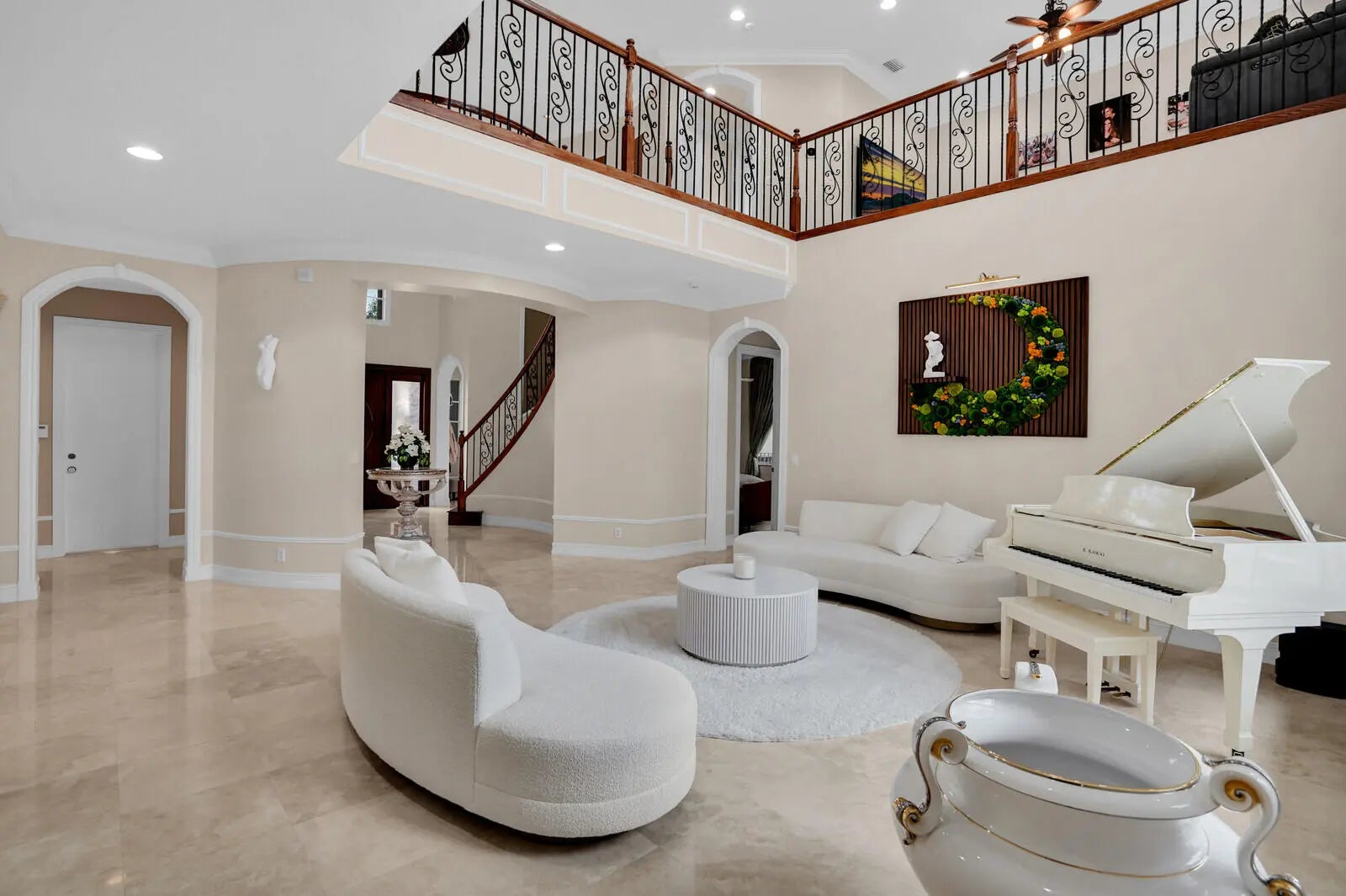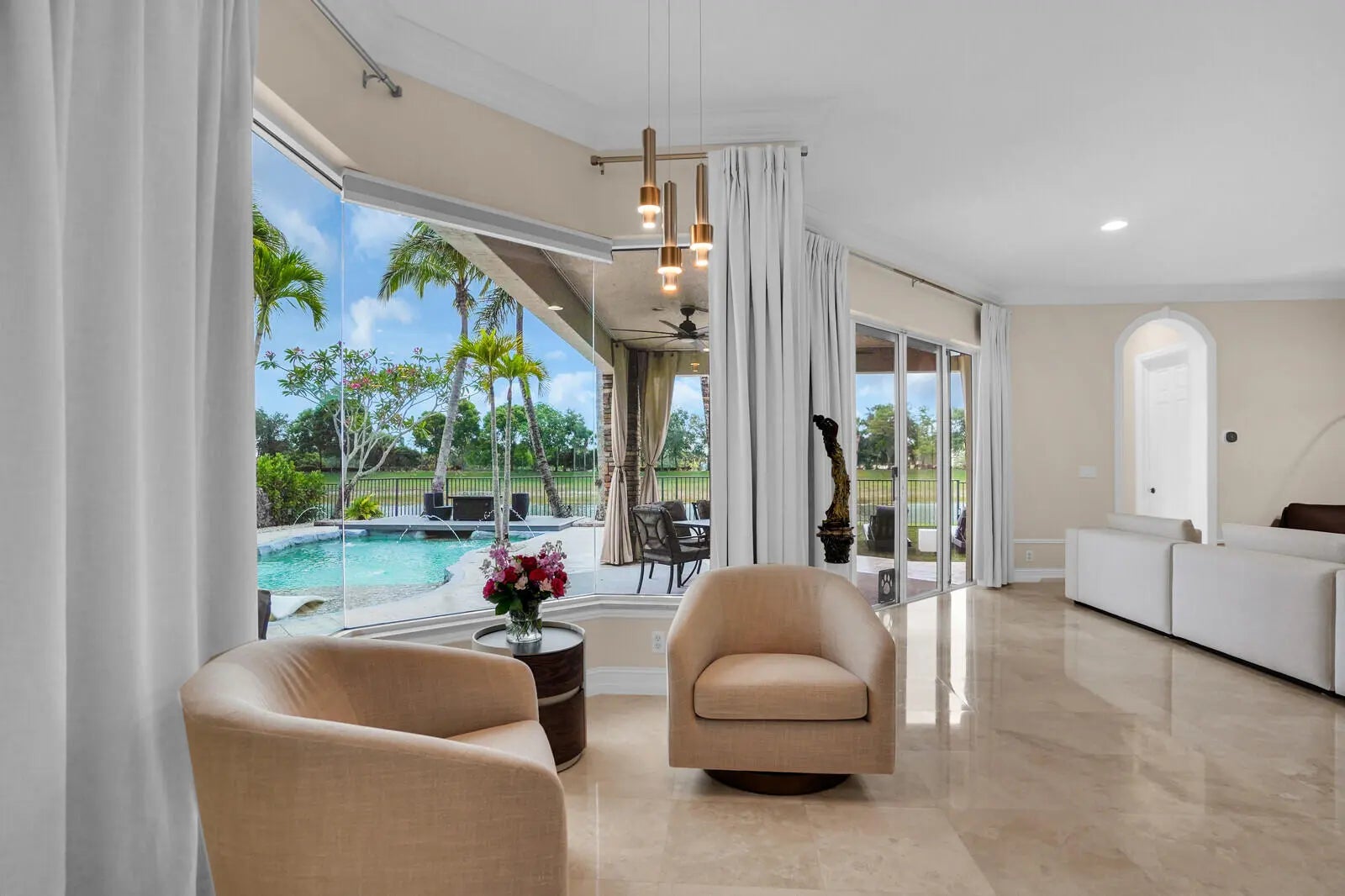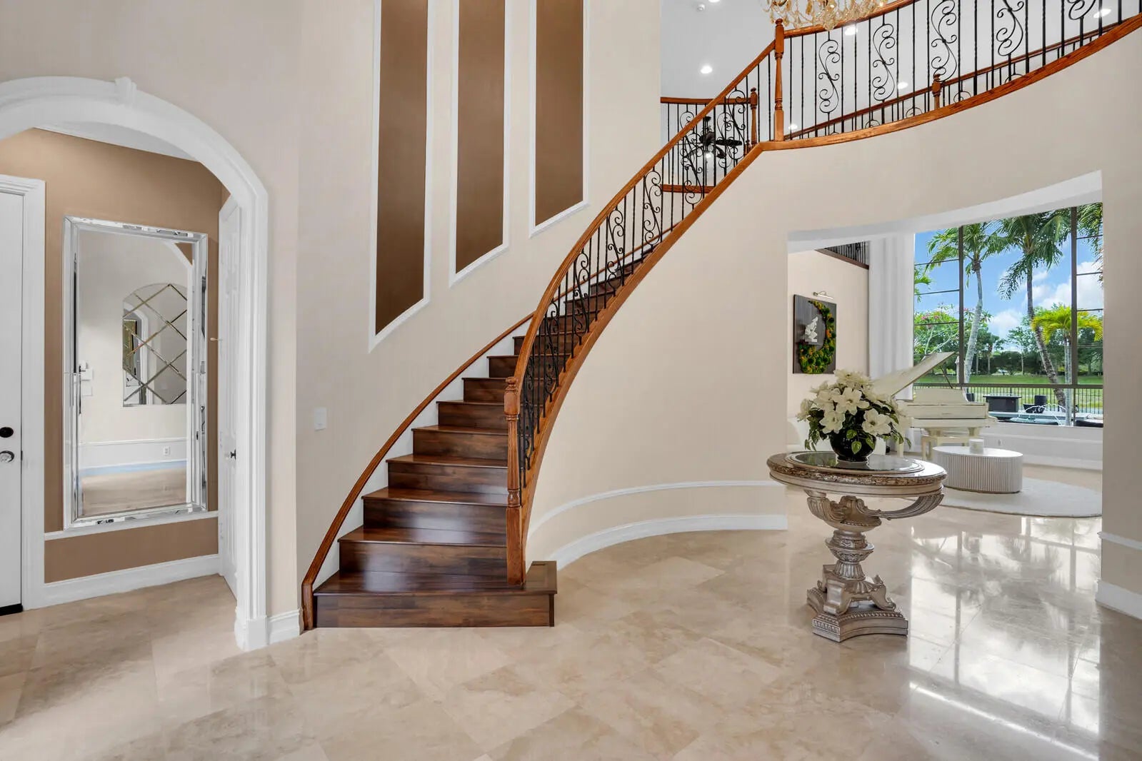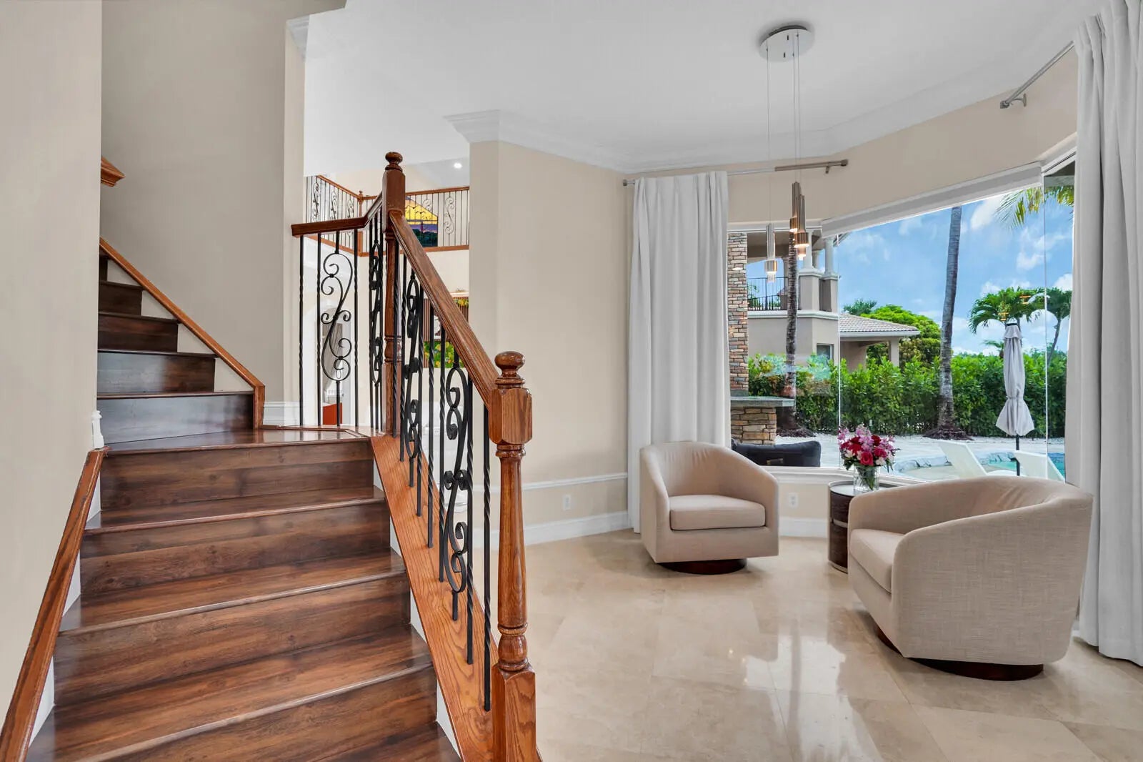 Welcome to the highly coveted, guard-gated enclave of Wellington View, an elegant lakefront estate that seamlessly blends timeless architectural design with luxurious modern enhancements. This distinguished residence is a statement in refined living, serene water views, and exceptional craftsmanship throughout. A grand double door entry with decorative glass sidelights opens to a dramatic two-story foyer, where a sweeping wrought iron & wood staircase sets the tone for the home's sophisticated interior. Marble floors on the main level and rich hardwood upstairs create a warm, luxurious ambiance, enhanced by custom millwork and thoughtful architectural details at every turn. Designed for the most discerning chef and entertainer, the gourmet kitchen is a showpiece, featuring upgraded ... cabinetry, granite countertops, premium stainless-steel appliances, a 180-bottle wine cooler, and an integrated water filtration system. The open concept living areas flow effortlessly, providing an ideal backdrop for elegant entertaining or relaxed everyday living, all while capturing tranquil lake vistas. The expansive primary suite is a private retreat, complete with a tray ceiling, spa inspired bathroom, and custom-designed walk-in wardrobe systems with elegant built-in cabinetry and display features. French doors lead to a secluded balcony where panoramic lake views offer the perfect start and end to your day. The ensuite bath pampers with a jetted soaking tub, oversized frameless glass shower, and dual granite vanities. Step outside into your own resort style oasis. The professionally landscaped backyard features a custom outdoor kitchen with granite countertops, lush tropical foliage, and a saltwater pool with sun shelf, travertine decking, and a raised lounge platform ideal for sun-soaked afternoons or evening gatherings under the stars. The landscape is beautifully illuminated at night with custom lighting, creating a magical ambiance and highlighting the property's elegant exterior and serene waterfront setting. Recent upgrades include a newer pool heater, a new pool pump motor, and a state-of-the-art salt system for seamless, low maintenance enjoyment. Additional appointments include high-efficiency A/C units installed in 2020, each equipped with advanced UV purification systems to ensure optimal indoor air quality and climate comfort. With a stunning fieldstone-accented façade and exceptional curb appeal, 718 Edgebrook offers a rare opportunity to own a home that blends privacy, prestige, and convenience in the highly sought-after, gated community of Wellington View. Built by renowned luxury homebuilder Toll Brothers, this elegant estate is ideally located just minutes from Wellington's world-class equestrian venues, championship golf courses, fine dining, upscale shopping, top-rated hospitals, and the Wellington Green Mall. Residents enjoy exclusive access to a host of premium amenities including a clubhouse, fitness center, tennis, pickleball and basketball courts, a tot lot, scenic walking trails, and serene lake views. Wellington View offers a 24-hour manned gate for security, beautifully maintained surroundings, and low HOA fees that include basic cable and monthly alarm monitoring. Its central location in Palm Beach County places you within a short drive of CityPlace, Palm Beach International Airport, Palm Beach Gardens, Boca Raton, and Delray Beachmaking this one of the most desirable addresses in the area.