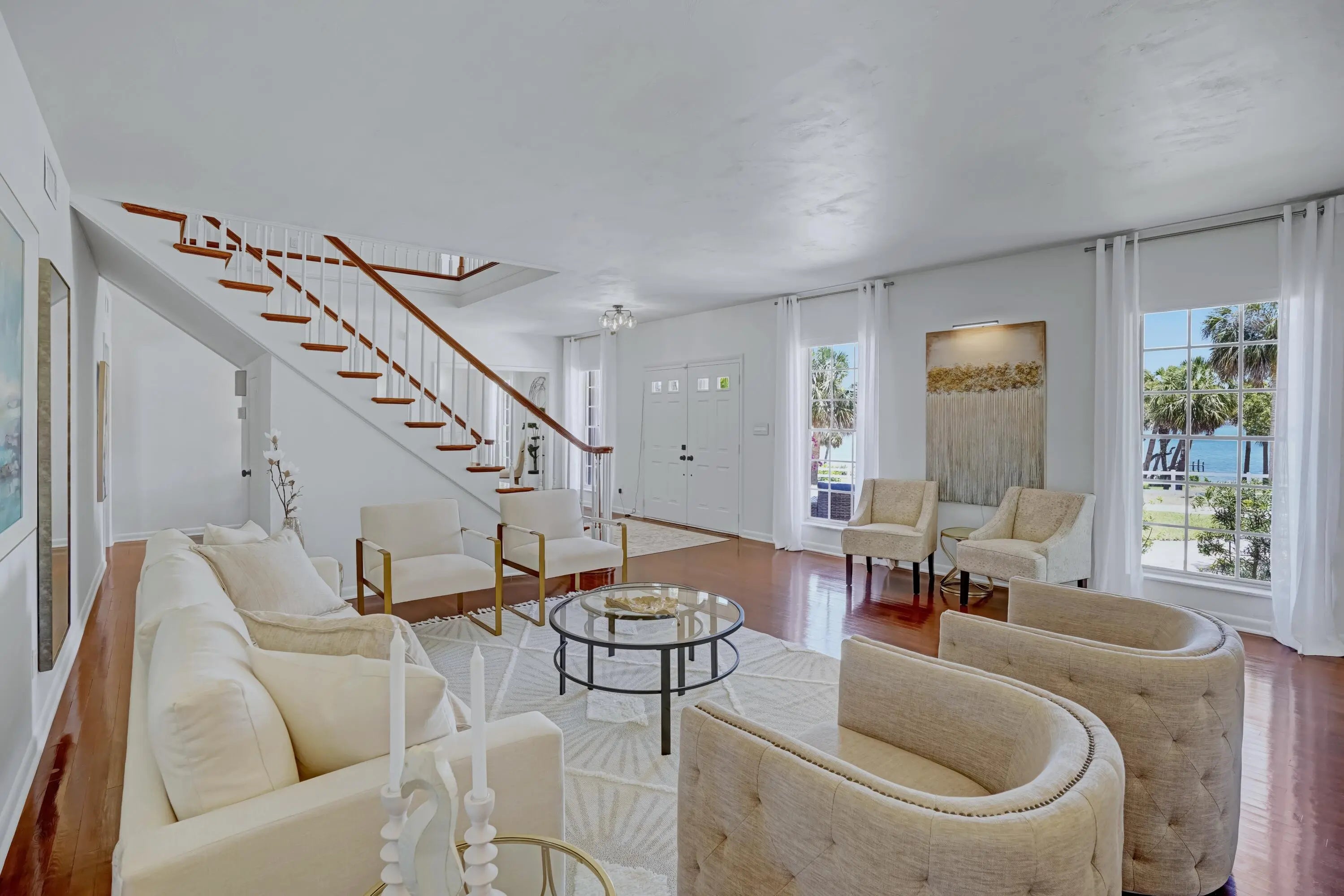 If you have been thinking about it, Now Is The Time! Exceptional Opportunity, Originally 2.5M. Captivating High Elevation Wide Water Intracoastal Trophy Estate. All New Furnishings & Decor INCLUDED! Must See, Shows More Like a Model. LOCATION, LOCATION & ELEVATION. One-of-a-Kind, Palm Shadows on the River Ridge, Wide Water Ocean Access Estate High Atop the Indian River Lagoon Intracoastal Waterway. One of the most Prominent Long-Admired Estate Homes on ''The River Drive''. Character, History & Grandeur with a Goldilocks Property and a survey verified FOUR STOREY (40FT) Ground Floor Elevation. CONCRETE BLOCK Construction UPPER & LOWER. Thoughtfully designed to Entertain Family & Friends in Stately Elegance. Total 6 Bedrooms & 5 1/2 Baths Incl 4 Beds and 3 Full Baths Upper Level & 2 Lower Level Beds each with Full Baths, Plus Lower Half Bath. ''The River" and Atlantic Ocean is your playground, World Class Salt water Fishing, Pleasure Boating, Sailing, Diving, Paddleboarding, Kayaking, jet ski-ing, waterskiing/wakeboarding, windsurfing/kite surfing, lobstering or just watch the boats pass by. Stunning Moon Rises reflecting across nearly 2 Mile Wide Intracoastal. Only about 4.3 Nautical Miles to Ft Pierce Ocean Inlet, one of the Top Inlets in the State pouring beautiful blue green Atlantic Ocean water into the Lagoon. Permit For Dockw/2BoatLifts Obtained. Phenomenal High Elevation Wide Water Estate Property. One of the highest elevation properties on the River Drive. One of the choicest locations on the River Drive. Nearly 160ft of River-Frontage with Riparian water rights, you own the river-side. 1.56 Acres Total with plenty of room for many of possibilities. Commanding Wide Water Views with Fresh Atlantic Ocean Air. Rare Big Water High Elevation Coastal Real Estate. Enjoy Regal Waterfront living without the high flood risk, no flood insurance required. No HOA, No City Taxes. Ideal Central Treasure Coast Location, Close to an abundance of Highly Rated Destinations, Convenient I-95 Interstate Access Via Midway Rd, Easy Access to Historic Downtown Ft Pierce, Jensen, Stuart and Vero Beach. Distinctive Waterfront with Neo Classical Inspired Architecture adorned with a Columned Portico rising memorably above the registered scenic route. 4,263sqft - Original Under-Air Square Footage, Beautiful Hardwood Floors, Grand Staircase, Many Updates and Upgrades. Fully Furnished, ALL BRAND NEW Furnishings & Decor INCLUDED. New Roof late 2015 nailed up to code with Secondary Water Barrier peel and stick underlayment, has strapped trusses. All NEW Bathrooms in 2021 including custom tiled showers with Moen Valves & Fixtures, separate integrated selectable hand showers and frameless glass sliding showerdoors, All Attic Spaces fully cleaned out and sealed with New Blown-In Insulation and New AC Ductwork in 2021. All new septic system in 2021 w/new tank and 700sqft Infiltrator drain-field (oversized for 6bed 5.5bath). New private water well in 2020. Owned water filtration equipment. (Not reliant on municipal utilities for fresh water or waste water treatment.) Over Code Hurricane Impact Garage Door, Impact Kitchen & Bathroom Windows, Every other door and window has storm protection shutters. Upgraded Main Electrical Service in 2017 with new main panel and breakers, Upgraded New Sub Panel and Breakers in 2020. All new electricalfixtures and outlets since 2021 all outlets inspected and correct, All new plumbingfixtures sinks, tubs, faucets, etc. since 2021, Leathered Quartzite kit ctops, custom kitchen tile and LED lighting 2021. Both AC inside and outside units replaced 2017. Tankless Water heater 2017, New secondary tank water heater 2021 50Amp RV Electric Hook Up. Full Interior and Exterior Painting with waterproofing since 2021 & MORE! UPPER & LOWER CONCRETE BLOCK Construction, strapped trusses, secondary waterbarrier, high coastal elevation saves on homeowners and No Flood Insurance Required! All NEW Furnishings & Decor 2025 INCLUDED. Any information provided deemed to be reliable but not guaranteed to be free of errors or omissions. Listing Agent Owner.