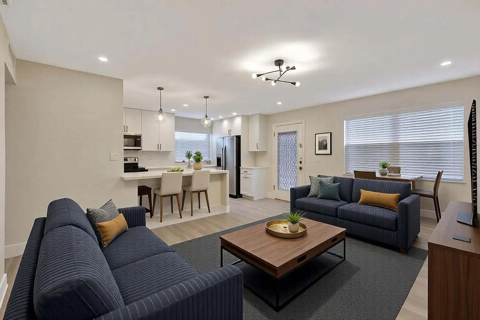 Discover the ultimate in luxury living at 802 Burgundy Q, a stunning 2nd-floor designer condo located in the exclusive 55+ community of Kings Point Golf & Country Club. This completely updated unit offers the perfect combination of modern style and comfort, just steps away from the Burgundy Satellite Pool. As you enter, you'll be greeted by serene garden views and an abundance of natural light that flows through the spacious open-concept living areas. The entire condo features waterproof laminate flooring, providing both beauty and durability. Freshly painted in neutral tones, the space feels bright and inviting. The chef-inspired kitchen boasts striking quartz countertops with a waterfall edge, complemented by sleek white shaker cabinets and top-of-the- line stainless steel appliances. Additional cabinets provide ample storage, and the open layout is ideal for entertaining guests or enjoying everyday meals in style. The new recessed lighting, modern fixtures, and updated switches elevate the contemporary design throughout. Both bathrooms have been fully updated with stylish tile work, including a shower/tub combo and new vanities with modern fixtures. The master suite is a true retreat, featuring a large walk-in closet and a beautifully tiled shower with a glass shower door. Enjoy your morning coffee or evening relaxation in the spacious, enclosed patio, which includes a convenient laundry/utility closet with a full-size washer and dryer. Located in the sought-after Kings Point Golf & Country Club, this condo offers access to a wealth of amenities, including golf, tennis, and a range of social activities. Whether you're looking to unwind or stay active, this community offers the perfect environment for a vibrant lifestyle. Don't miss the opportunity to make this meticulously updated condo your ownschedule a tour today!
