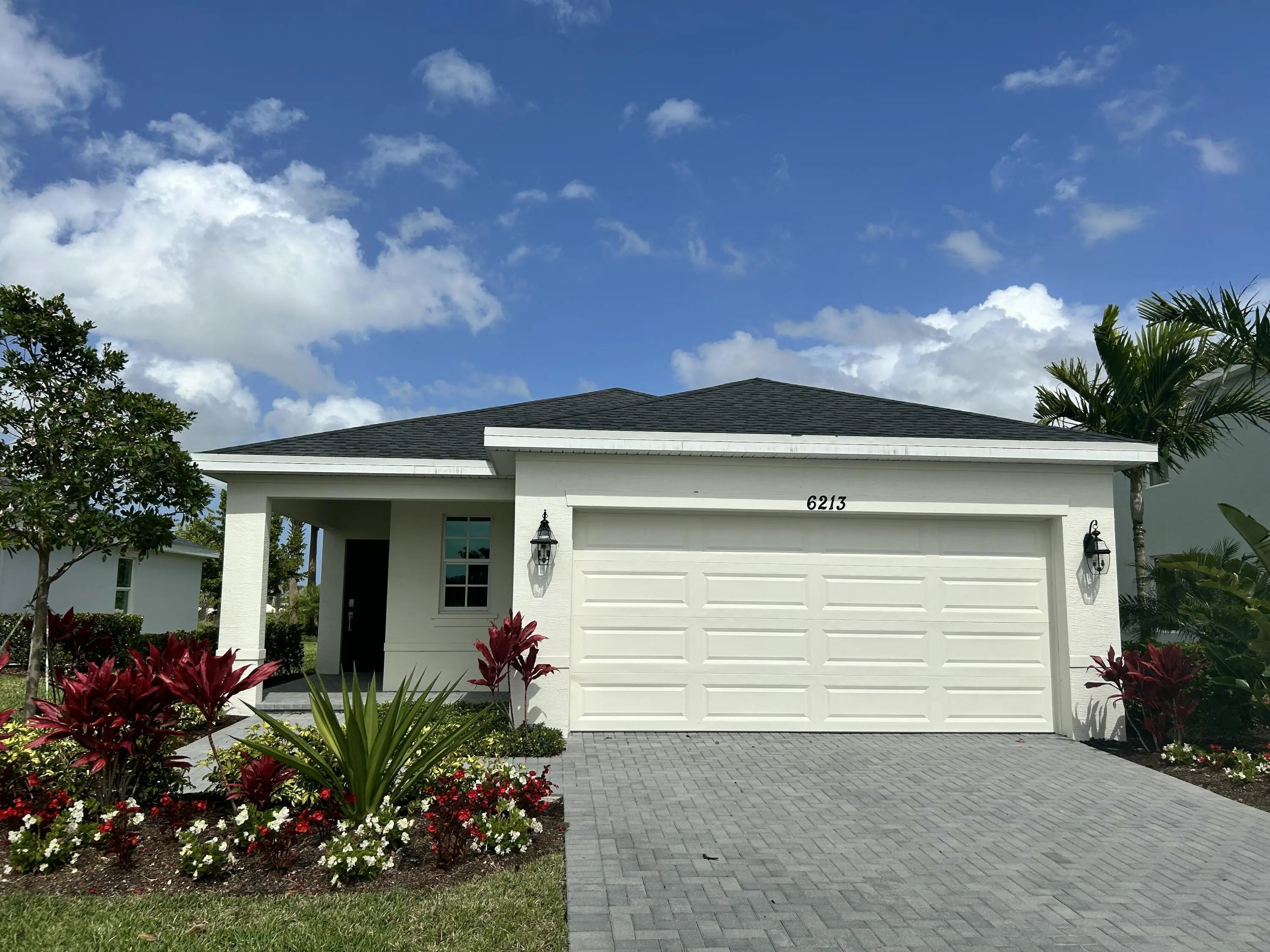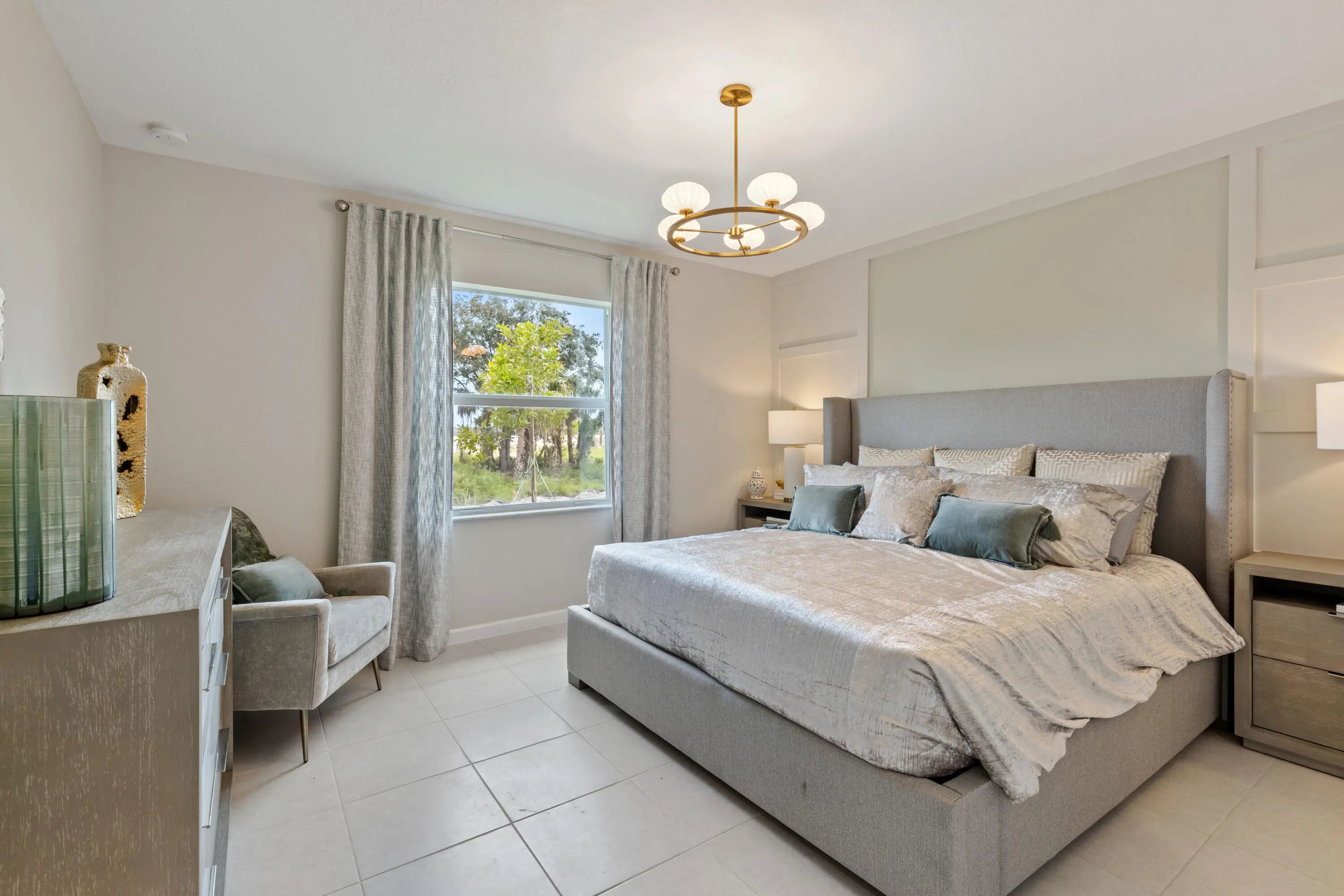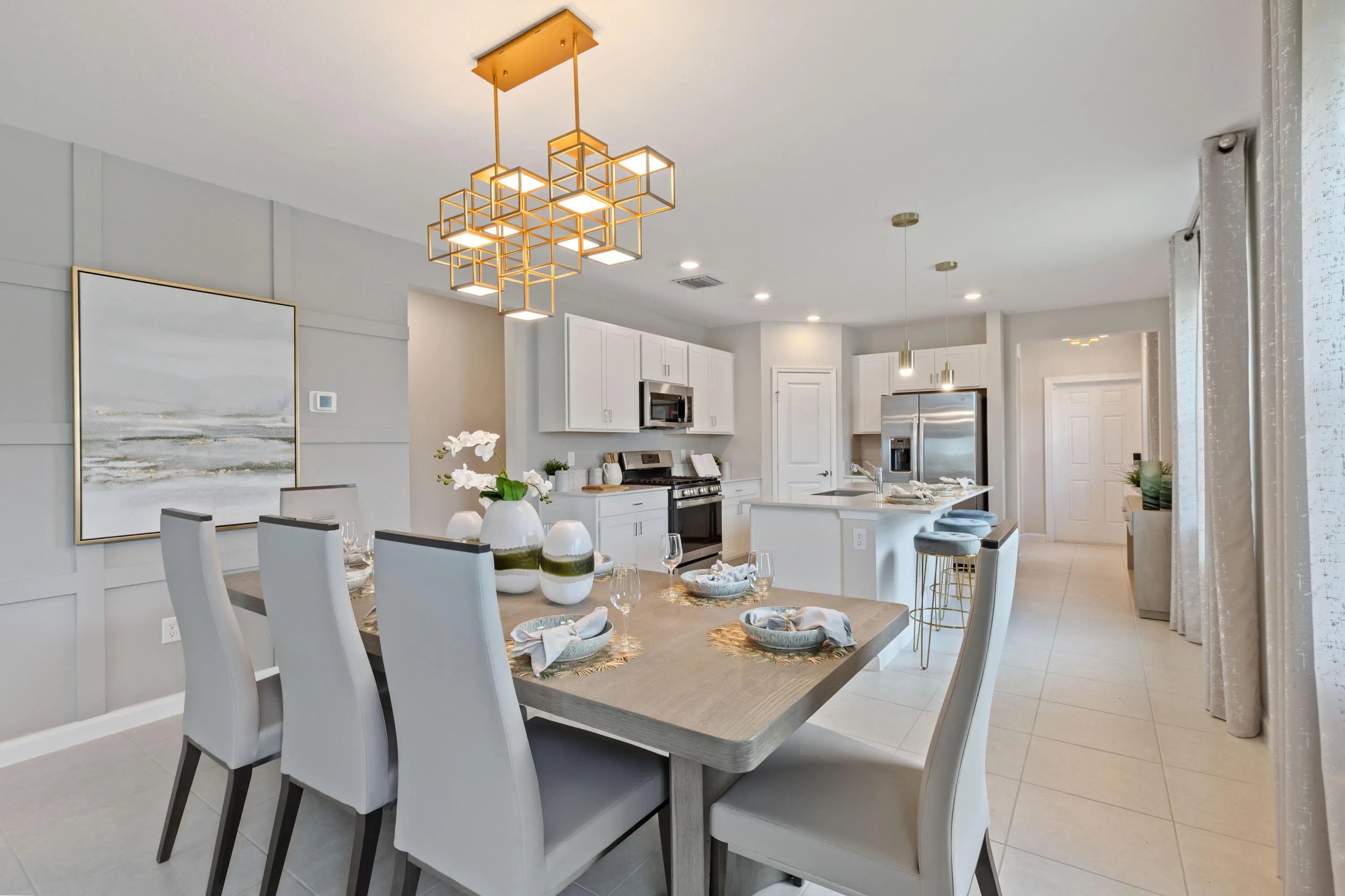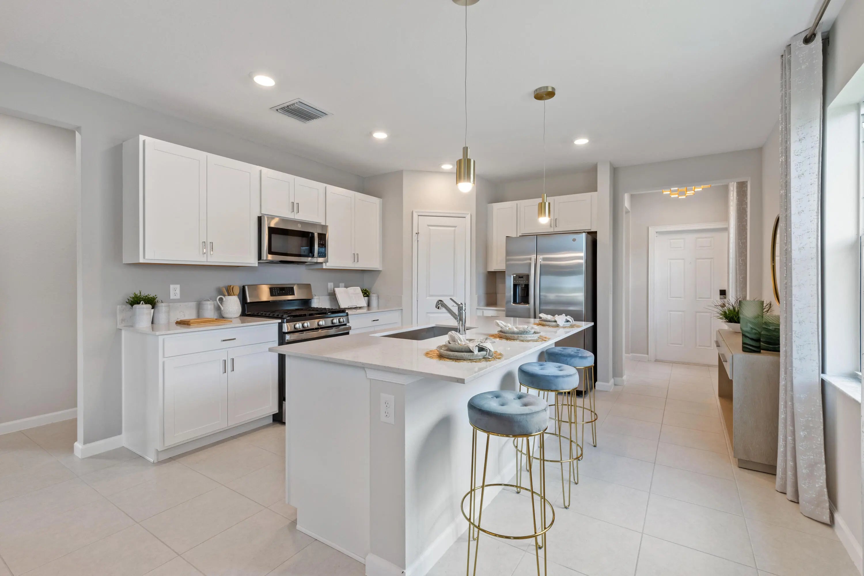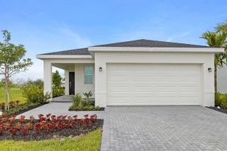This single-story home features a smart layout that prioritizes ease of living. Down by the foyer is an open-plan design shared by the kitchen with a center island, dining room and family room, which extends out to the covered lanai. On the opposite side of the home are two bedrooms to provide a restful retreat and a den well-suited for as a private office. At the front is a versatile two-car garage. Photos are for illustrative purposes only.