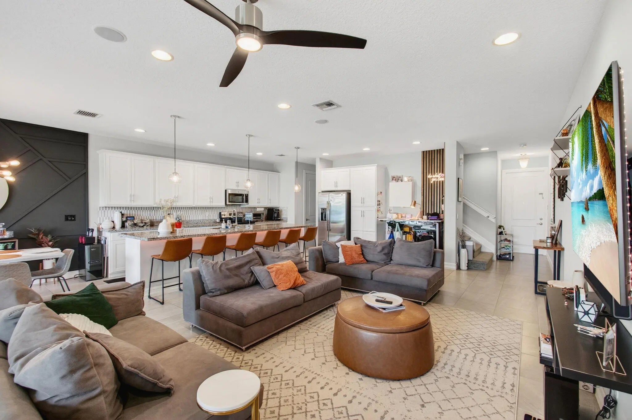 2.25% ASSUMABLE FHA LOAN on This beautifully maintained 3-bed, 2.5-bath townhome with OVER 2,200 LIV SQ FT of thoughtfully designed living space with CEILING SPEAKERS for ambient or home theatre sound. Enjoy a BRIGHT, open layout with great natural light, stylish finishes, and a spacious kitchen, REVERSE OSMOSIS system for filtered drinking/cooking water, a large island and ample cabinetry. Upstairs features a huge master bedroom, two additional bedrooms, a laundry room, and a versatile landing—perfect for a desk, reading nook, or play area. BUILT IN 2019 with impact windows, a 2-car garage, and plenty of storage. Located in a community with walking paths and convenient access to shopping, dining, and the Turnpike, Dont Miss Out!