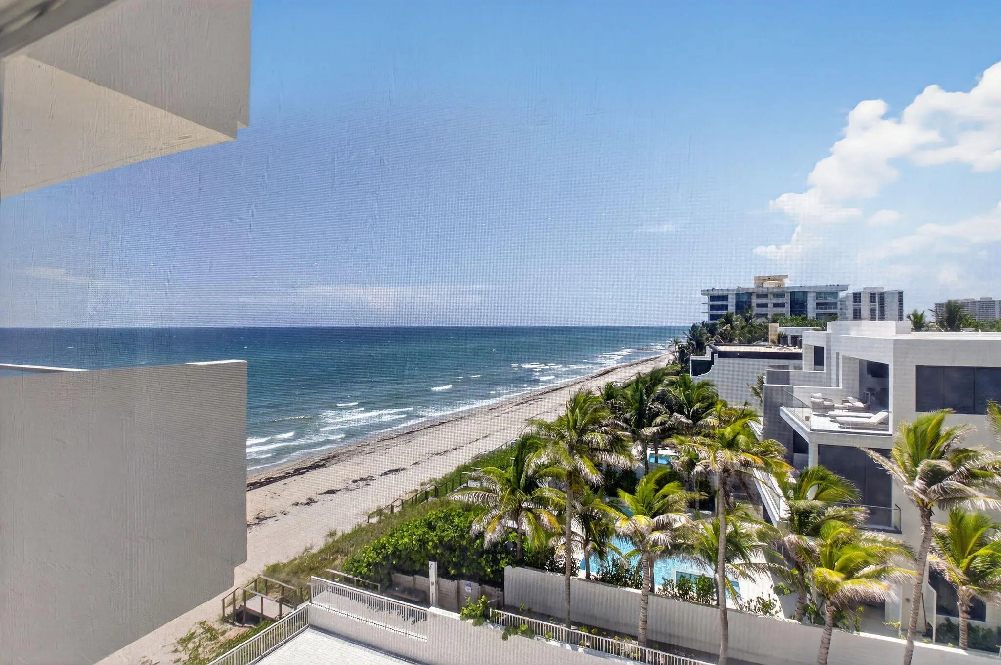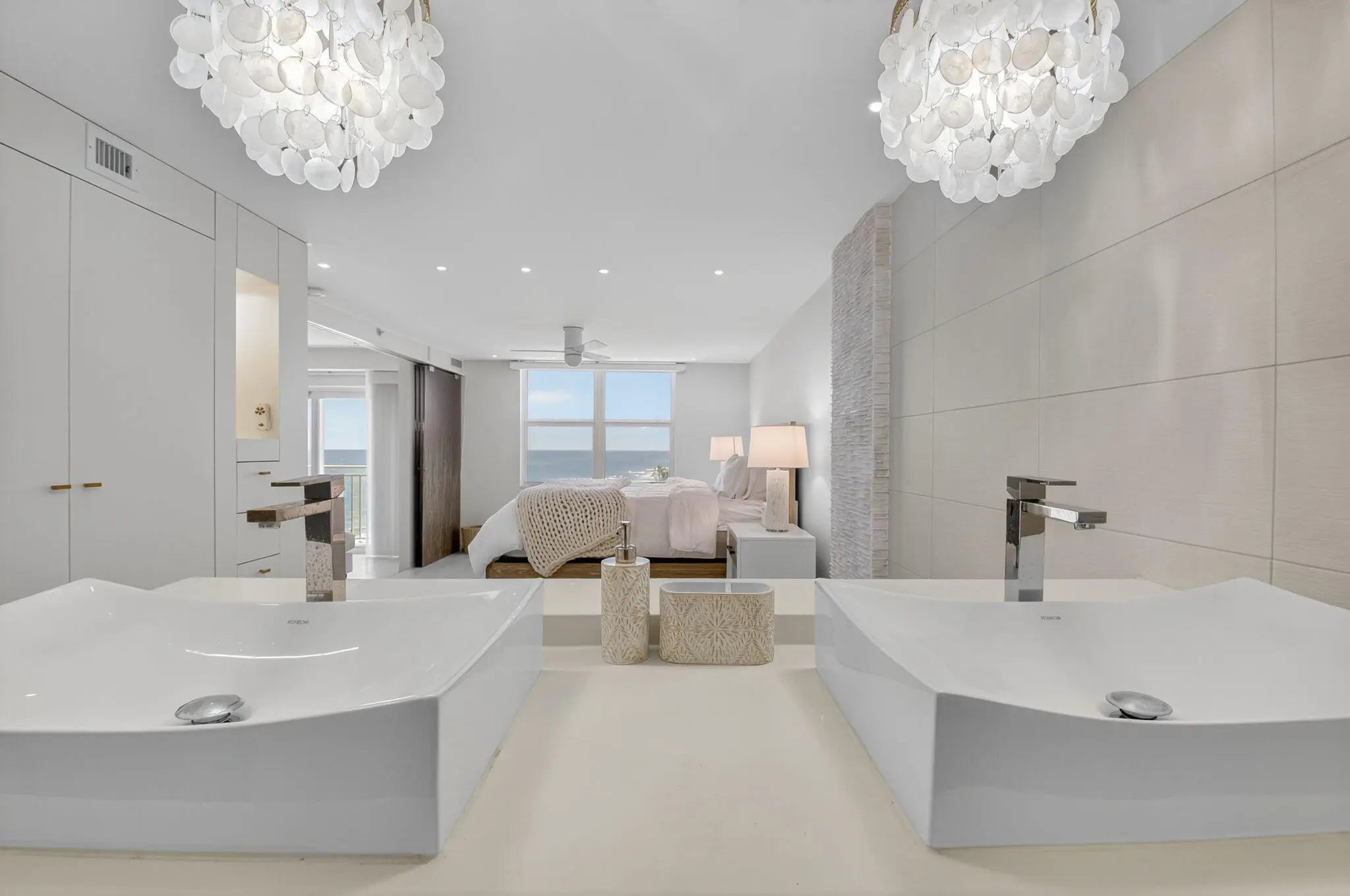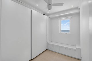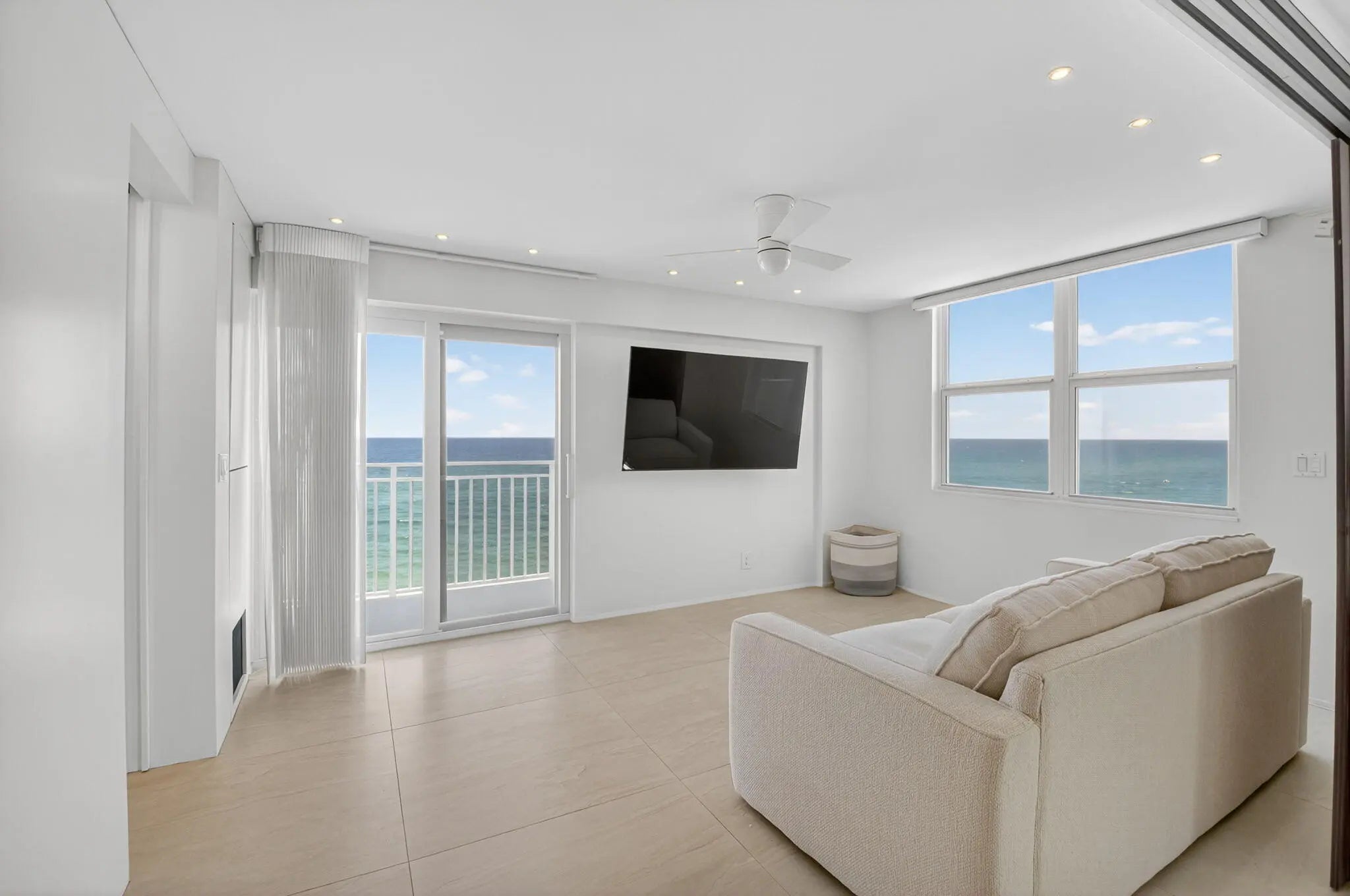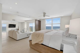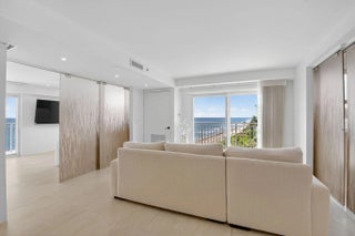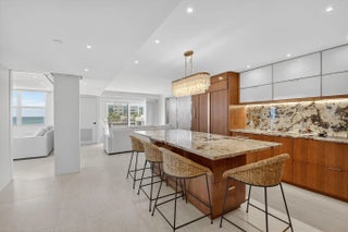 Coastal Luxury Living Redefined. Situated directly on the oceanfront, Residence 507 offers sophisticated living with uninterrupted ocean views from every room, including the primary bath. This fully integrated smart home captures the essence of coastal elegance, with two private balconies perfectly positioned for sunrise and sunset. The custom kitchen is the true centerpiece, designed for both function and entertaining, and appointed with Miele, Bosch, and Sub-Zero appliances, bespoke wood cabinetry, and an oversized island with seating for ten. Floor-to-ceiling glass doors frame the living space, creating a seamless connection between polished interiors and the breathtaking beauty of the ocean.