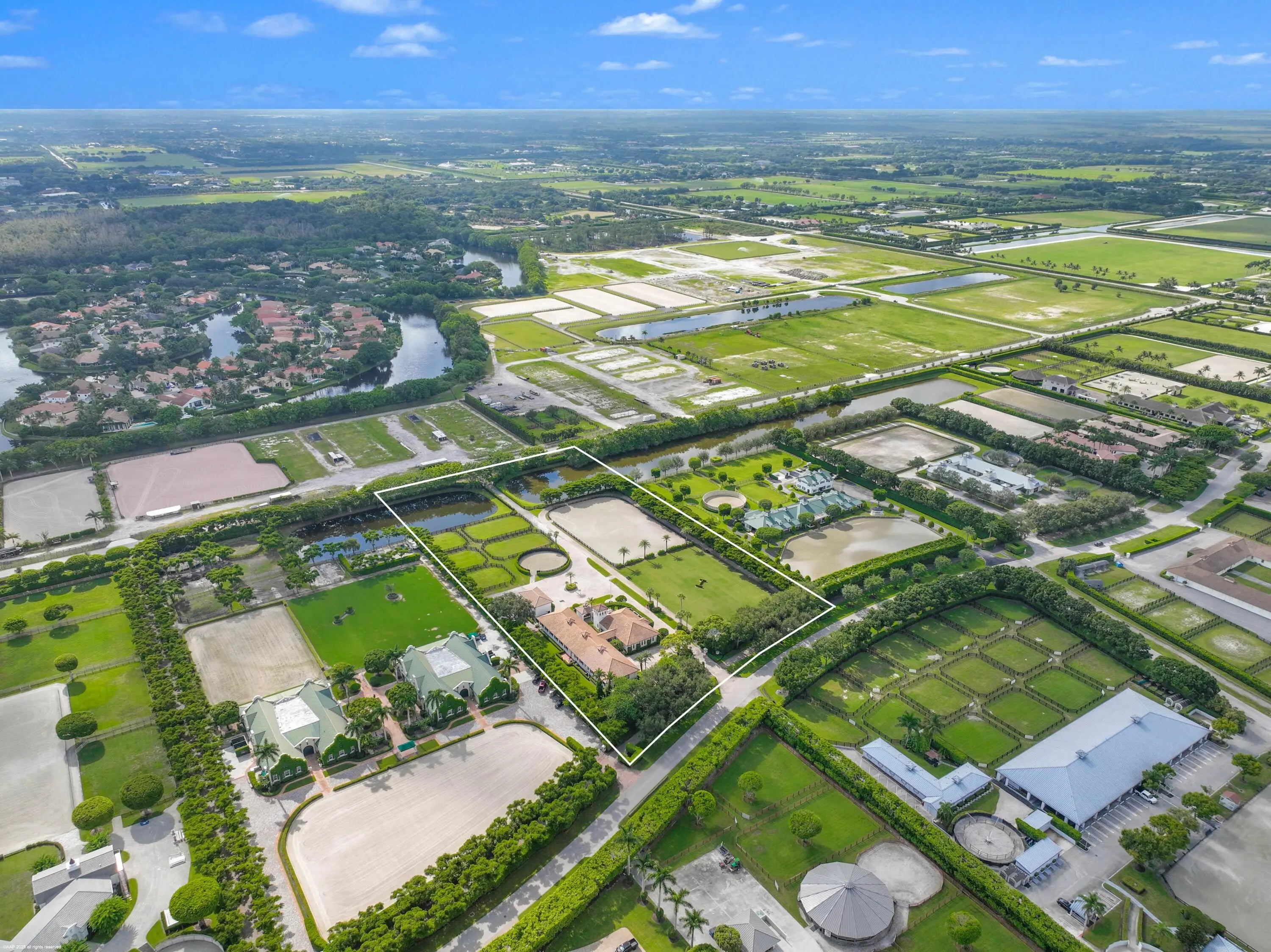Nestled in prestigious Grand Prix Village, this exceptional 5.88-acre equestrian facility offers unparalleled access to the horse show grounds via a private gate. Featuring 16 spacious stalls, a tack room, feed room, and four wash stalls, the property is designed for elite equestrian performance. The owner's quarters include a luxurious two-bedroom, 2 bath apartment, a private office, and a lounge for relaxation. Staff accommodations provide a comfortable three-bedroom, two-bath residence. The state-of-the-art all-weather arena, adjacent Grand Prix field, and surrounding track, complemented by five paddocks and a lunging ring, create a world-class environment for training and competition. A rare gem in the heart of equestrian excellence.