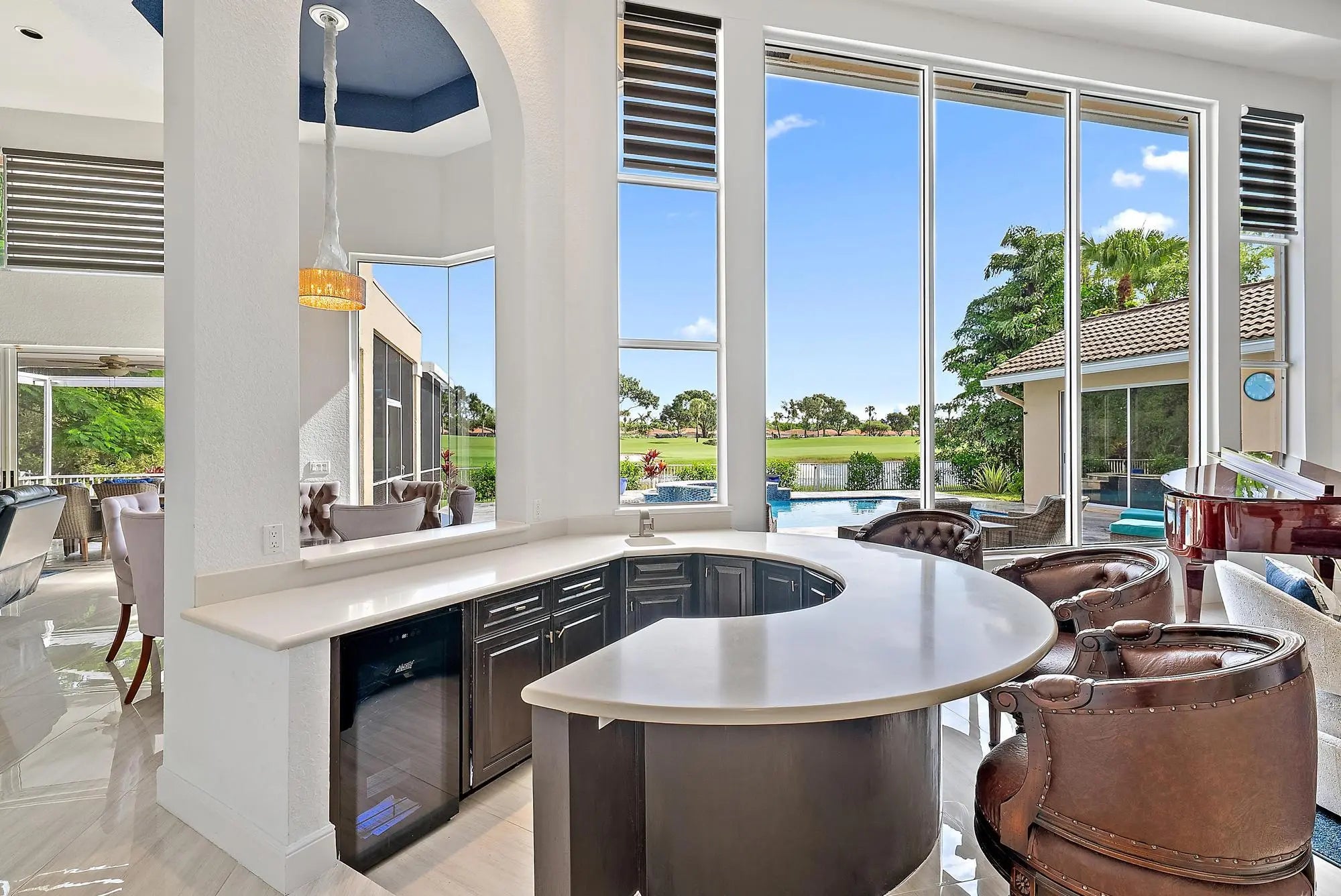 IMMEDIATE PREMIER GOLF MEMBERSHIP AVAILABLE. This expansive and elegant estate has been modernized and offers breathtaking views of water and the 6th green of the Jack Nicklaus-designed Legend Course. With 6BR/7.5BA, this impressive residence is situated on more than one-third of an acre in a private cul-de-sac, showcasing 120 feet of water frontage. The result is a perfect blend of scenic beauty and privacy—all within close proximity to the main Ibis gate, and Ibis's world-class amenities, for added convenience. The home has been transformed with sleek and stylish renovations, many of which done in 2021. Chic porcelain tile flows throughout the main living areas, complementing the soaring ceilings and expansive open spaces. Dramatic walls of windows flood the interior with light and frame the iconic views that define the Ibis lifestyle. Upstairs, 2023-installed, handsome engineered wood flooring adds warmth and sophistication, while designer light fixtures and custom silhouettes complete the contemporary aesthetic. The primary suite is a true retreat, featuring real bamboo flooring, his-and-hers baths, and a large sitting room ideal for a nursery, office, or private lounge. The renovated primary bath showcases a double Roman tub and a luxuriously redone shower. A total of four bathrooms were renovated in 2021, elevating the aesthetics of this property and making it move-in ready. Outdoors, the estate offers resort-style living with a newly redone travertine driveway, along with a reimagined, resurfaced pool and spa area featuring timeless travertine stonework and generous entertaining spacesdone in 2021. New pool pump heater (2023), Practical upgrades include a roof replaced in 2016, three HVAC units also replaced in 2016, ensuring both style and peace of mind. This extraordinary property is offered with Immediate Premier Golf Membership eligibilitya rare opportunity to enjoy the very best of country club living from day one. The Club at Ibis is an award-winning, Platinum Club of America that features a 90,000-square-foot clubhouse, three 18-hole Nicklaus-family championship golf courses, five restaurants, a world-class fitness complex and spa, and exceptional tennis and pickleball facilities. IBIS MEMBERSHIP FEES ARE INCREASING. BUYERS WHO GO UNDER CONTRACT BY APRIL 1, 2026 AND CLOSE BY JUNE 12, 2026 CAN SAVE A MINIMUM OF $30,000.
