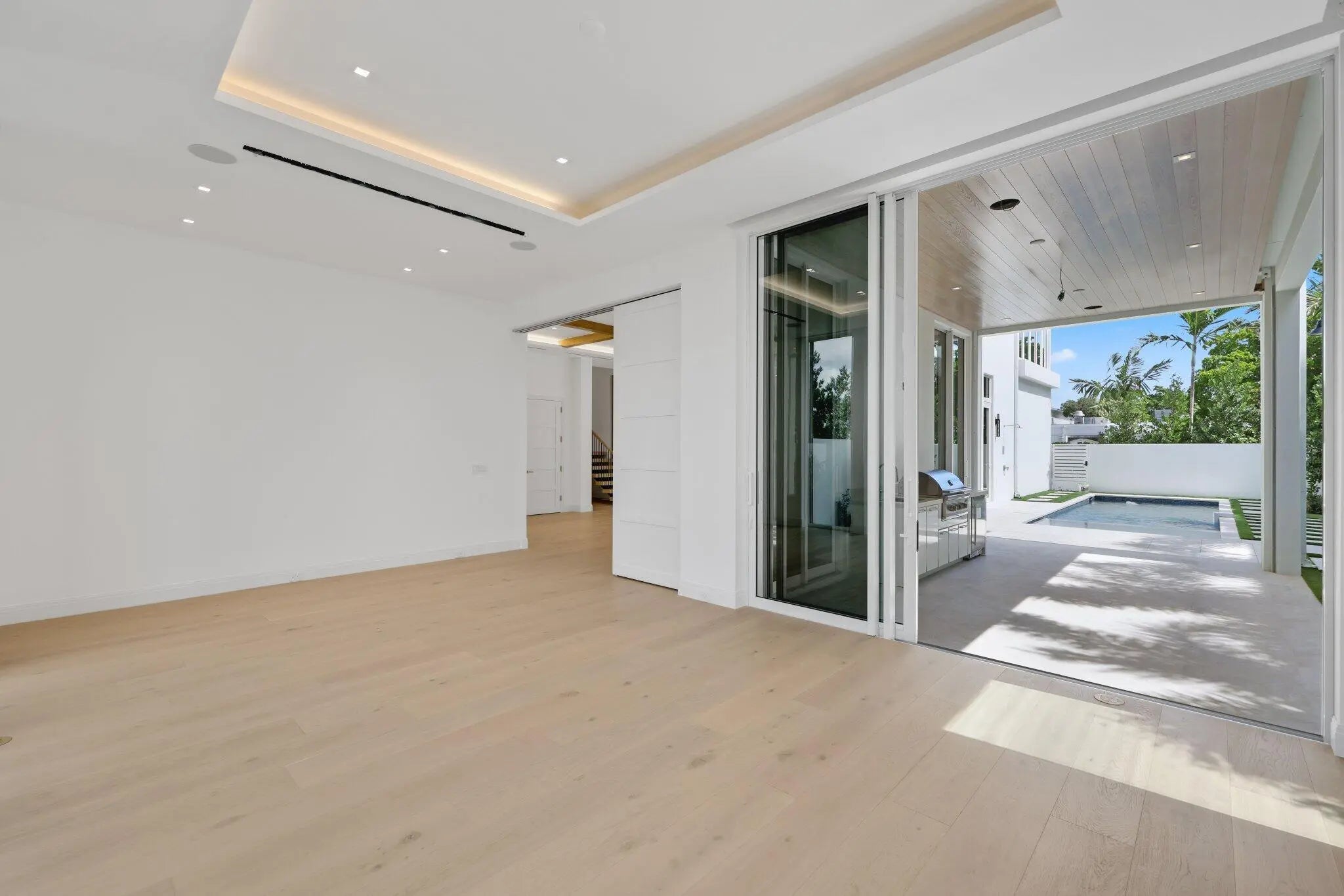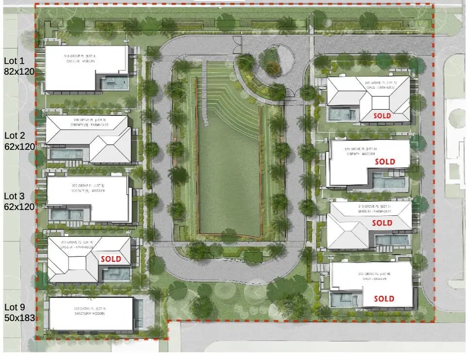 Welcome to Grove Estates — Downtown Delray's only Gated Single-Family Home Community built by award-winning Azure Development. The Serenity model in Grove Estates sets a new standard of luxury living in downtown Delray Beach within true walking distance to Atlantic Ave. Just over 3 blocks to Atlantic Avenue and 2 blocks to Pineapple Grove. This brand-new, modern residence offers 4 bedrooms, 5 full bathrooms, 2 powder rooms, large flexible club room with bar, office, lounge, & over 5,000sf of expertly crafted interior living space. Designed with clean lines, soaring ceilings, & expansive 12' floor to ceiling windows, this home is bathed in natural light & built for seamless indoor-outdoor living. Covered lanai with summer kitchen & views of the pool, with sunshelf & spa from all living areas. Only 5 homes remain in Grove Estates with 5 homes already sold. This home will be completed and ready for move-in Fall/Winter 2026, but other homes in Grove Estates will be completed earlier for quicker move-in. 320 Grove Pl is a Serenity Modern, but can be customized with mixtures of finishes from the Serenity Farmhouse, if you contract soon. Designed by celebrated architect Randall Stofft and curated by Czar Interiors, the Serenity model spans 5,192 square feet of air-conditioned living with over 6,300 total square feet of resort-style space. Soaring 12-foot floor-to-ceiling glass windows invite light and lush greenery into every corner of the home, creating a seamless connection to the outdoors. The dramatic floating staircase and private elevator offer both modern flair and convenience, while the thoughtful layout effortlessly blends entertaining and everyday living. The gourmet kitchen is a chef's dream, outfitted with Wolf and Sub-Zero appliances, custom 12-foot cabinetry, and a hidden butler's pantry. An expansive club room offers full front and back bars and expansive glass doors that open completely to the outdoors, perfect for hosting or relaxing in style. Step outside into your own private oasis with an oversized saltwater pool, spa and sunshelf surrounded by dense, tropical landscaping for total privacy. The covered outdoor living area features a full summer kitchen, wood-clad ceilings, and concealed retractable screens, allowing for effortless indoor-outdoor entertaining no matter the season. Upstairs, expansive balconies with glass railings overlook the lush central green, a landscaped park exclusive to Grove Estates, ideal for peaceful walks, yoga, or simply taking in the tranquility. Upstairs, 4 spacious bedrooms include a luxurious VIP suite and a stunning primary retreat, each designed with custom finishes and spa-like bathrooms. A three-car garage, solid steel and concrete second-floor construction, natural gas fireplace, and designer fixtures round out this exceptionally built home that merges quality with artistry at every turn. With unmatched design, rare privacy, and a location just steps from the energy of downtown Delray, this is your opportunity to claim one of the most exclusive addresses in South Florida.
