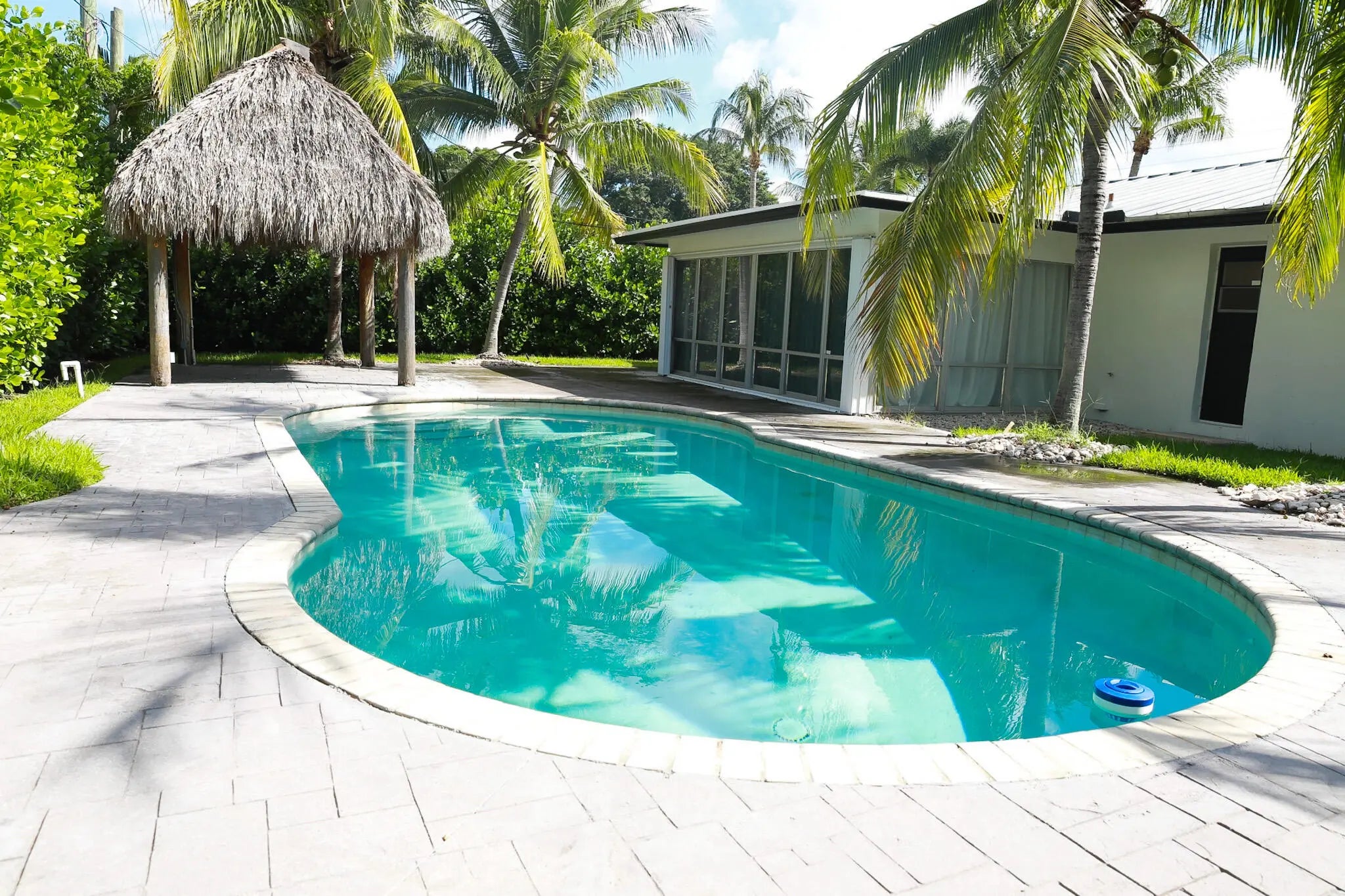 Tucked away on a charming, tree-lined street just over a mile from Delray's vibrant Atlantic Avenue, this sun-filled Lake Ida bungalow blends comfort, style, and Florida living at its best. Offering 3 bedrooms and 2 bathrooms across 1,600+ sq ft of living space, the home features a bright enclosed porch, Italian wood-look porcelain tile, updated LED lighting, and a welcoming kitchen with granite countertops and a breakfast bar that flows into open living and dining areas. Impact windows with accordion shutters provide peace of mind, while the oversized laundry room offers flexibility for storage, a home office, or future reimagination. Outside, a sparkling pool is surrounded by lush landscaping and a fenced yard, complemented by a Tiki hut with electricity and space for an outdoor kitchen or bar, plus a one-car garage and circular driveway for ample parking. Move-in ready yet full of potential, this Lake Ida gem invites you to relax, entertain, and dream.