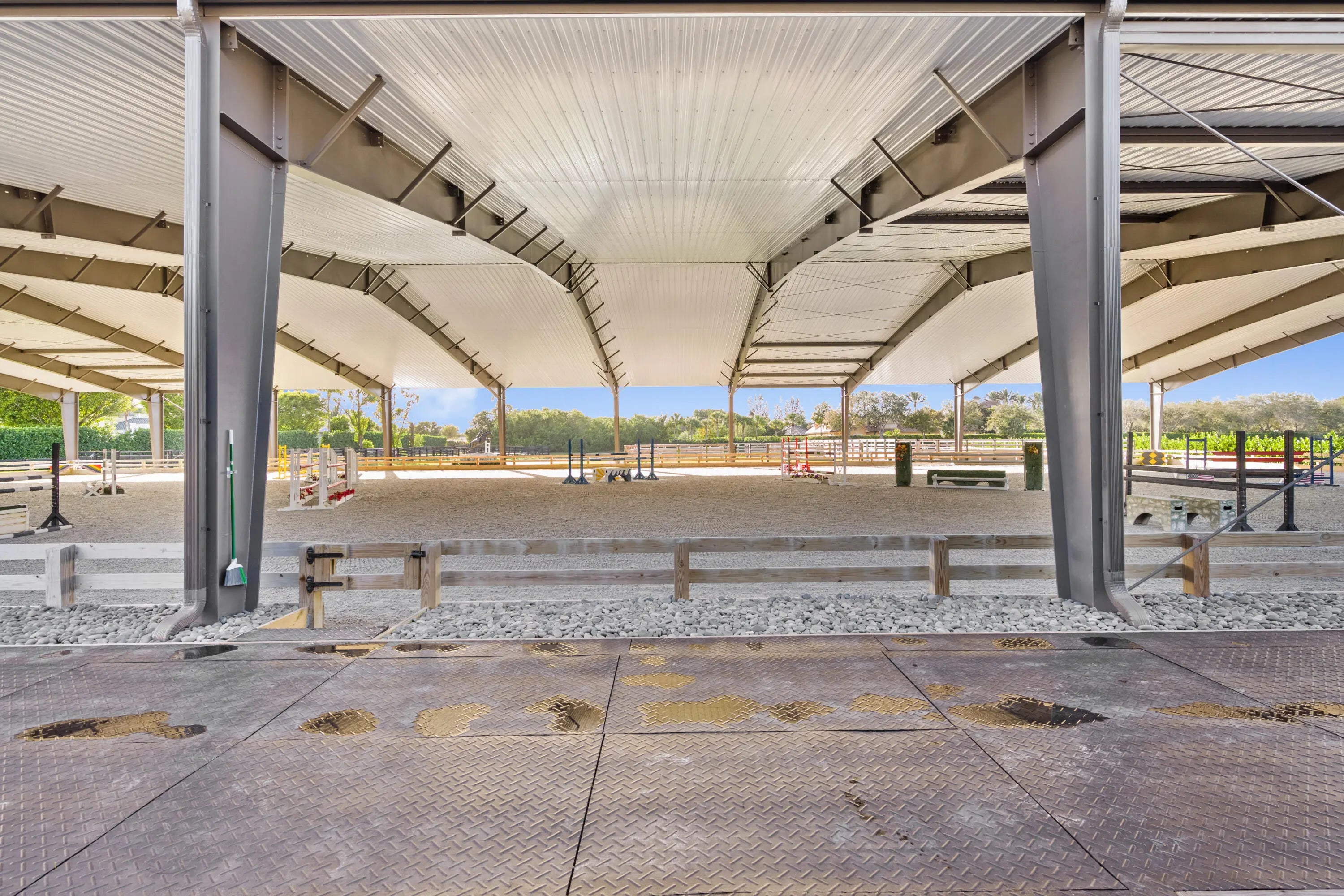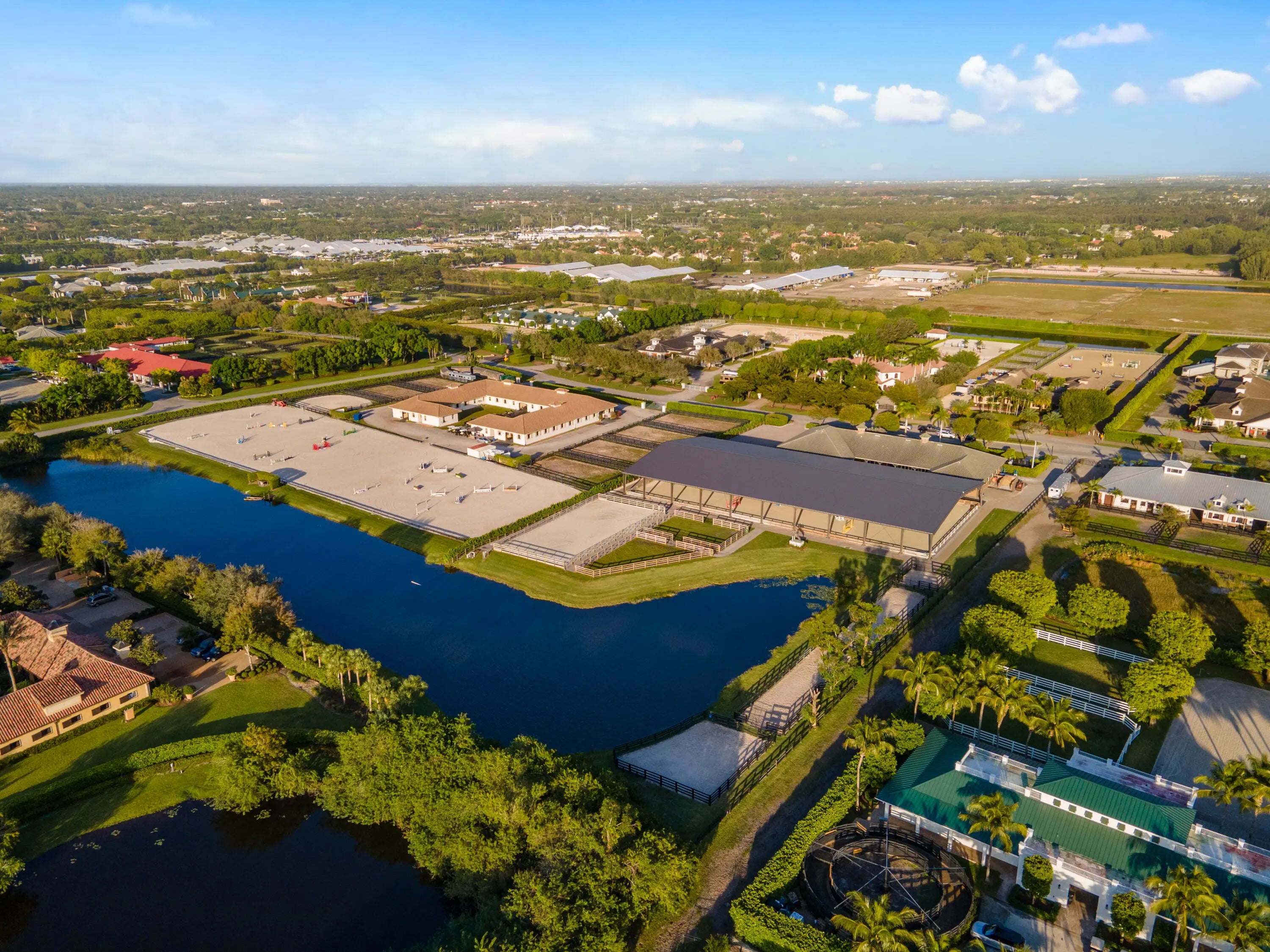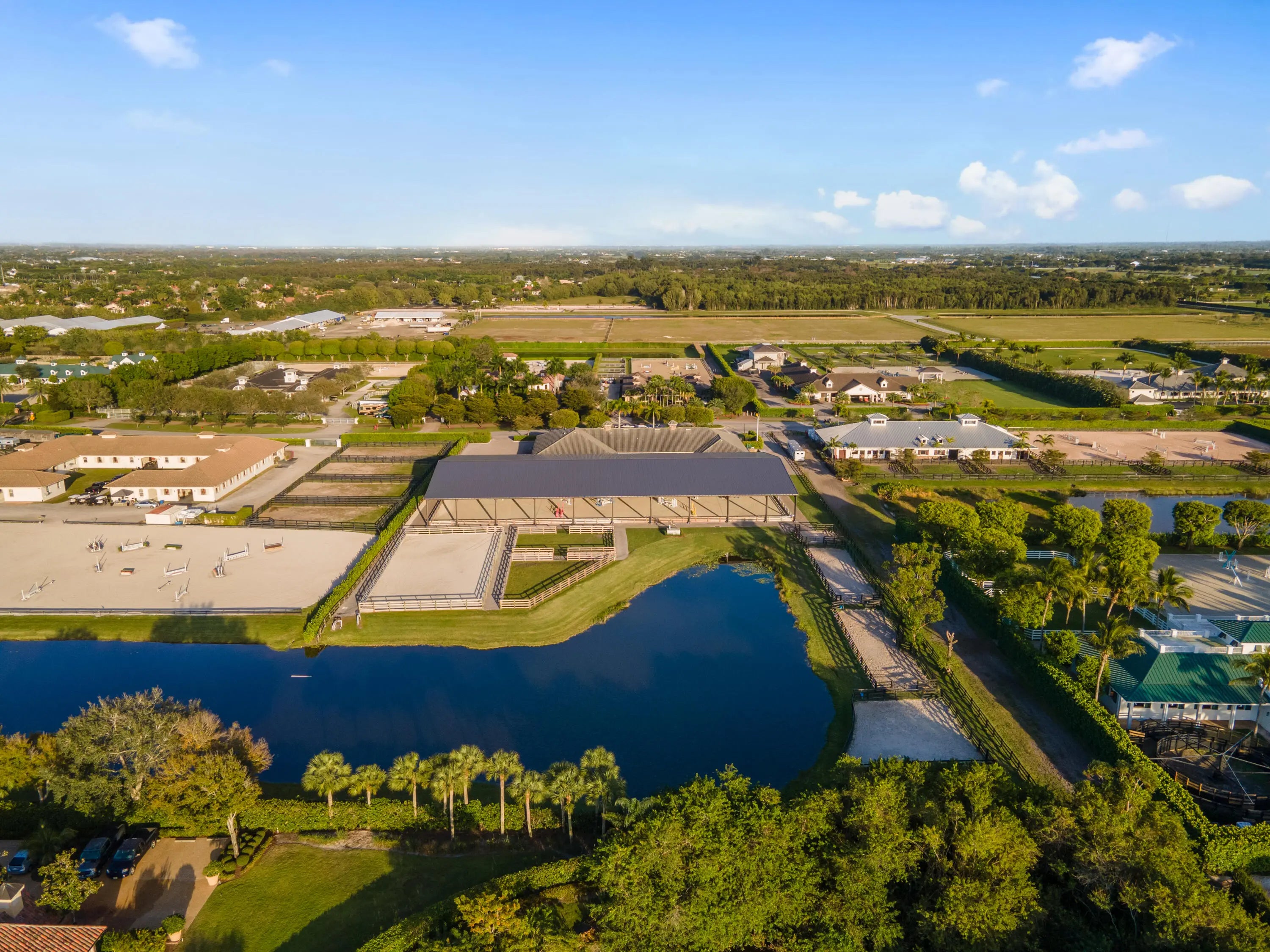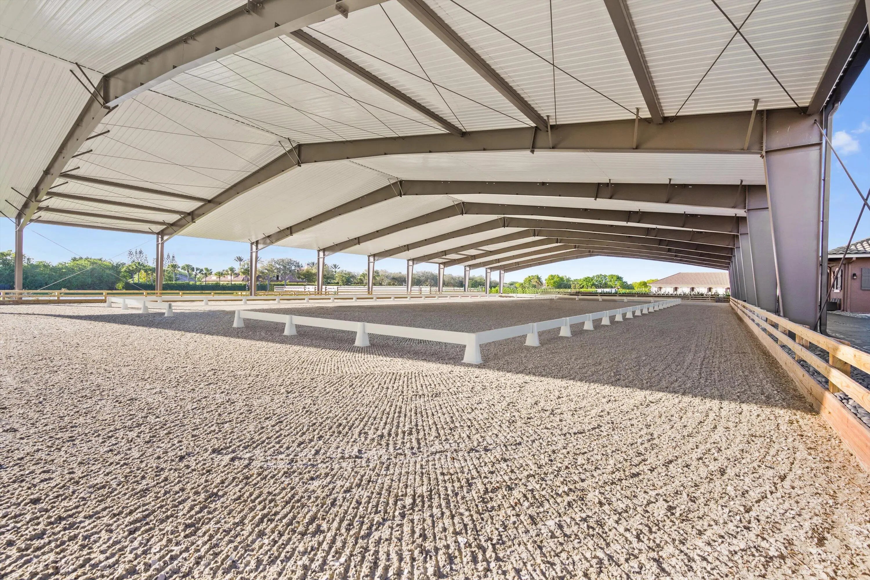 Situated within the gates of Grand Prix Village this 20 stall stable was designed and maintained by a top equestrian professional. Enter into this stunning stable you will be impressed with the beautiful tongue and groove ceilings, brick front stalls and wide aisles. The stable is fully rubber matted, including the stalls. The interior features include; an office with a full bathroom, a large tack room with a kitchen, a second office, separate farrier and veterinary areas, wash and grooming areas, laundry room and secure med room. There are 3 enclosed garages and a flexible space with a full bath that could easily be converted to living quarters. Outside you will discover the 130X240 COVERED ARENA with GGT footing and multiple paddocks. Please see documents for a full list of amenities. Enter this property through one of three gated driveways which allow for flow of vehicles and ample parking. As you walk into this stunning stable you will immediately be impressed with the beautiful tongue and groove ceilings, brick front stalls and wide aisles. The stable is fully rubber matted; including the stalls, which feature fans, fly spray system, and full length grated doors and half doors. The interior features include; a lounge/office with a full bathroom, a large tack room with a kitchen, a second office, separate farrier and veterinary areas, wash and grooming areas, laundry room and secure med room. There are 3 enclosed garage/storage spaces, one being oversized and air conditioned. There is a flexible space with a full bath that is currently used as a photography studio but could easily be converted to living quarters. As you navigate towards the back of the property you will discover the 130 X 240 covered arena with GGT footing and mulitple sand and grass paddocks. Your privacy and tranquility are protected with a lovely clusia hedge that surrounds the property.