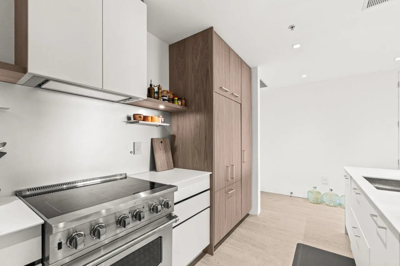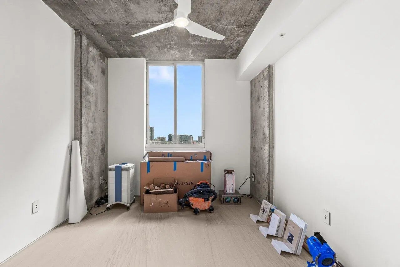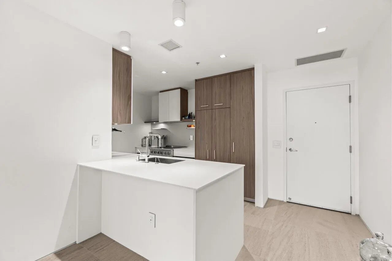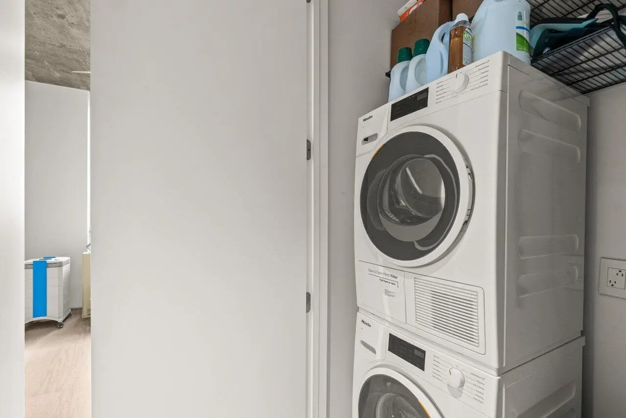 Flawless 2025 renovated 2BR/2BA at The Edge. Condo features mocha limestone honed floors, all new doors and drywall, seamless lighting, and bathrooms with natural stone and frameless glass showers. Both bedrooms have Container Store custom closets. Condo includes reverse osmosis water system, new AC, dehumidifier with pump, and plasma air cleaner. Kitchen boasts Viking stove top, custom-paneled Fisher & Paykel fridge/dishwasher, and Miele washer/dryer. Bonus built-in nook/workstation. Private balcony with city views. Amenities: rooftop pool/clubhouse, fitness & business centers, 24/7 security, lobby, 2 garage spots. Walking distance to downtown restaurants; easy access to PBI, Tri-Rail, and Brightline.