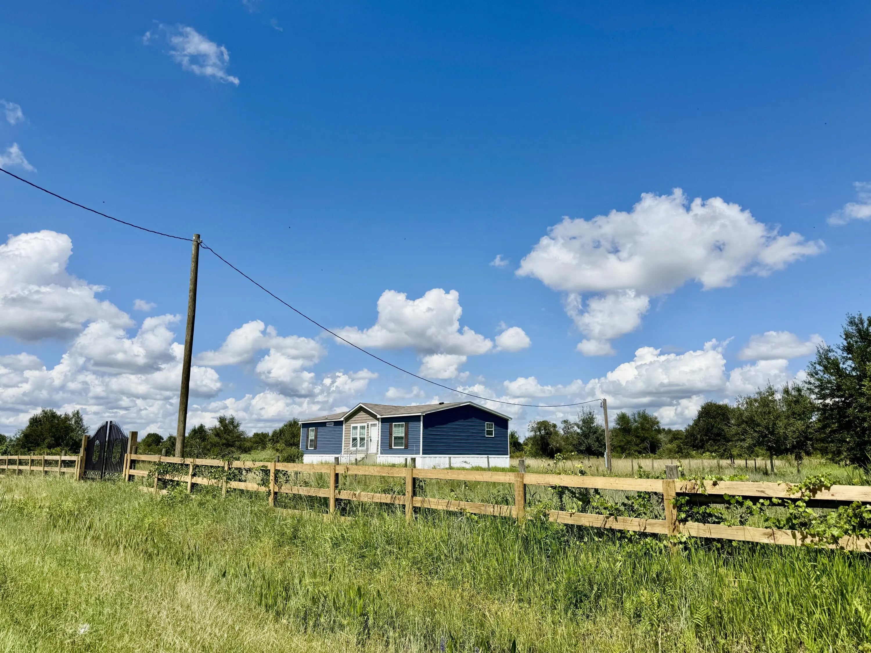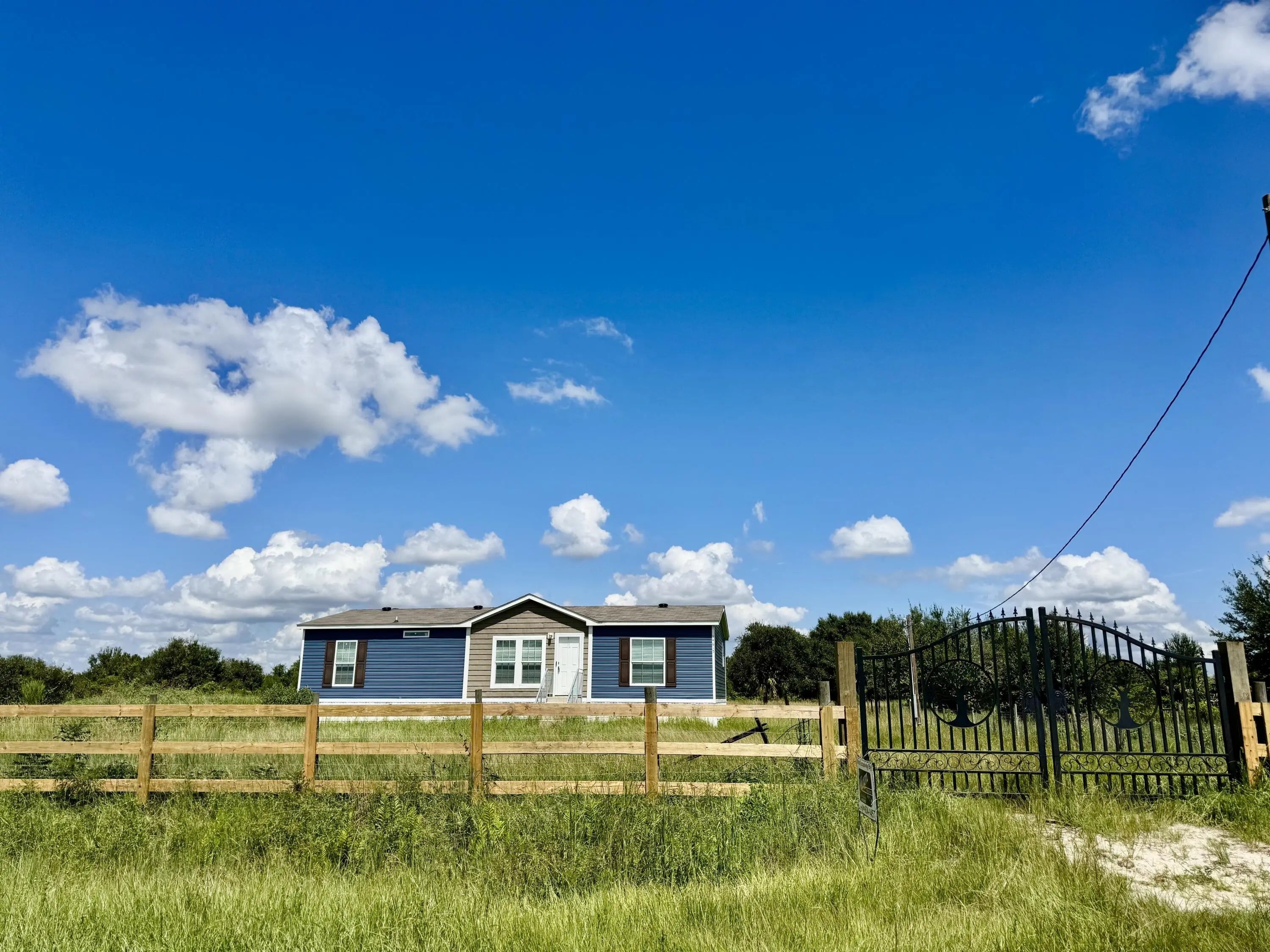 HOME~HOME on the RANGE! Perfect location! 2025 Scotbilt 3 Bd/ 2Ba, DWMH. Open concept, split plan, knock down/drywall interior and can lighting. Island kitchen, pantry, SS appliances. Master suite with walk in closet, soaking tub and separate shower, and double sinks. Large wrought iron gate and 3-board fence entrance. Beautifully cleared, with several oak trees. 1.25 Ac, fully fenced. Only 5 lots from paved road on 246th. Best Location! High and dry. EXCEPTIONAL! Dimensions are approximate, must measure for exact.