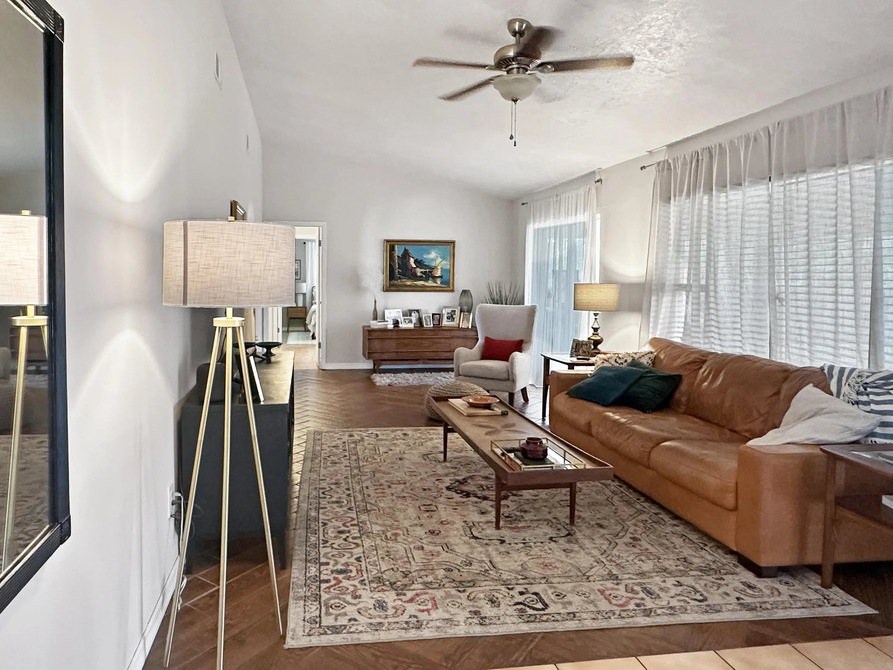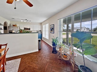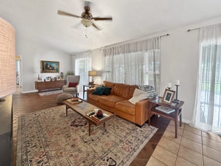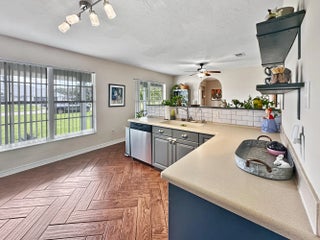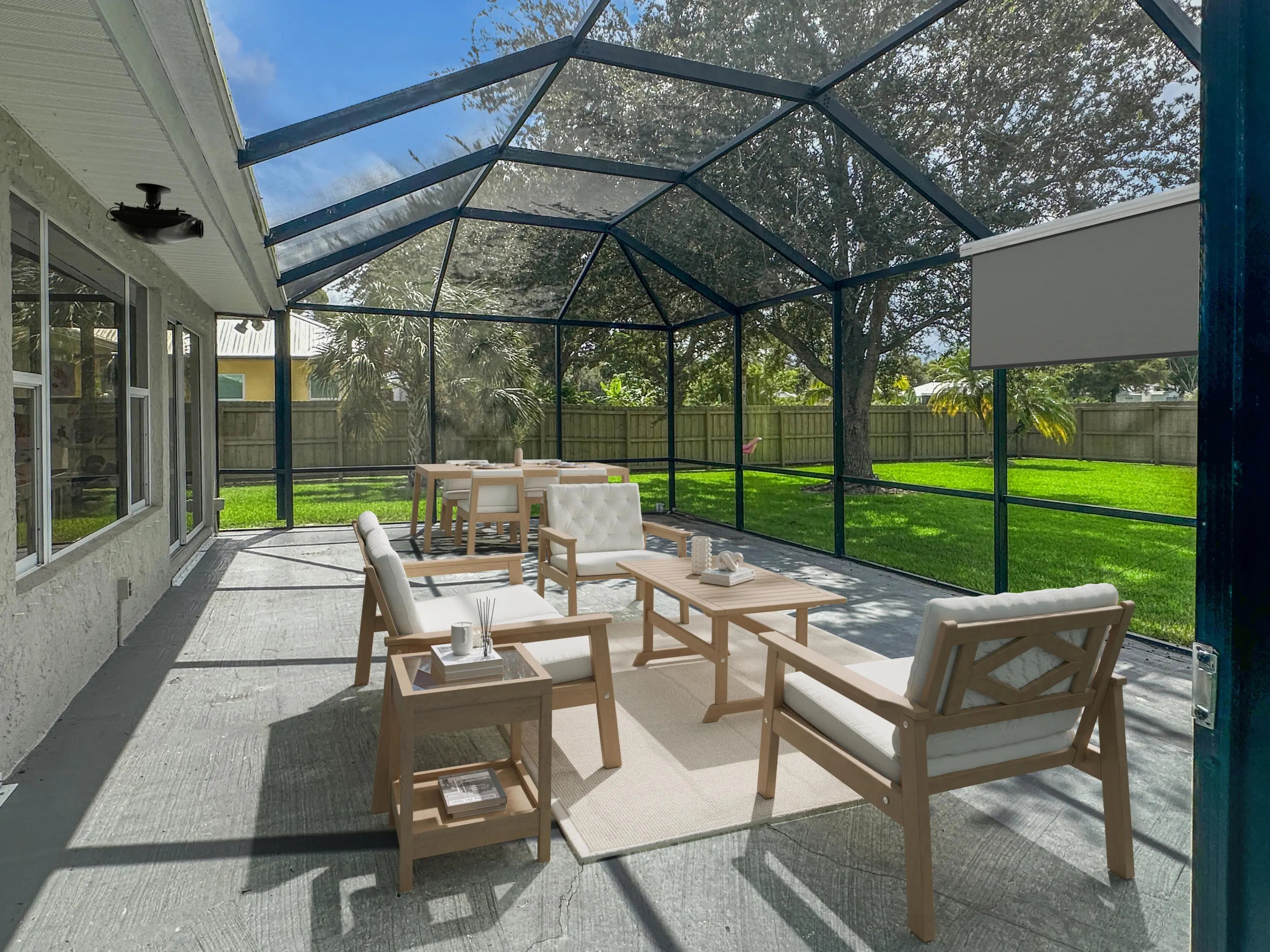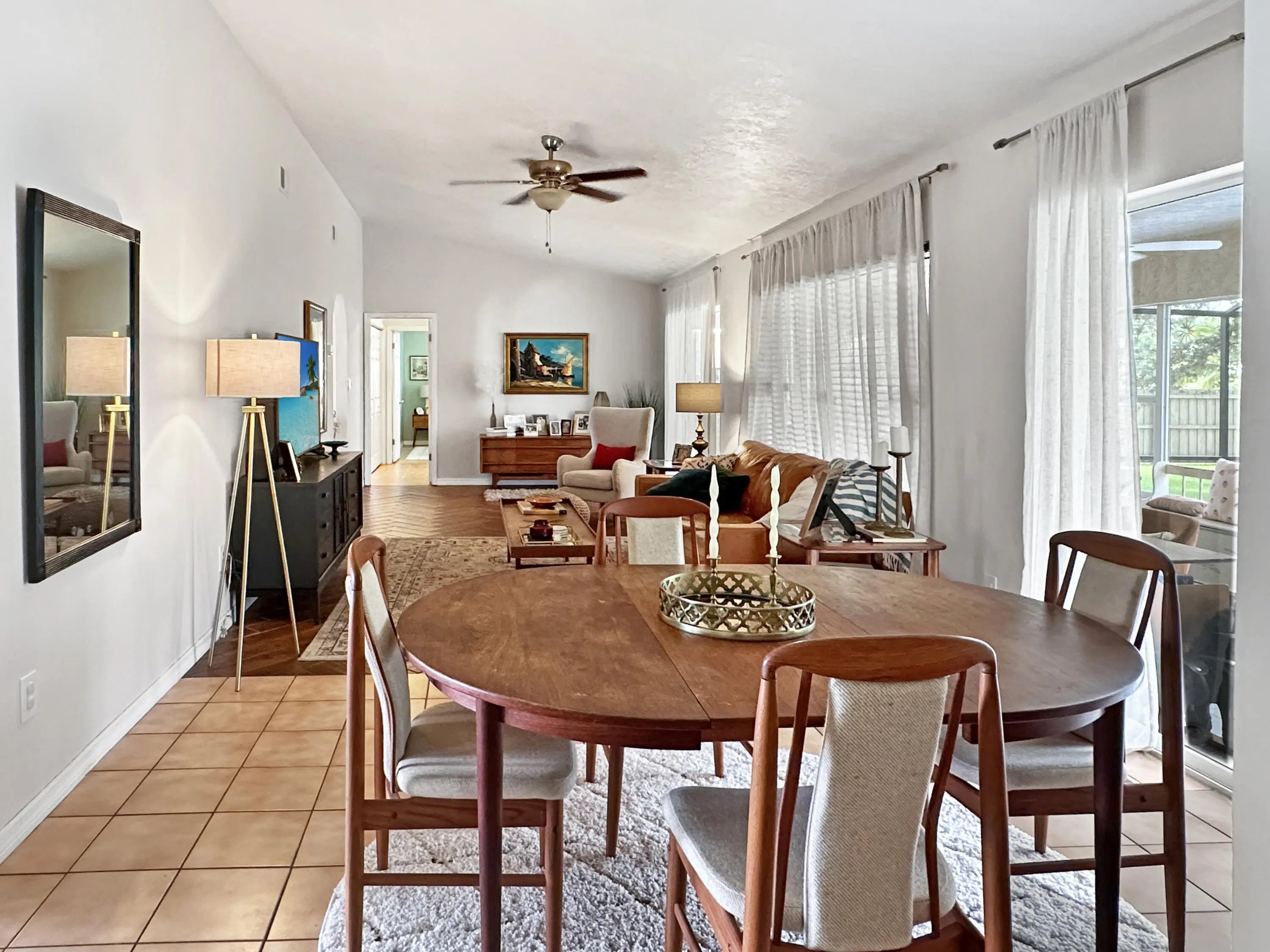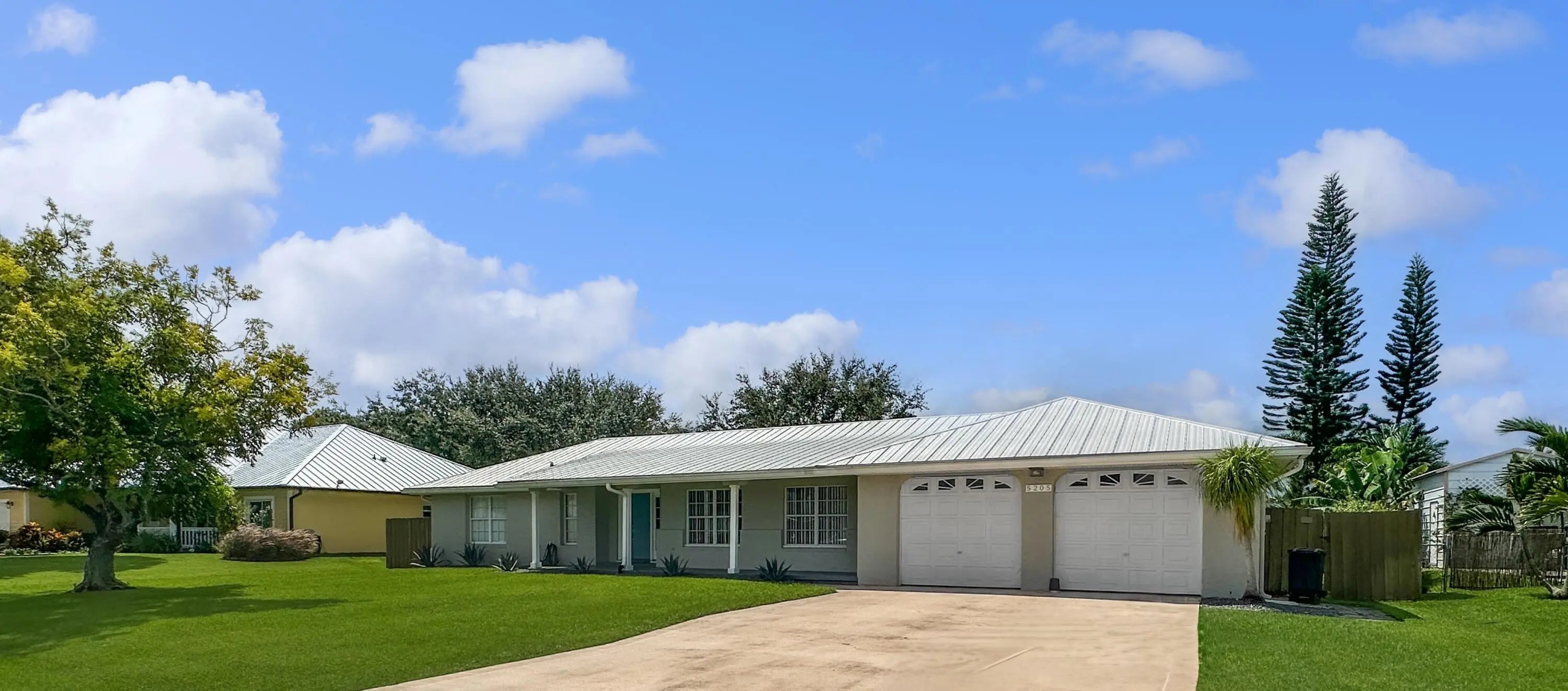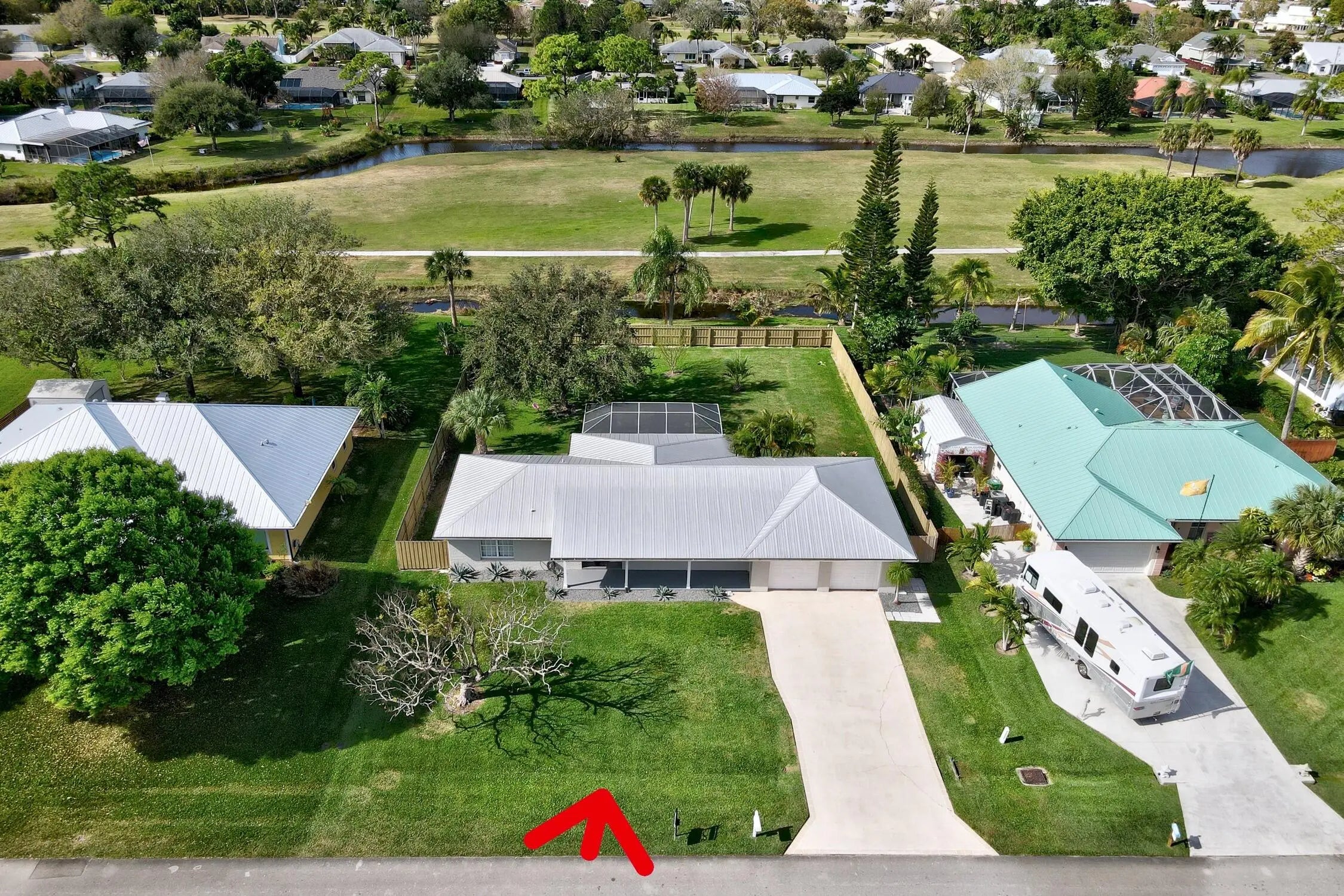 Embrace the elegance of easy living in this impeccable single-family residence, nestled within the serene backdrop of the 6th Fairway of Island Pines golf course. With a stunning metal roof crowning its solid CBS structure, this home radiates both durability and style. Your new retreat boasts two generously sized bedrooms, complemented by two well-appointed bathrooms, ensuring both comfort and privacy. A bonus room offers the versatility to serve as a den, office, or even a third bedroom, catering to your ever-evolving needs. A heartwarming spacious kitchen, complete with newer appliances, melds seamlessly into a cozy family dining area, ideal for creating cherished memories over home-cooked meals. The large formal dining room and family room combination provides a perfect canvas for both elegant entertaining and restful evenings. Step into the enclosed Florida room, bathed in natural light, offering a tranquil space to unwind. Venture out to the expansive screen-enclosed patio, providing an idyllic setting for relaxation amidst the gentle breezes. The property's .39-acre lot affords a substantial fenced backyard, a personal oasis ready for your outdoor hobbies or simply soaking up the Florida sun. The oversized garage, with its double doors, includes ample space for a workshop, crafting a haven for the hobbyist or DIY enthusiast. With a new hot water heater, A/C system, and electrical panel updated in 2021, this home is as functional as it is beautiful. Located in a coveted neighborhood close to all life's conveniences, this is more than a house; it's the key to the lifestyle you've been dreaming of.