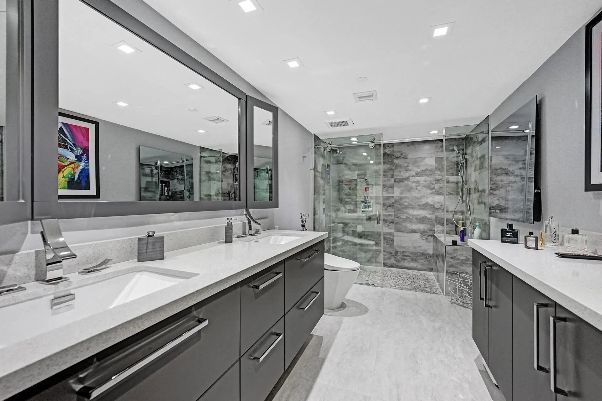 This 1700+ sq/ft 2 bedroom, 2.5 bathroom condo is renovated with high end, designer finishes, ocean views from 300 sq/ft private balcony on prestigious Hillsboro Mile! The kitchen includes 3'' thick quartz counter tops, lots of storage,under cabinet lighting, high-end stainless-steel appliances, built-in wine fridge, no detail was overlooked. The primary bedroom has access to the tiled balcony and all bedrooms have built out, walk in closets. Bathrooms include up-scale features like an over-sized walk-in shower with built in bench and a sunken jacuzzi with a heater. Private beach with loungers,beachfront pool,pickleball and tennis court, fitness center, waterfront clubhouse with grills, 2 deeded parking spots, 2 pets allowed and security. Free shuttle and walking distance to restaurants. The building offers endless amenities: Beachfront pool, pickleball court, tennis court, fitness center, waterfront clubhouse with grills, boat dock, elevator, parking garage with 2 spots, concierge service for packages, and private beach access including beach chairs. Come live the country club lifestyle without the fees! Walk or take the free shuttle to restaurants.
