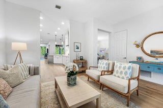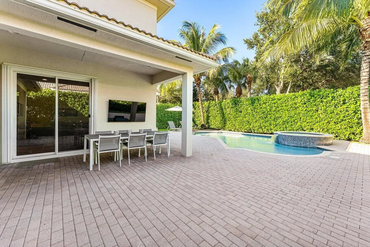Experience the art of refined living in this designer-renovated four-bedroom, four-bathroom home, where every detail has been thoughtfully curated for both elegance and ease. A major renovation in 2023 transformed the residence with Cambria quartz countertops, GE Café appliances—including the coveted Advantium oven—custom soft-close cabinetry, and a drop-in induction cooktop. Illuminated by Restoration Hardware and Visual Comfort fixtures, the home is finished with European White Oak engineered hardwood floors that flow seamlessly throughout, creating an atmosphere of warmth and sophistication. The main level offers a guest bedroom and a versatile office, den, or playroom, along with two beautifully updated bathrooms featuring marble and quartz finishes, new tile, and designer vanities. Upstairs, the inviting primary suite features a sitting area and a beautifully appointed bathroom with dual vanities. Two spacious bedrooms share a full bath, and the nearby laundry room adds everyday convenience. Step outside to your private, fully fenced backyard retreat featuring a heated saltwater pool and spa, covered patio, and lush mature Calusia hedges providing total privacy. Enjoy the spacious two-car garage and extended driveway with covered parking. Additional upgrades include HVAC (2021-2022), a hot-water heater with automatic booster (2021), and central vacuum. Set within the sought-after Paseos community, residents enjoy resort-style amenities including a pool, tennis and pickleball courts, playgrounds, park spaces, and a tranquil nature preserveall just minutes from Jupiter's pristine beaches, dining, and top-rated schools. Make this luxurious retreat your own and experience refined living in this exceptional residence.