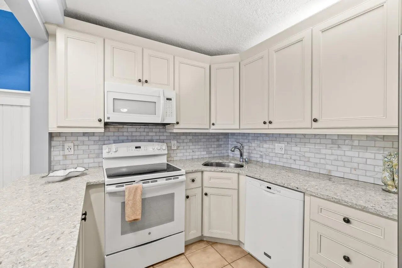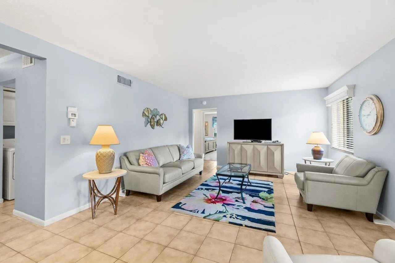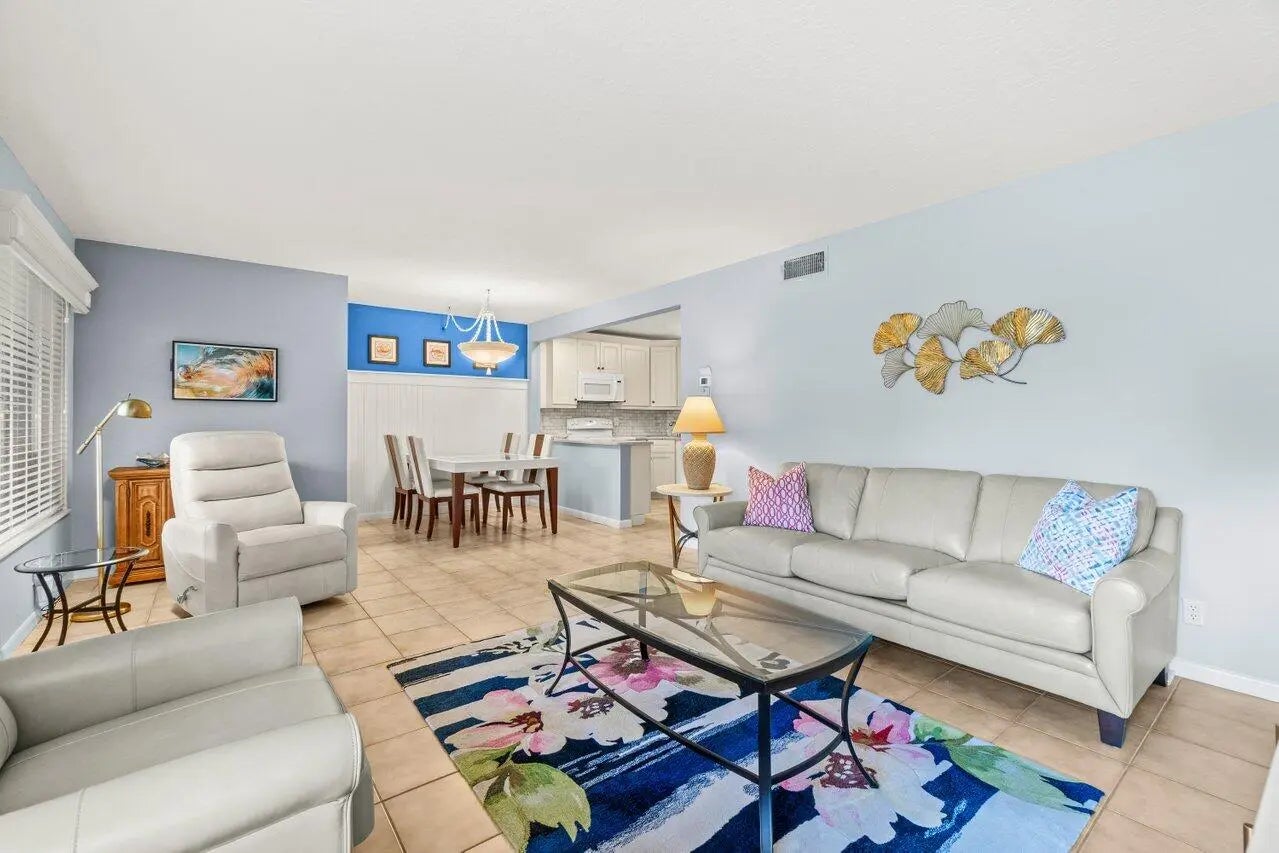 FULLY FURNISHED / TURNKEY! Coastal-Inspired 55+ Condo. This beautifully coastal-inspired condo is being offered fully furnished—just bring your suitcase and move right in! From the moment you step inside, you'll be delighted by the charming décor and tastefully updated kitchen and bathrooms. Enjoy meals in the inviting dining area featuring a stylish shiplap accent wall, perfect for entertaining or relaxing. Each bedroom boasts a spacious walk-in closet, offering ample storage. Step out onto the screened-in patio overlooking a peaceful garden setting—ideal for your morning coffee or an evening unwind. 55+ community (at least one occupant must be 55 or older; others 18+. ESA and service animals permitted with prior board approval. Community amenities include community pool with new decking, clubhouse, bocce ball and shuffleboard court. In-unit washer & dryer for your convenience. Located just steps from the clubhouse and amenities. Prime location close to grocery stores, restaurants, golf courses, shopping, airports, and hospital. Don't miss this turnkey opportunity to enjoy maintenance-free, resort-style living!