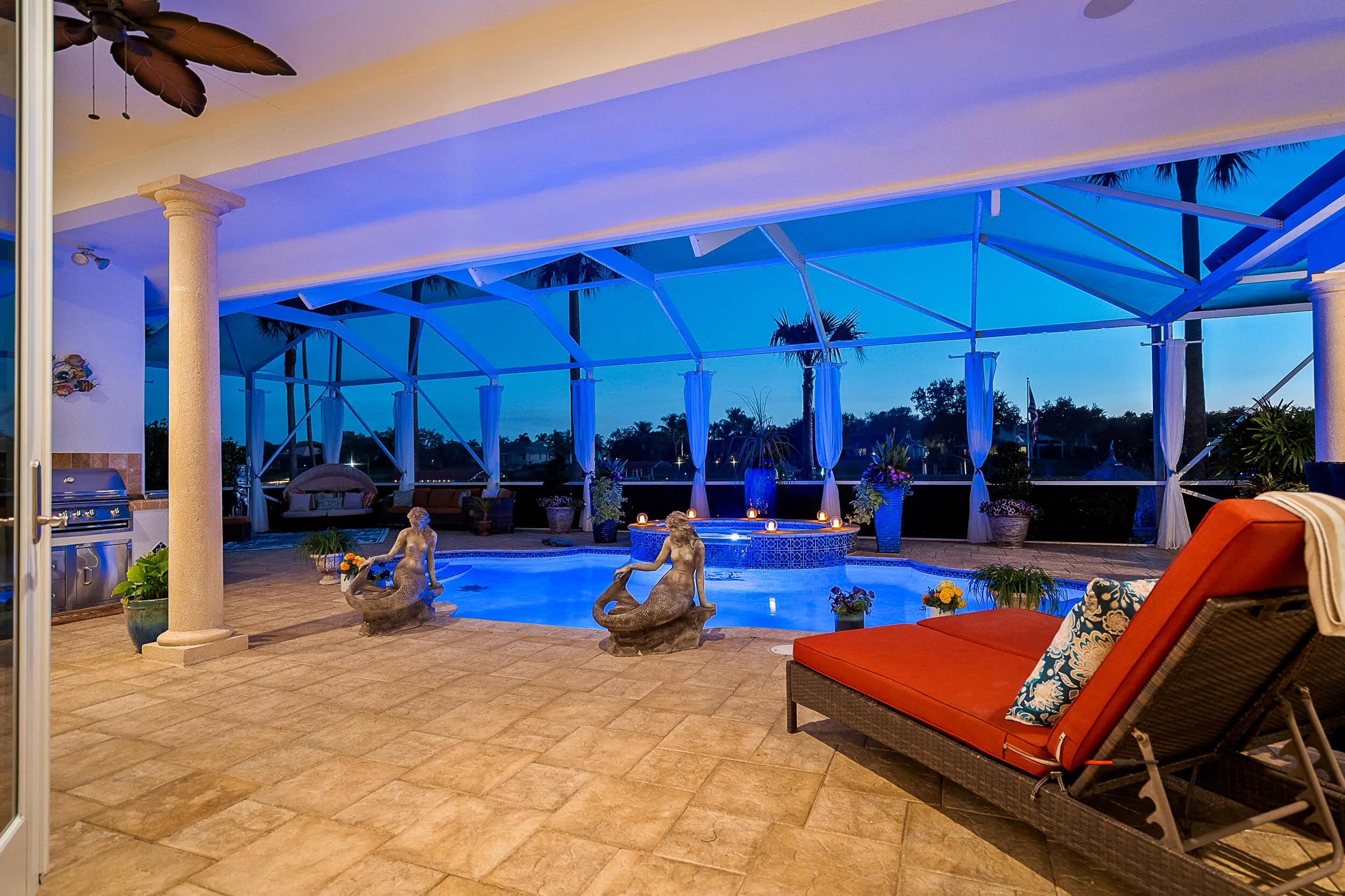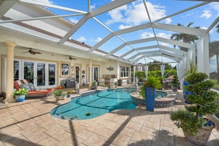Welcome to your own private paradise in the heart of Port St. Lucie. This stunning custom Mediterranean-style CBS estate offers the ultimate in luxury waterfront living with over 150 feet of frontage along the C-24 Canal. Designed for boating enthusiasts & entertainers alike, the property features a private dock with boat lift, a tiki hut perfect for sunset gatherings, & quick access to the nearby public boat ramp. This five-bedroom, five-bath residence offers an exceptional floor plan with a first-floor guest suite, home office, family room, dry bar, balcony, residential elevator, & a three-car garage, all thoughtfully designed for comfort, functionality, & elevated Florida living. A screened pool & spa create a true resort-style outdoor retreat, complemented by a summer kitchen with grilling station, cabana bath, fire-pit area, & lush tropical landscaping. Inside, soaring ceilings & travertine floors set the tone for refined living. The chef's kitchen features dual sinks, dishwashers, ovens, refrigerators, an eight-burner gas cooktop, granite countertops, wine coolers, icemaker, & generous prep space. The primary suite offers dual walk-in closets, a sitting area, & a spa-inspired bath. Additional highlights include impact windows & doors, Taylor foam wall insulation, Icynene ceiling insulation, surround sound, & central vacuum. Located in the gated enclave of South River Shores with low HOA fees, minutes to the Turnpike, shopping, dining, & Tradition.