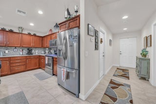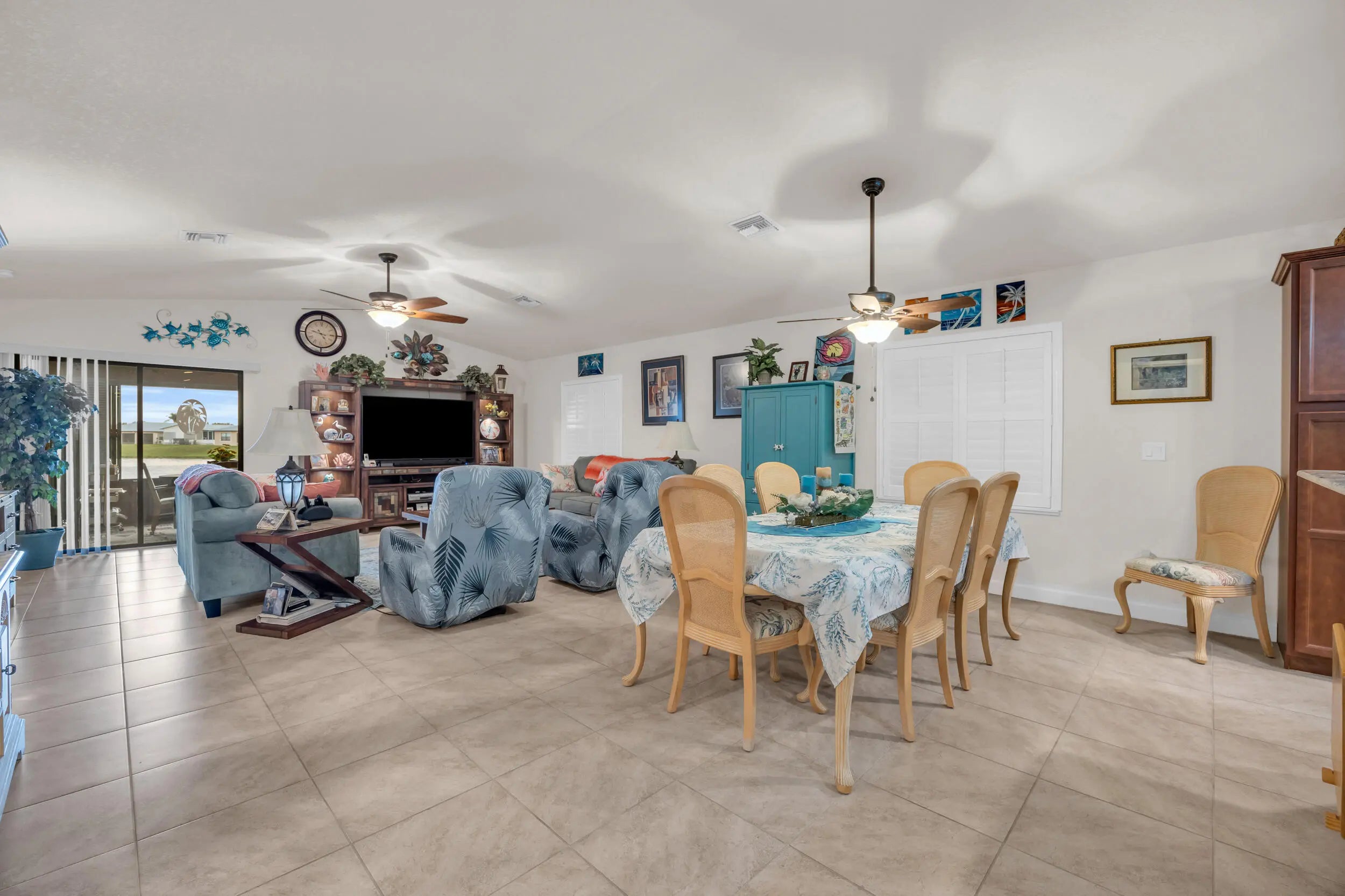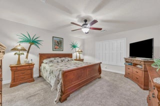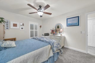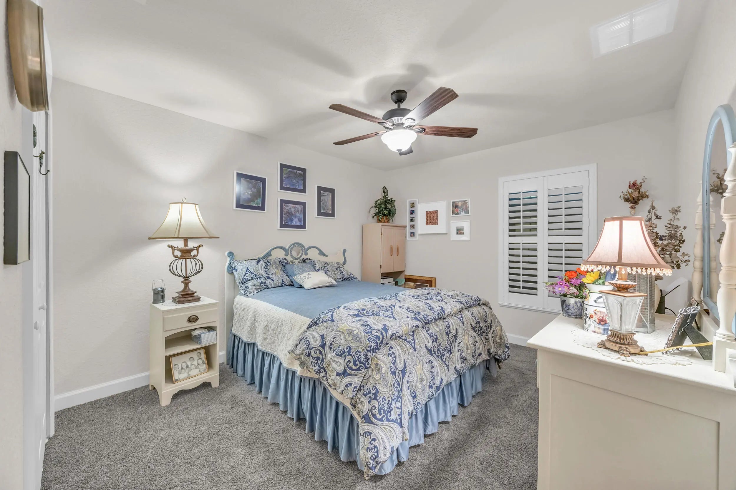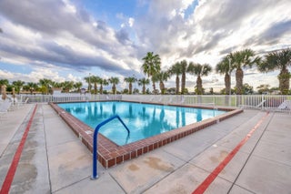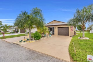 Stunning lake-front home in the vibrant 55+ community of Spanish Lakes Fairways. This meticulously maintained open concept home, built in 2017, features a spacious kitchen with granite countertops and stainless-steel appliances. Plantation and accordion shutters throughout the home enhance aesthetics and provide control over natural light and privacy. Spacious primary suite with double-sink vanity and large walk-in closet. Cozy enclosed lanai boasts gorgeous lake views with split AC unit for year round comfort. Home is equipped with a metal roof which significantly reduces homeowner's insurance costs (up to 30%). One car garage plus convenient 1/2 ''golf cart'' garage. Amenities encompass free golf, two heated pools, fitness center, club house, library, pickleball & tennis courts.
