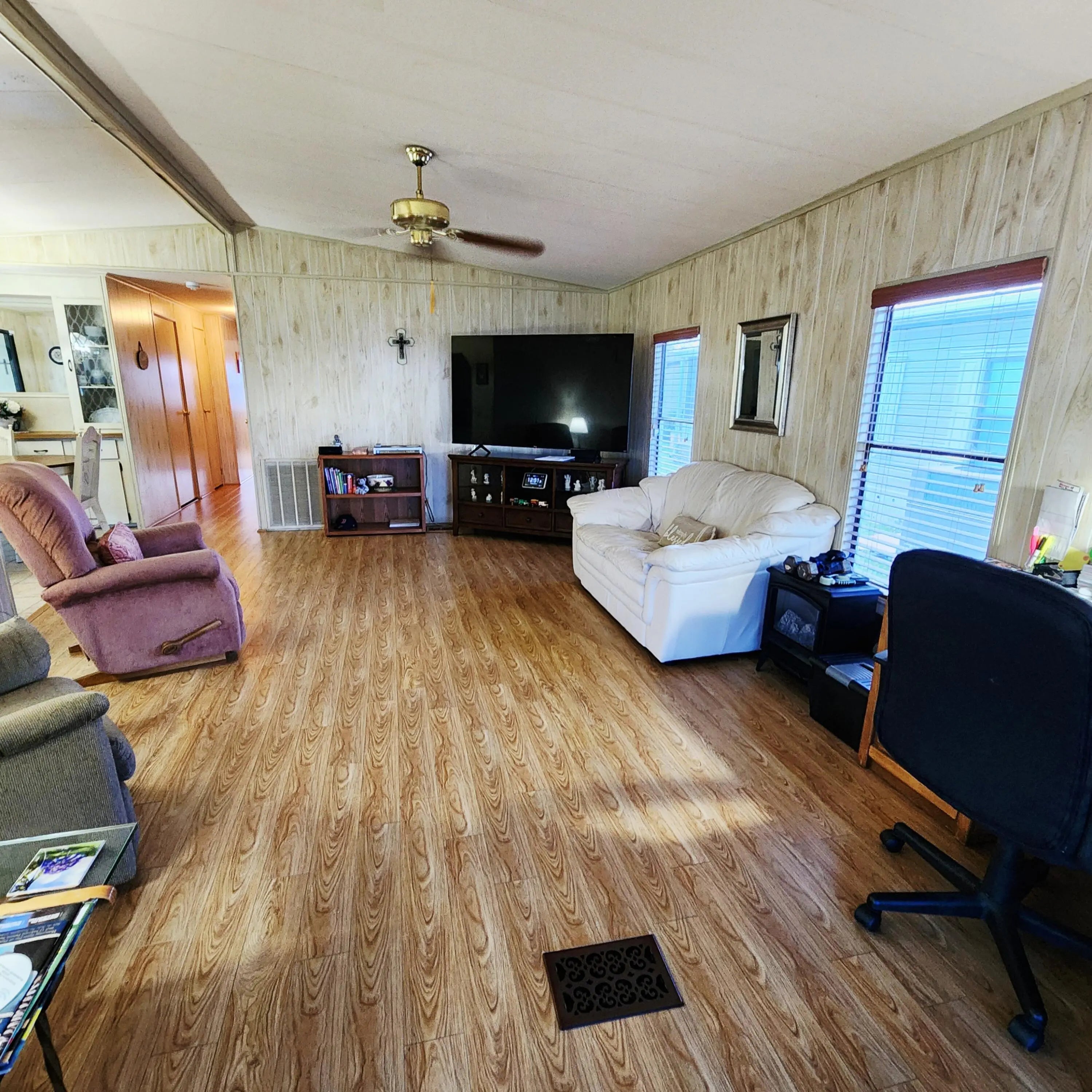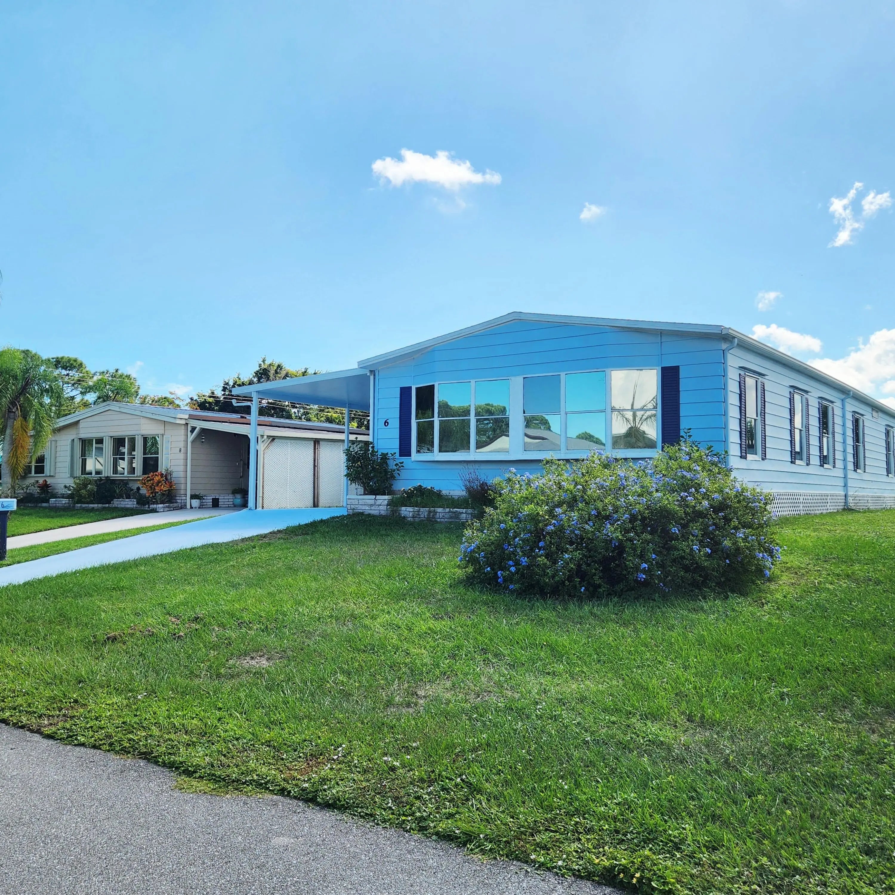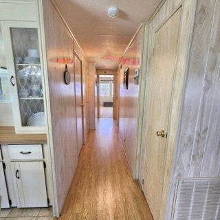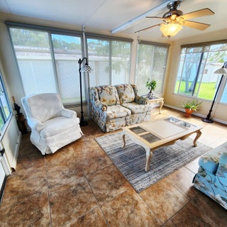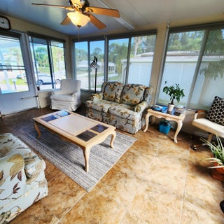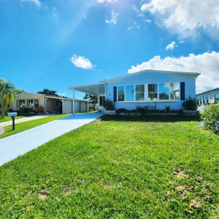 Must see, well maintained 2 bed/2 bath home. On a quiet cal-de-sac, w/ 2 security cameras outside & security system inside. Large walk in closet in Primary bedroom. Murphy bed in guest room. Spacious Florida room w/ updated window treatments. Indoor laundry room. Laminate floors w/ carpet in bedrooms & ceramic tile in Florida Rm. Kitchen cabinets recently painted & outlets updated. Golf Cart outlet added in carport. Large Shed. A/C 2024. Spanish Lakes, 55+ community w/ lot lease of 931.00 includes lawn care, trash removal, Heated Pools, Security, Cafe, Clubhouse w/activities, Private Golf Course (no fees to play), Bingo, Billiards, Bocce, Pickleball, Tennis, Shuffleboard, gym, Library, cards, Mahjong, Clubs & More!