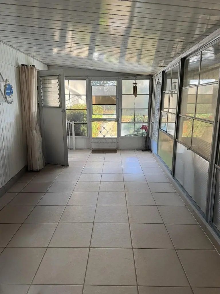Owner will review all reasonable cash offers. Rare opportunity to own the only corner lot currently available in the desirable Woodbridge community. This well-maintained 2-bedroom, 2-bath home offers privacy, flexibility, and exceptional value within a welcoming 55+ co-op, where up to 20% of residents may be between ages 34-54. The updated kitchen features modern finishes along with a reverse osmosis filtration system at the sink, while a whole-home water filtration system provides purified water throughout. The primary bathroom includes updates such as a new toilet and a handicap-accessible shower, offering added comfort and accessibility. A newly added guest suite with its own private bathroom and separate entrance creates an ideal space for visitors, extended family, or flexible living arrangements. The enclosed sunroom adds additional living space and includes a tiled floor and built-in laundry area, making it both functional and inviting. Outdoor features include a spacious shed with built-in workbenches, shelving, and electrical outlets, perfect for storage or hobbies. The steel roof and walls provide durability, while recent updates to the sprinkler system ensure easy landscape maintenance. A U-shaped concrete driveway offers ample parking, complemented by a covered carport with durable aluminum construction. Additional highlights include awnings on all windows, hurricane door and window covers, exterior electrical outlets, multiple outdoor water connections, and a propane hookup option for the stove. The A/C is less than five years old, the steel roof is approximately 12 years old, and the electrical panel has been upgraded to 220 amps. This corner-lot home offers low-maintenance living, thoughtful updates, and outstanding flexibility in a quiet, well-kept communitymaking it an excellent option for full-time residents or seasonal buyers seeking value and comfort.