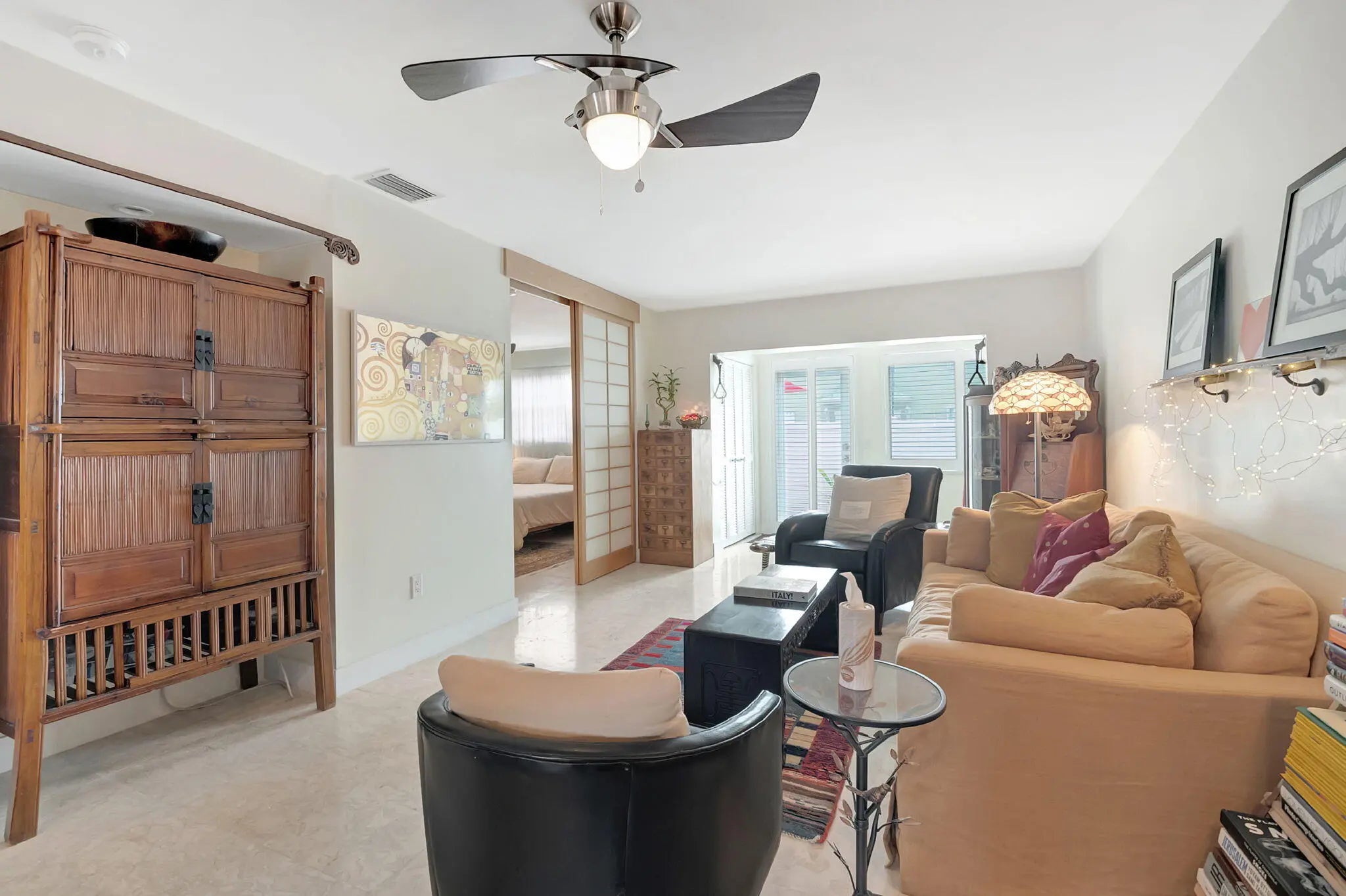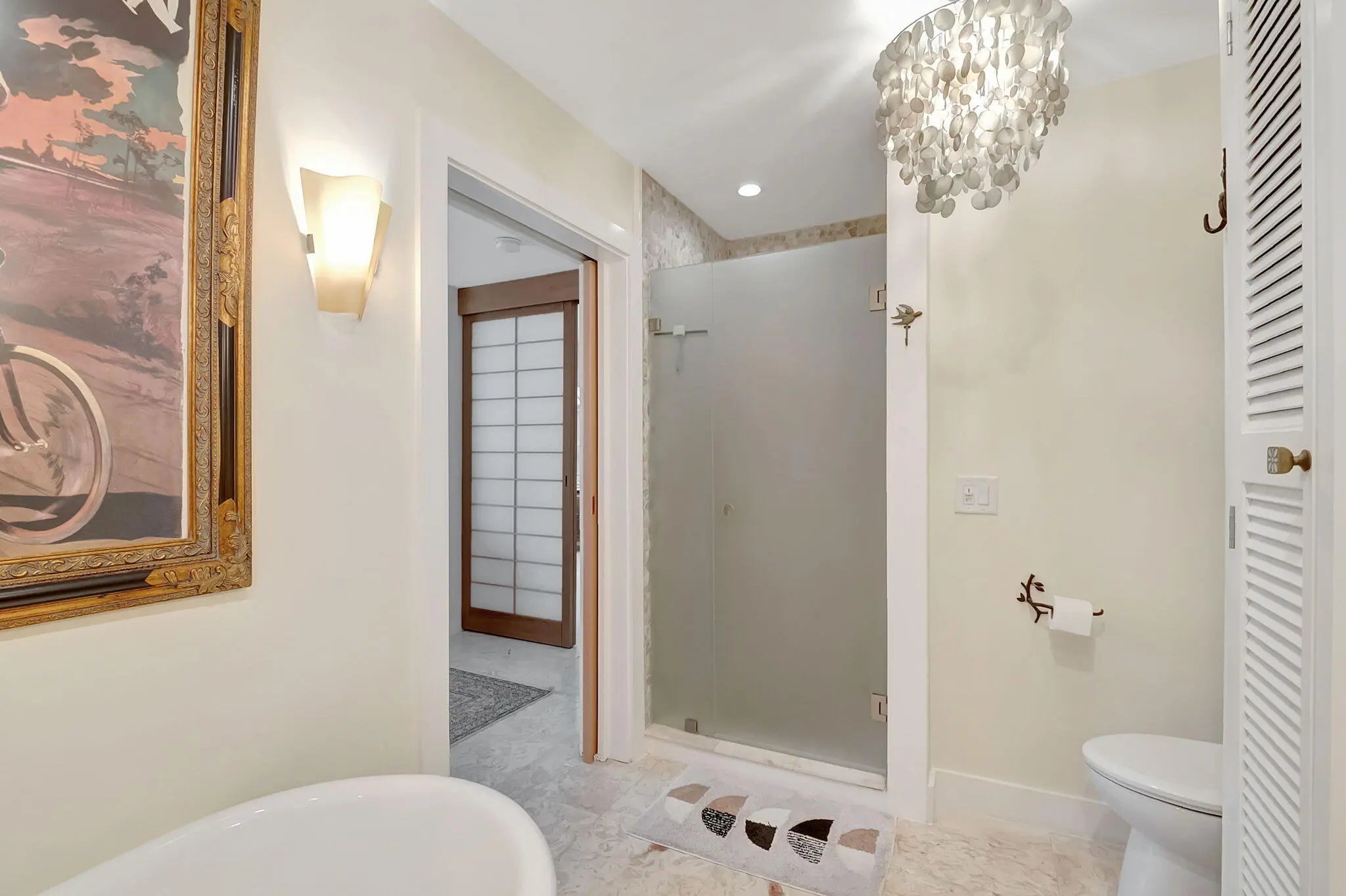 MOTIVATED SELLER! Discover this serene, peaceful beachside haven! Steps from a private beach, this 1st floor 55+ Coop has special touches; floating wall Shoji screens, shell stone floors, custom raw edge granite kitchen counters, primary bathroom suite with claw foot tub, double sink 'bureau' vanity, and stone glass enclosed walk in shower. Custom tile shower off guest bedroom/den. Samsung 'frame' tv. Open floor plan kitchen features retro refrigerator with room for a large table. Walk in closet with stack washer/dryer, tankless water heater. Amenities; private beach with the only gazebo/pavilion in Ocean Ridge, heated pool, clubhouse, shuffleboard and bocce courts,and BBQ grill. Minutes to dining, shopping and nightlife in downtown Delray Beach and Boynton Beach!