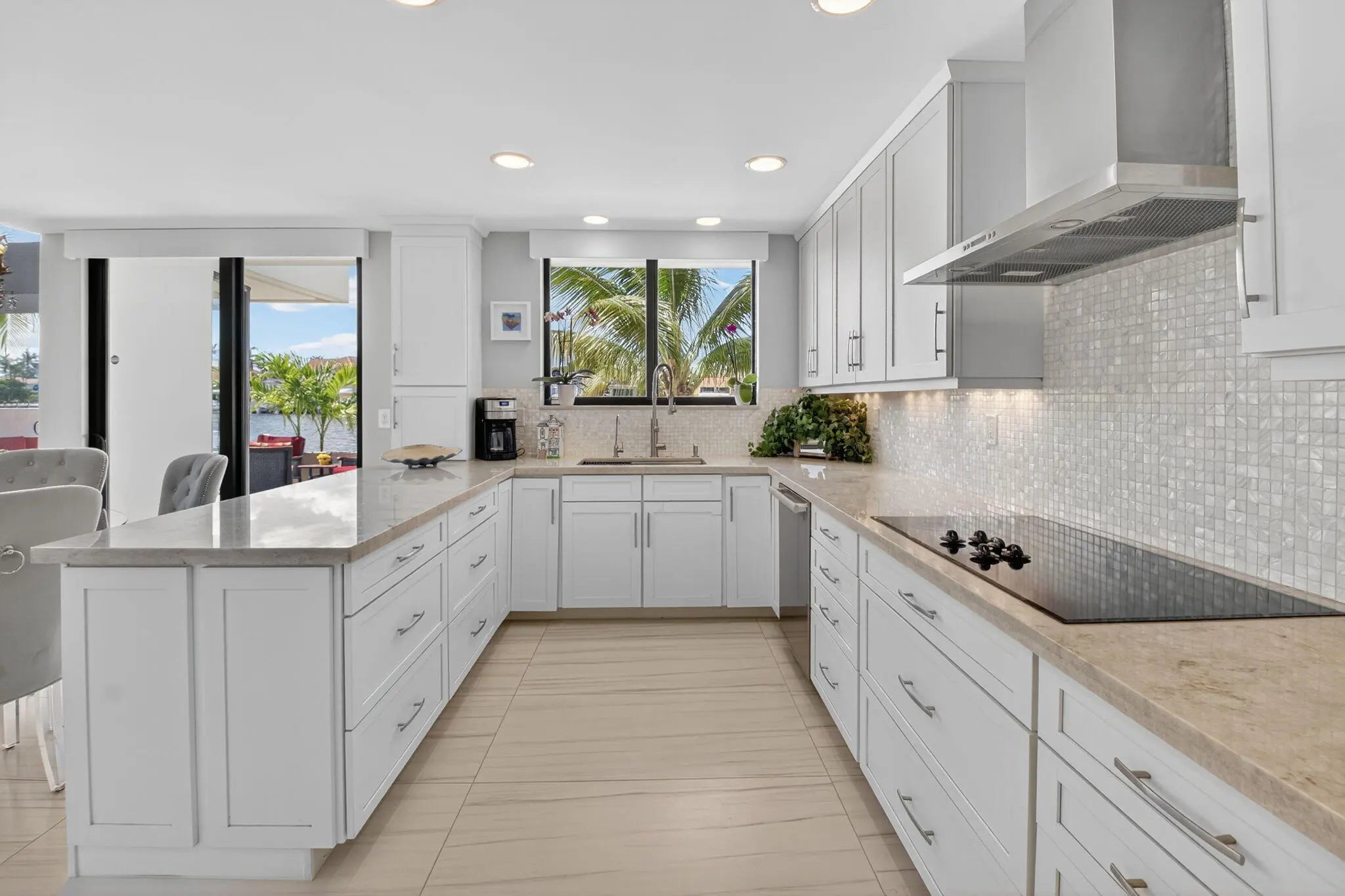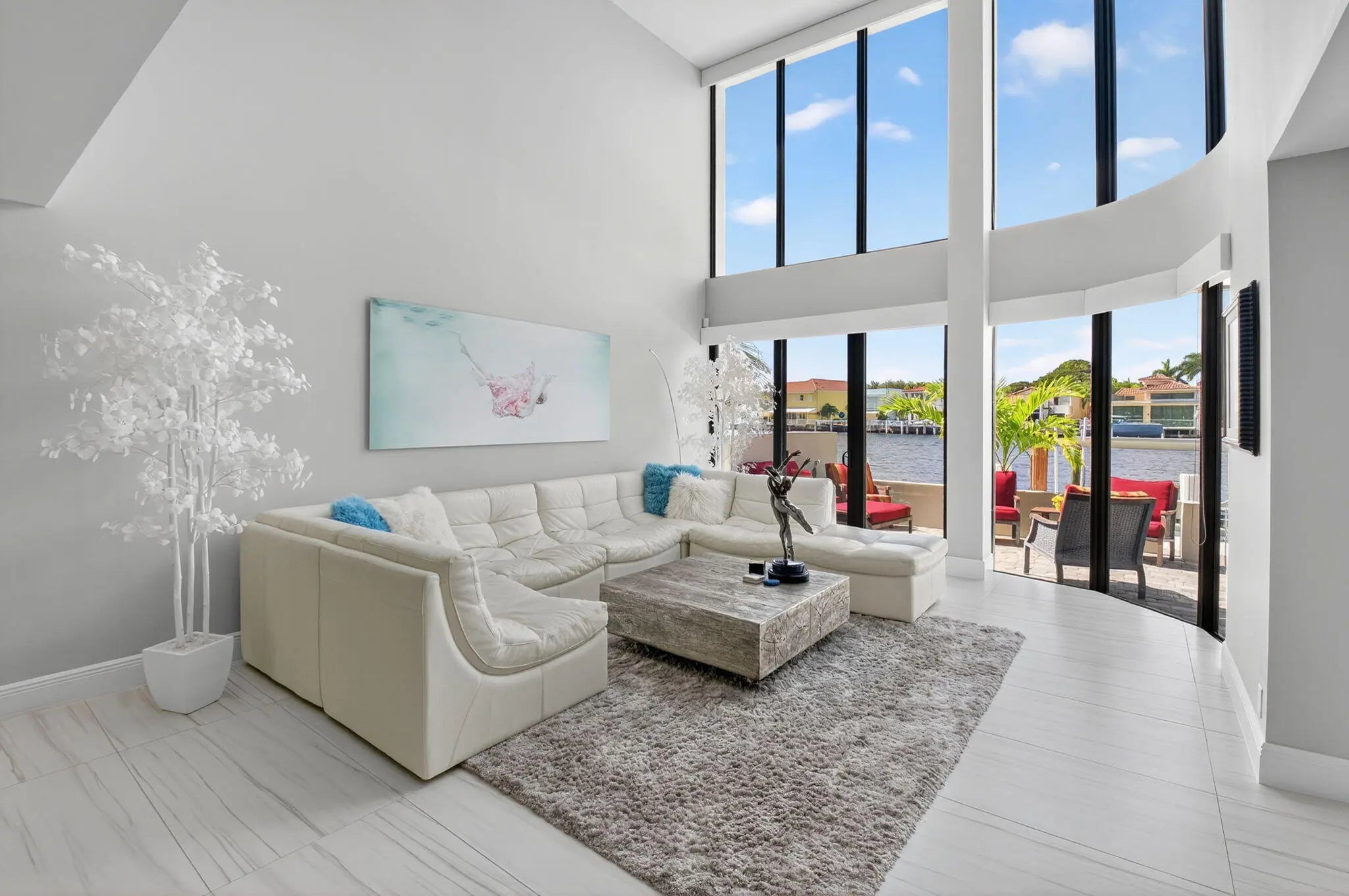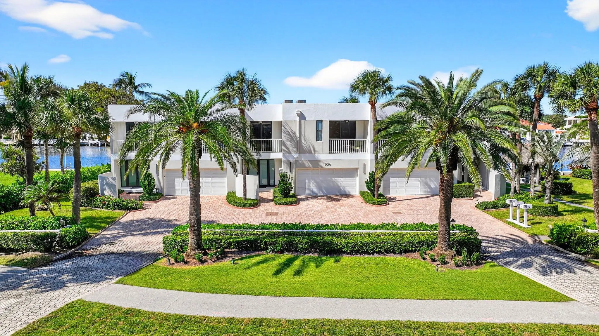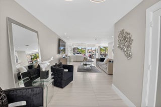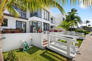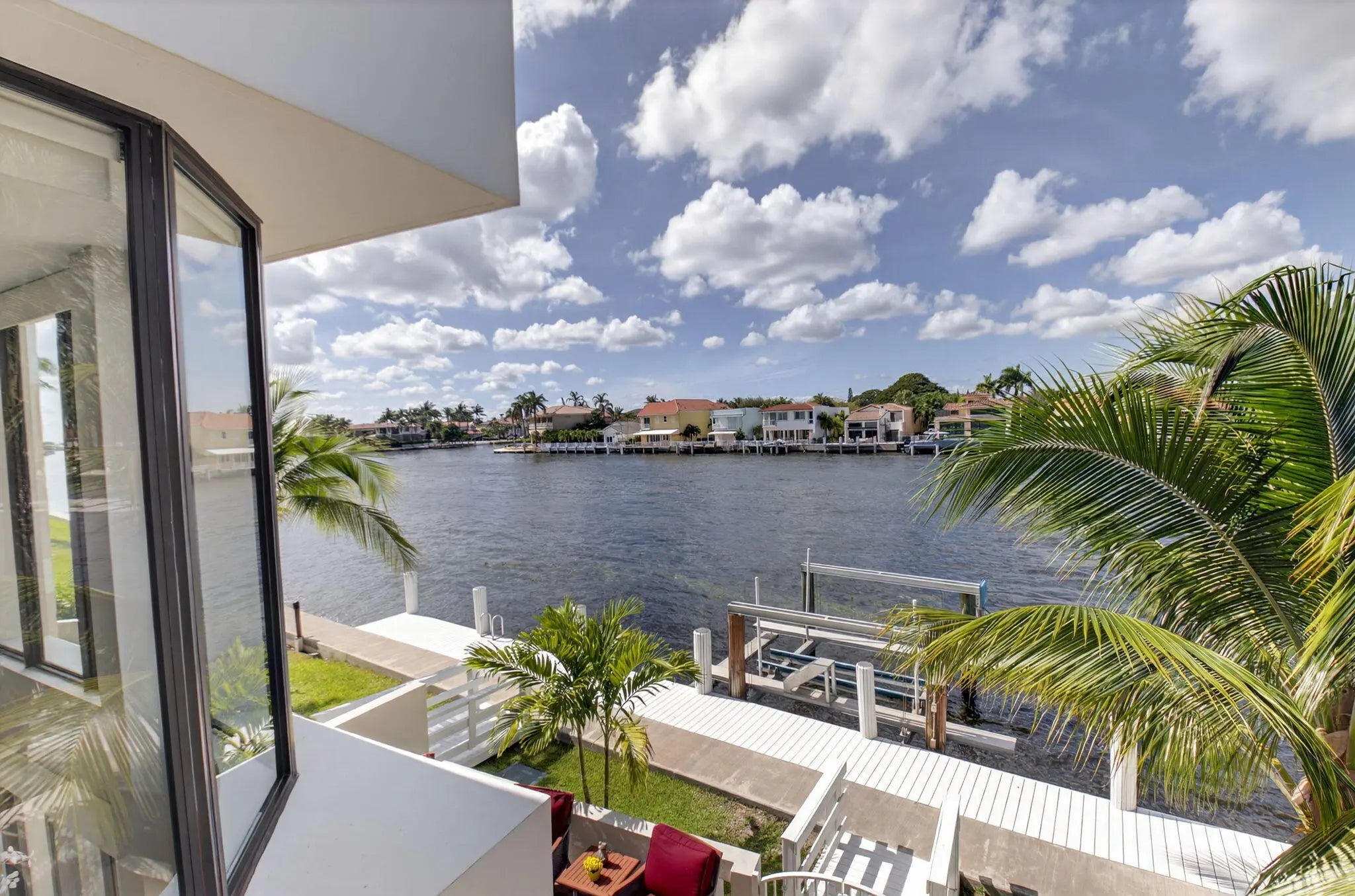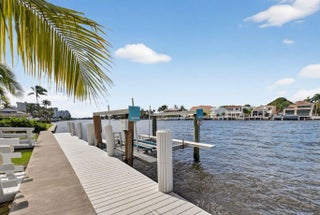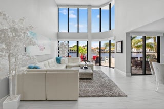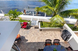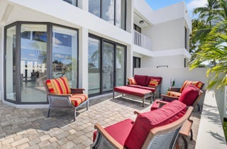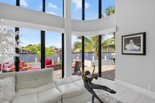 Enjoy an elegant, modern townhouse lifestyle on the intracoastal, with beach access! A dramatic double-height living room showcases curved, floor-to-ceiling impact glass windows with motorized shades. Watch breathtaking sunsets and the boats going by from your terrace, living and dining room, kitchen, office and primary bedroom! Upstairs is luxurious cherrywood flooring, frosted glass French doors and ample closets! The Office is next to a grand primary suite, with an oversized spa-inspired bath. The 2 guest suites have terraces, modern baths with inlay tiles and glass shower enclosures. Entertain alfresco on the expansive deck and barbecue area with a retractable awning. A 20-foot boat lift holds up to 10,000 lbs. The side garden features a Tiki hut and a convenient day dock.