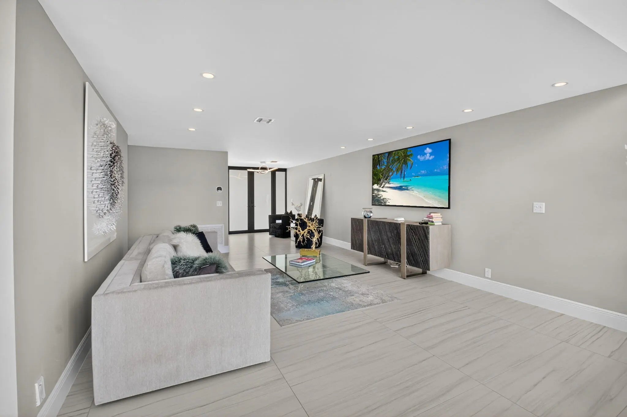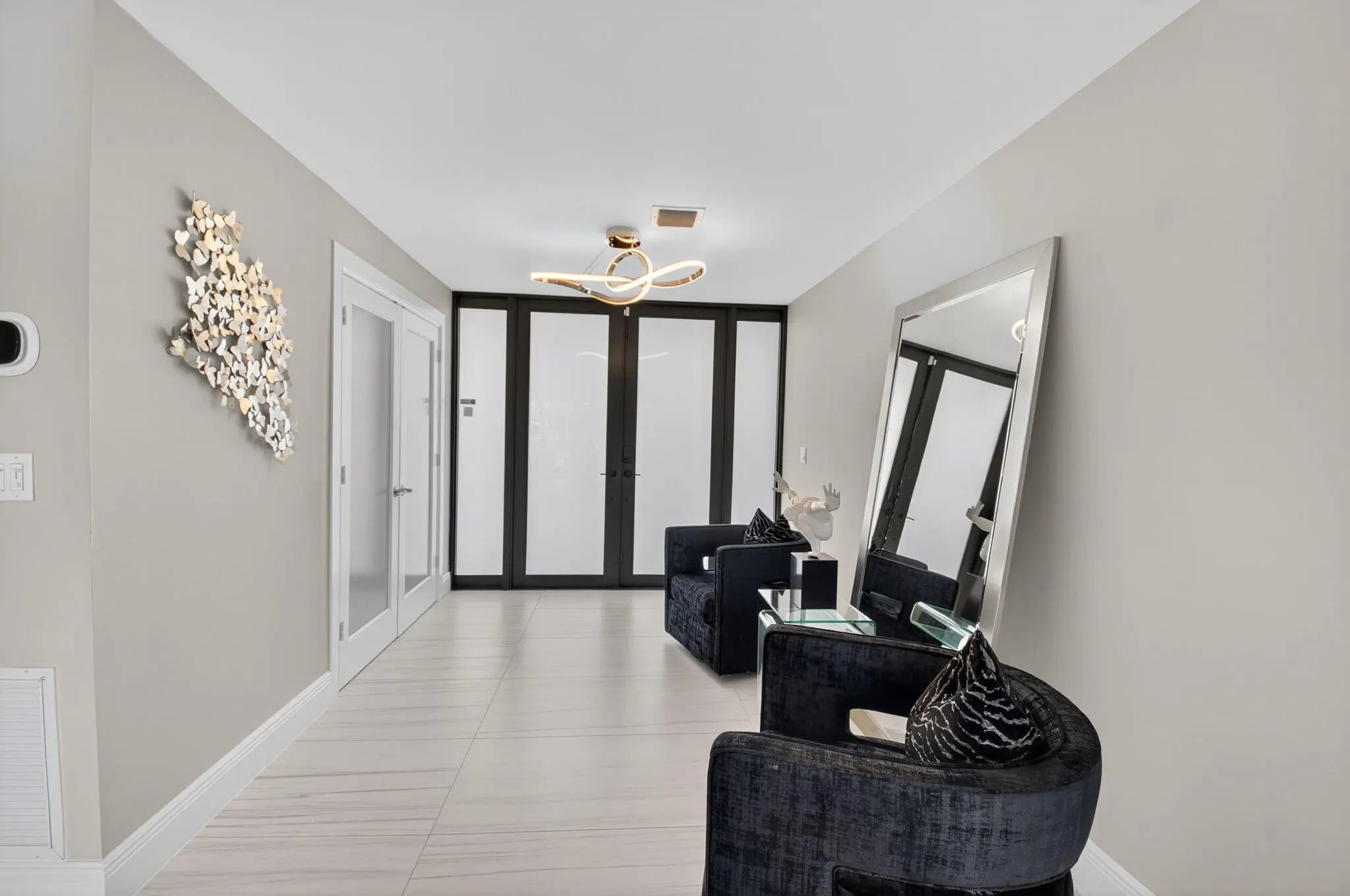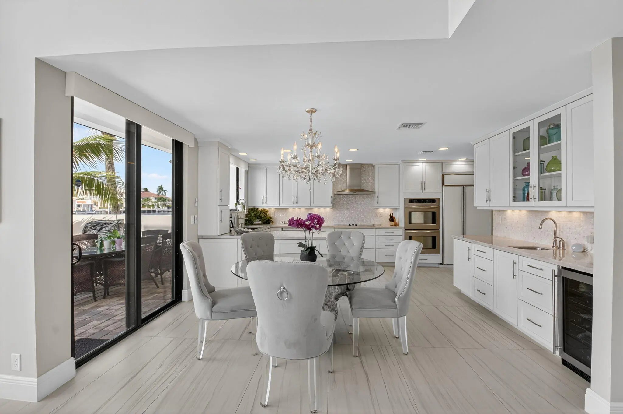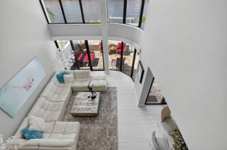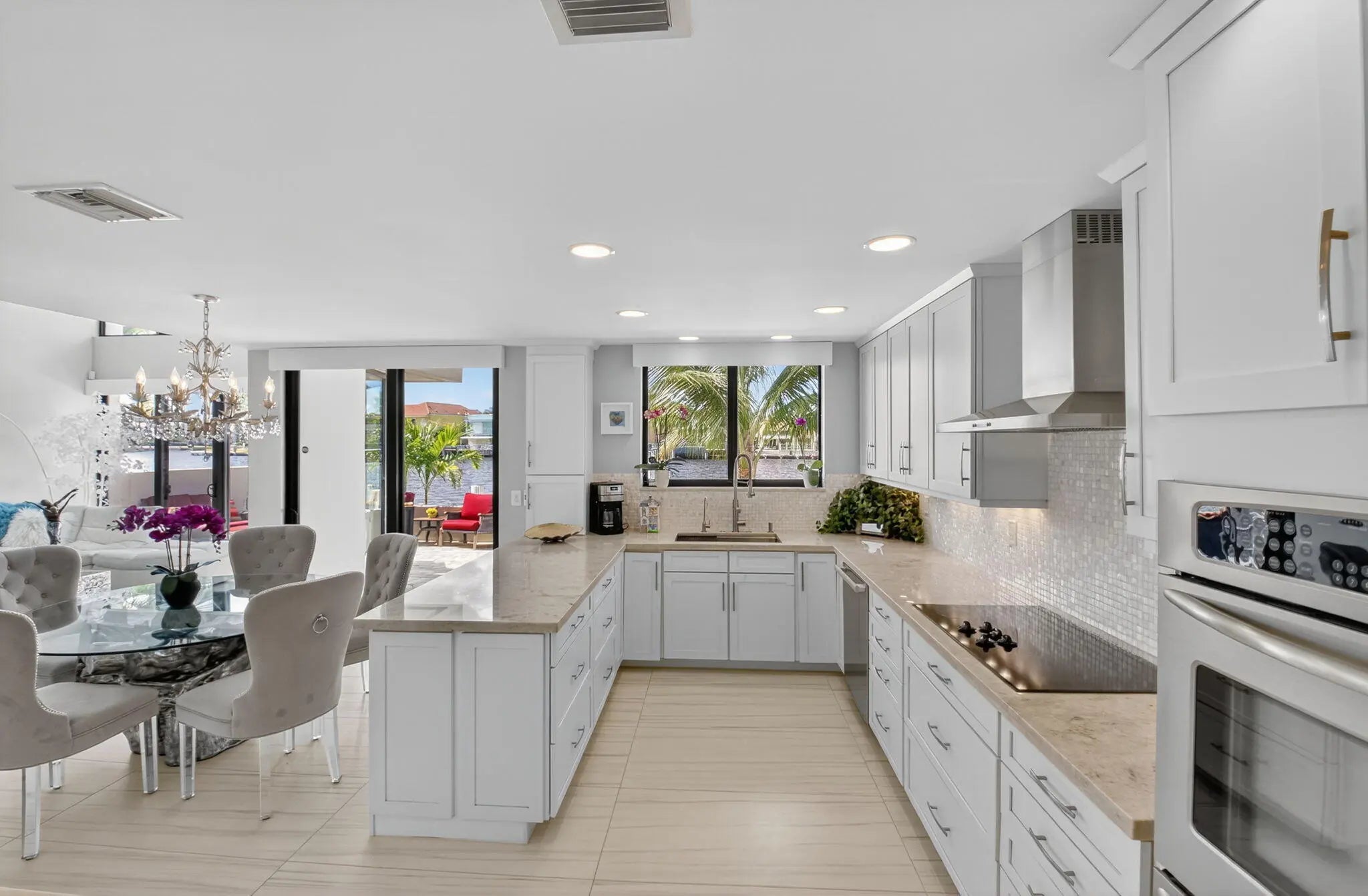 Enjoy an elegant, modern townhouse lifestyle on the intracoastal, with beach access! A dramatic double-height living room showcases curved, floor-to-ceiling impact glass windows with motorized shades. Watch breathtaking sunsets and the boats going by from your terrace, living and dining room, kitchen, office and primary bedroom! Upstairs is luxurious cherrywood flooring, frosted glass French doors and ample closets! The Office is next to a grand primary suite, with an oversized spa-inspired bath. The 2 guest suites have terraces, modern baths with inlay tiles and glass shower enclosures. Entertain alfresco on the expansive deck and barbecue area with a retractable awning. A 20-foot boat lift holds up to 10,000 lbs. The side garden features a Tiki hut and a convenient day dock.
