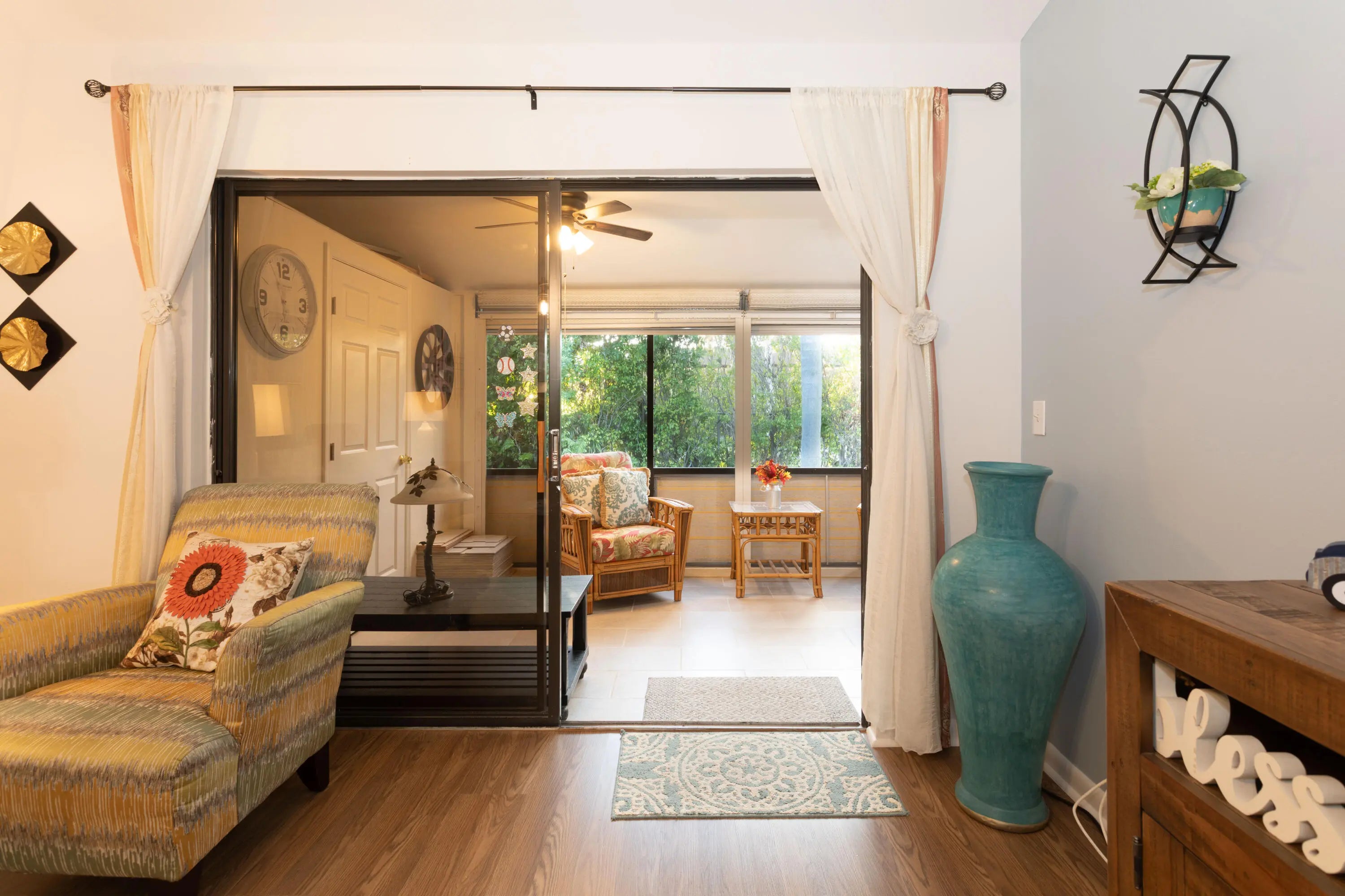 ***!!PRICE IMPROVEMENT!!*** Welcome to The Arbours, a highly sought-after 55+ community offering a peaceful lifestyle with resort-style amenities including a clubhouse, sparkling pool, and tennis courts. Step inside this beautifully updated 3-bedroom, 2-bath villa featuring soaring vaulted ceilings, a spacious open layout, and a private courtyard entry leading to a serene, screened patio—perfect for relaxing or entertaining. Both bathrooms have been completely renovated, and the kitchen shines with updated cabinets, pantry, and newer appliances including a 2019 A/C, new sink and disposal, newer dishwasher, washer & dryer (2 yrs), kitchen (4 yrs), new hood, and water heater (1 yr). Additional highlights include a 5-year-old roof, all-new flooring throughout, and accordion shutters for peace of mind. This desirable corner unit offers privacy with no direct neighbor on one side and three assigned parking spaces right in front. The $532 monthly HOA covers cable, internet, water, landscaping, exterior upkeep, and roof maintenance. Move-in ready and meticulously maintained this villa truly captures the best of comfort, style, and convenience in The Arbours!