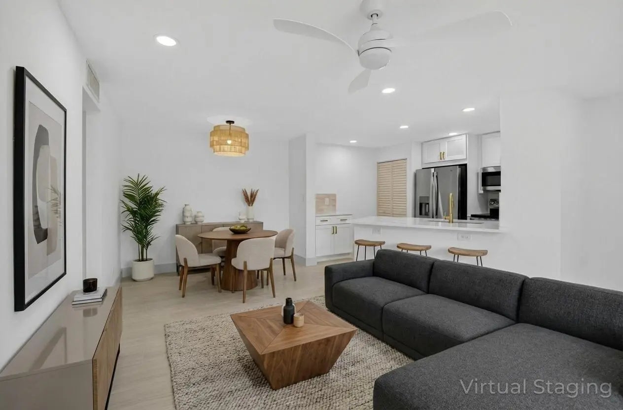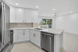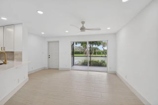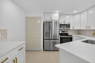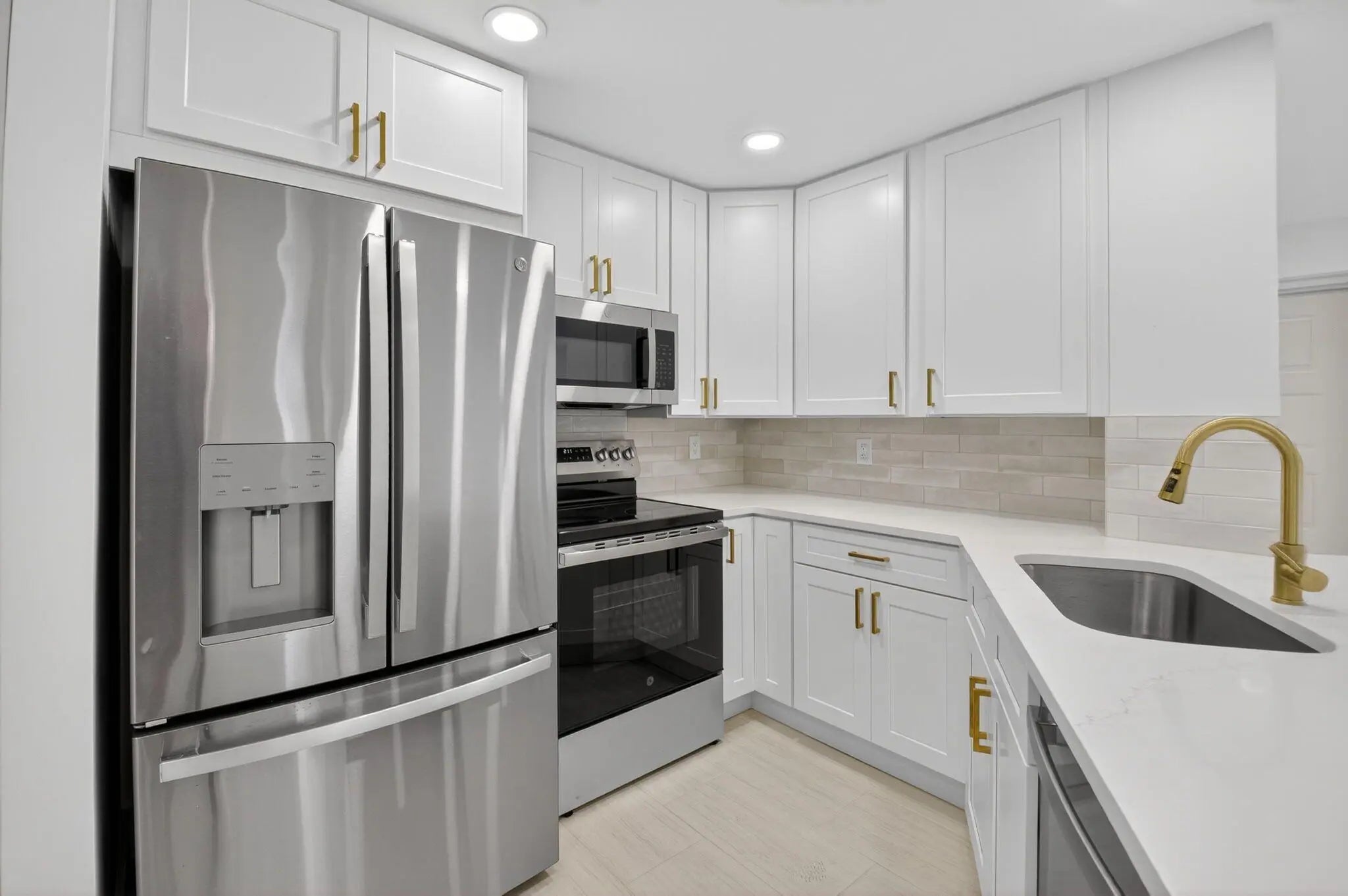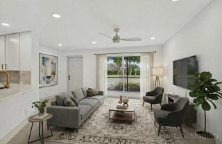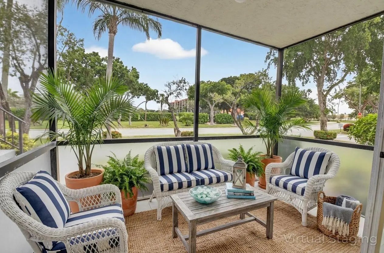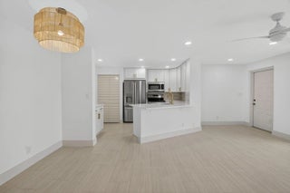 Experience turn-key perfection in this stunningly reimagined 2-bedroom, 2-bathroom residence. No detail was spared in this complete 2025 renovation, featuring sleek ceramic tile flooring, modern base moldings, and designer recessed lighting throughout. The chef-inspired kitchen is a showstopper, boasting pristine quartz countertops and a brand-new stainless steel appliance suite. Relax in the primary retreat, complete with a custom walk-in closet and built-in shelving, or enjoy the Florida breeze from your private, screened covered patio. With a brand-new A/C (2024) and an in-unit washer/dryer, this home offers total peace of mind. Located just minutes from the Turnpike and the vibrant dining scene of Atlantic Avenue, this is the sophisticated 55+ retreat you've been waiting for.
