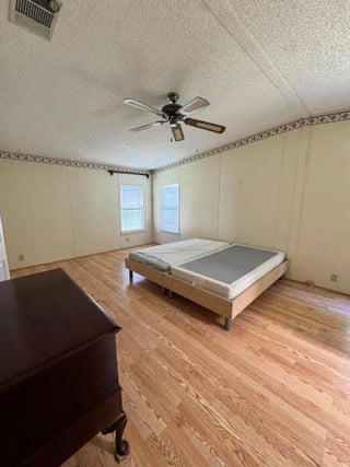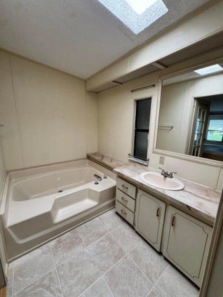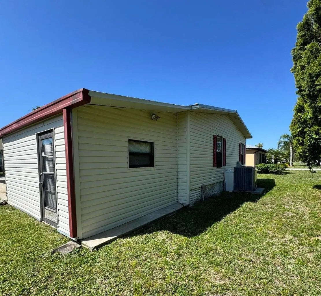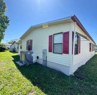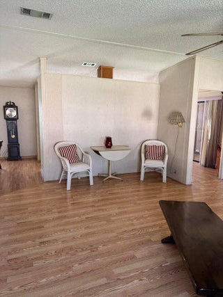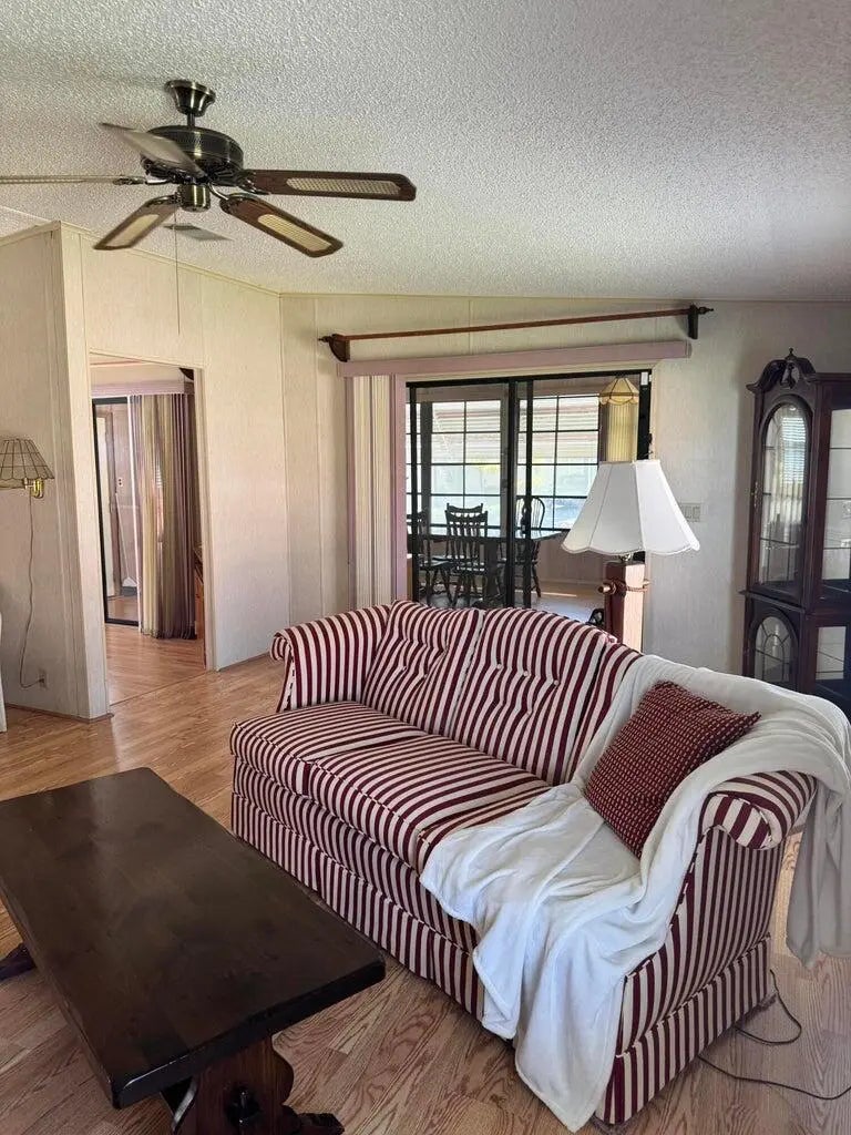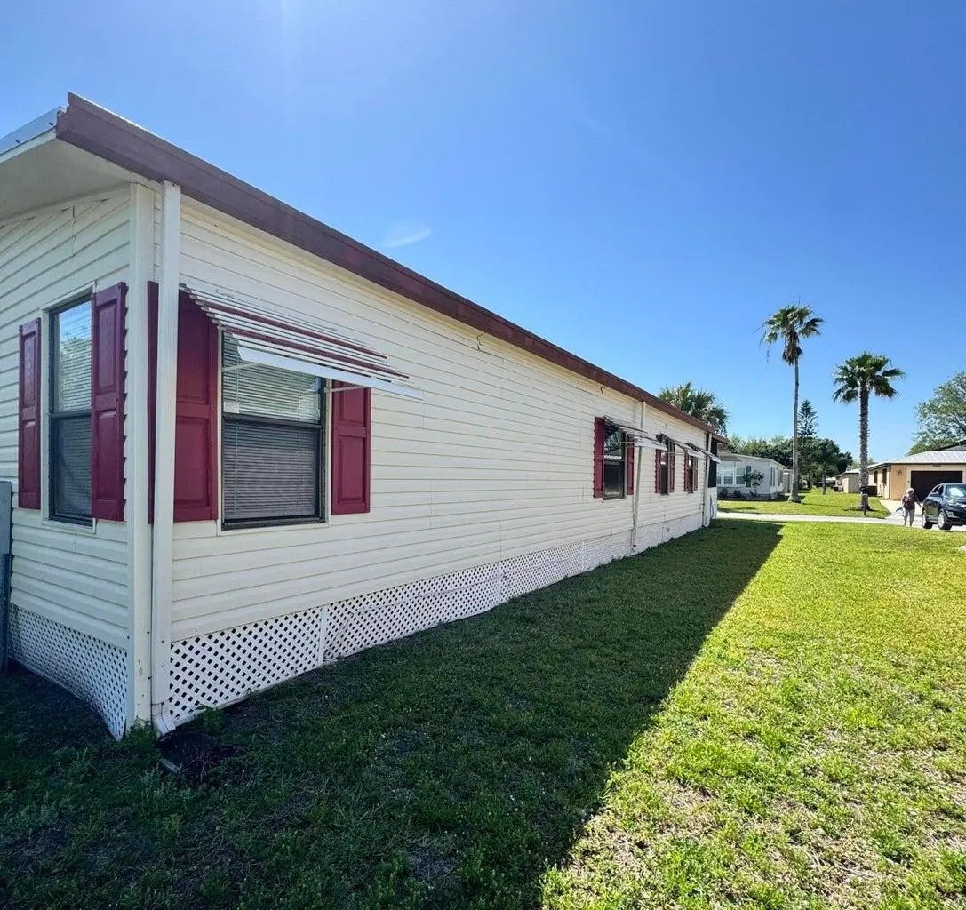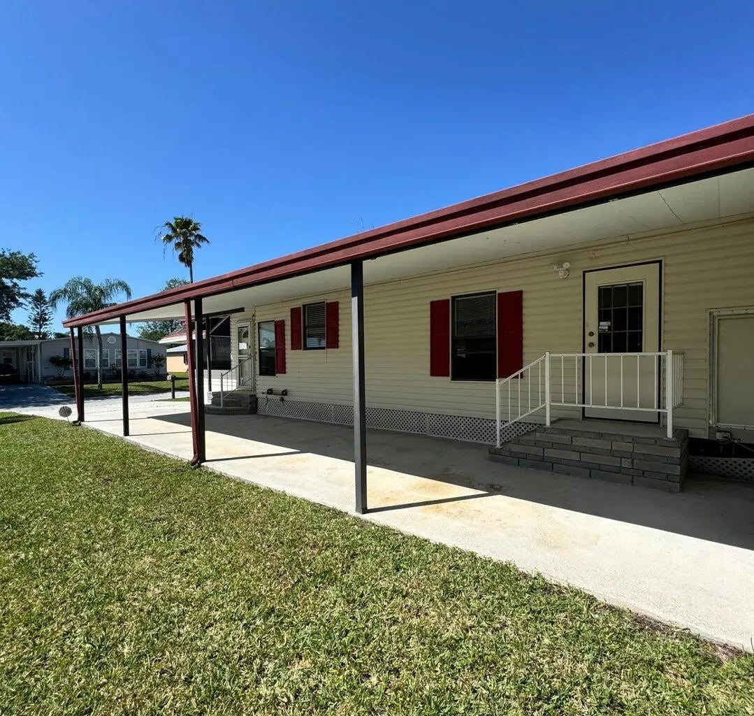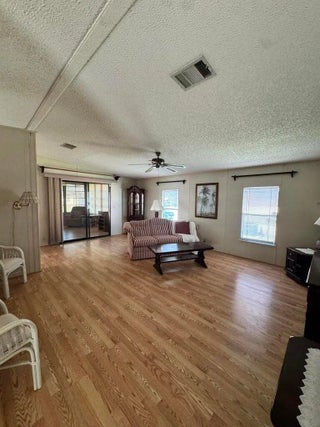 2 Bedroom 2 bath home on a quiet street in the desirable 55+Spanish Lakes Fairways community. The home has a large front room, 14x22, that opens up to the kitchen and living area. Home has NO carpet. Laminate flooring throughout. The primary bedroom is the full width of the home. Large carport big enough for three cars. Private backyard. The home has two sheds for added storage. Roof is metal, 2023. A/C 2016. Water Heater 2021. Home is being sold partially furnished. Lawn care and trash removal included in lot rent. 2 pools, tennis, pickleball, bocce, shuffleboard, 18-hole golf course: clubhouse and much more.
