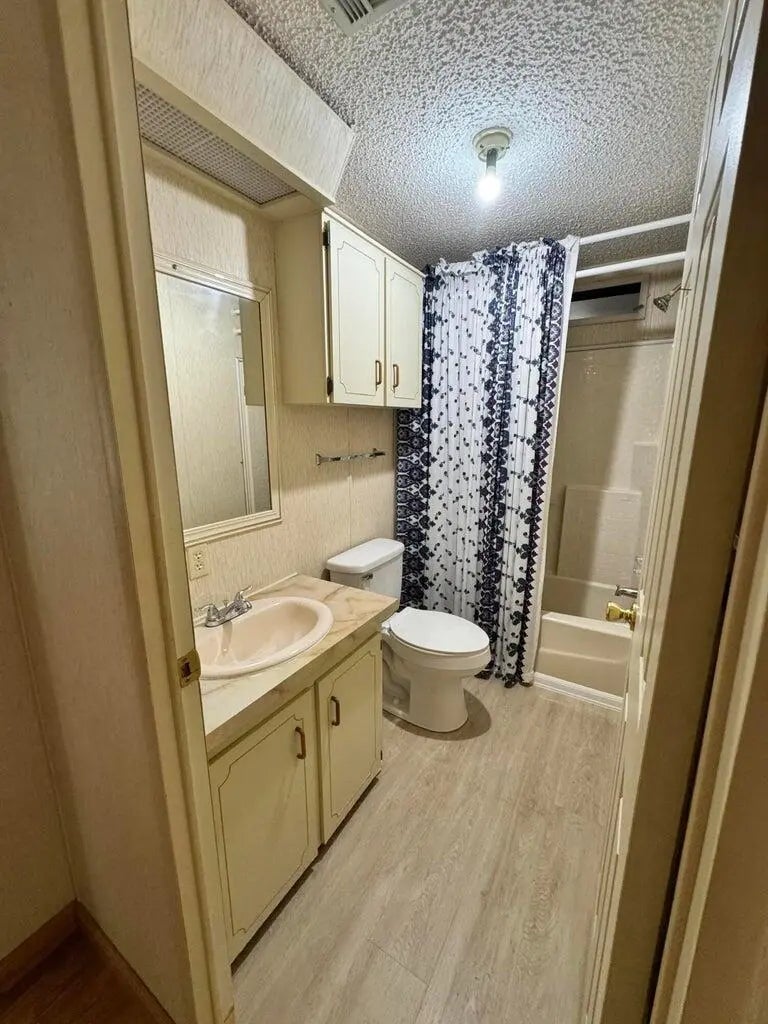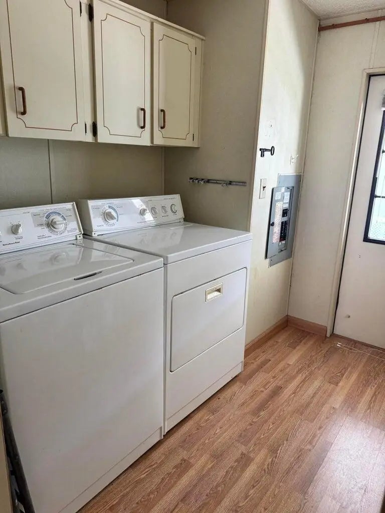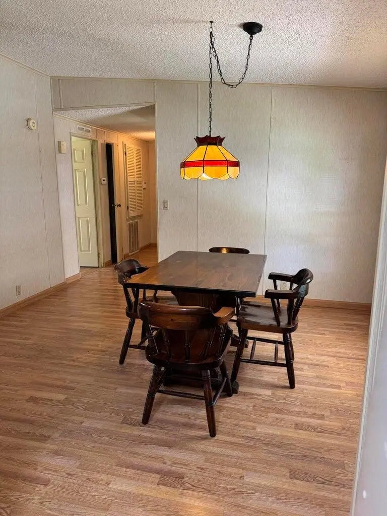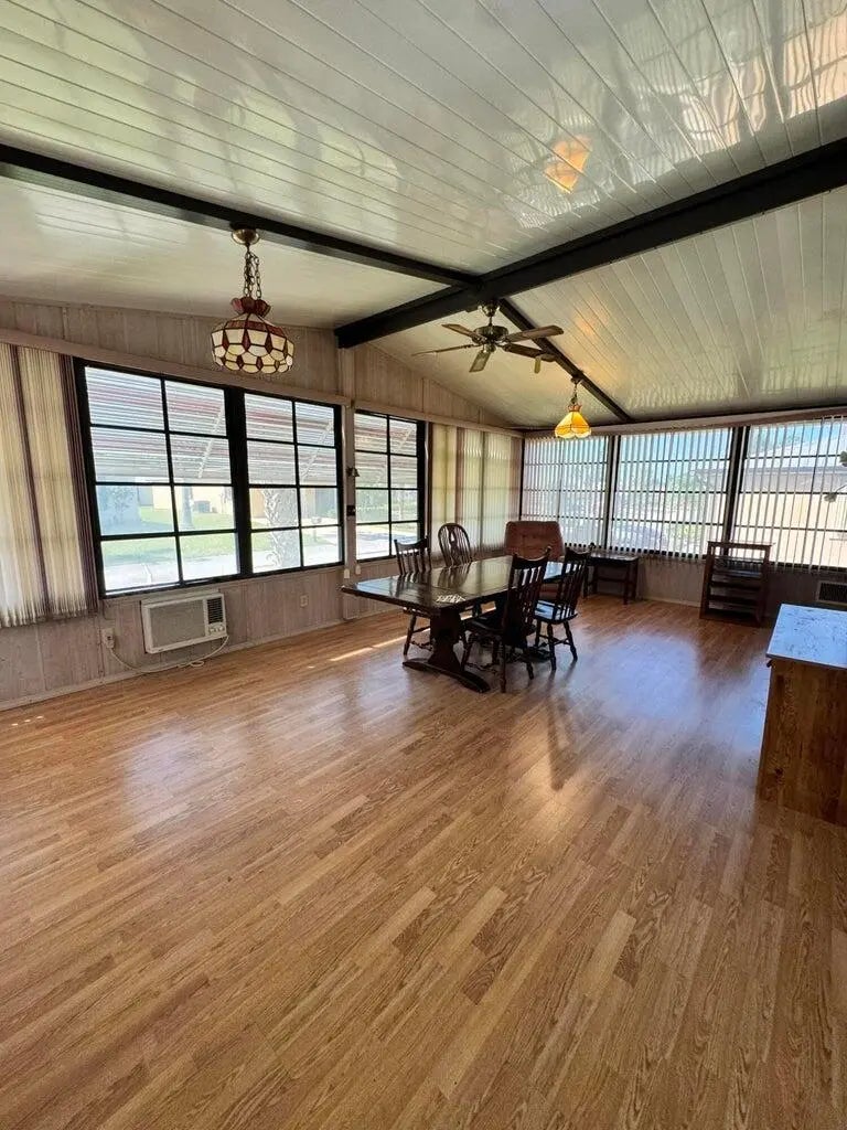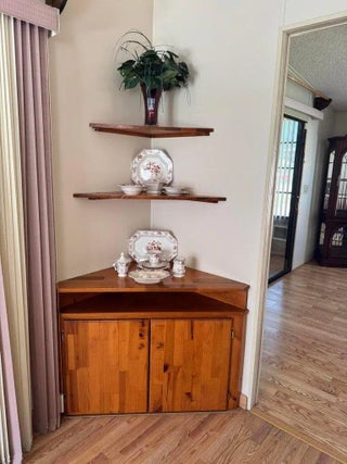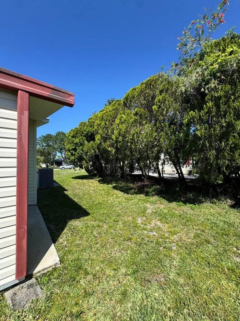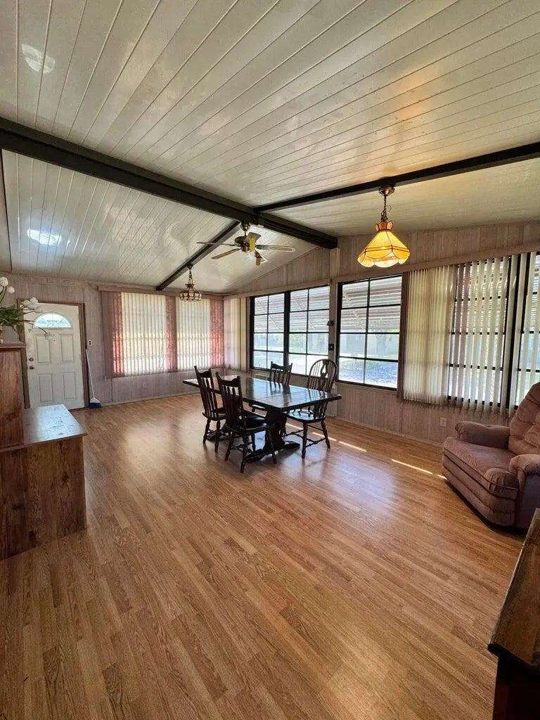 2 Bedroom 2 bath home on a quiet street in the desirable 55+Spanish Lakes Fairways community. The home has a large front room, 14x22, that opens up to the kitchen and living area. Home has NO carpet. Laminate flooring throughout. The primary bedroom is the full width of the home. Large carport big enough for three cars. Private backyard. The home has two sheds for added storage. Roof is metal, 2023. A/C 2016. Water Heater 2021. Home is being sold partially furnished. Lawn care and trash removal included in lot rent. 2 pools, tennis, pickleball, bocce, shuffleboard, 18-hole golf course: clubhouse and much more.