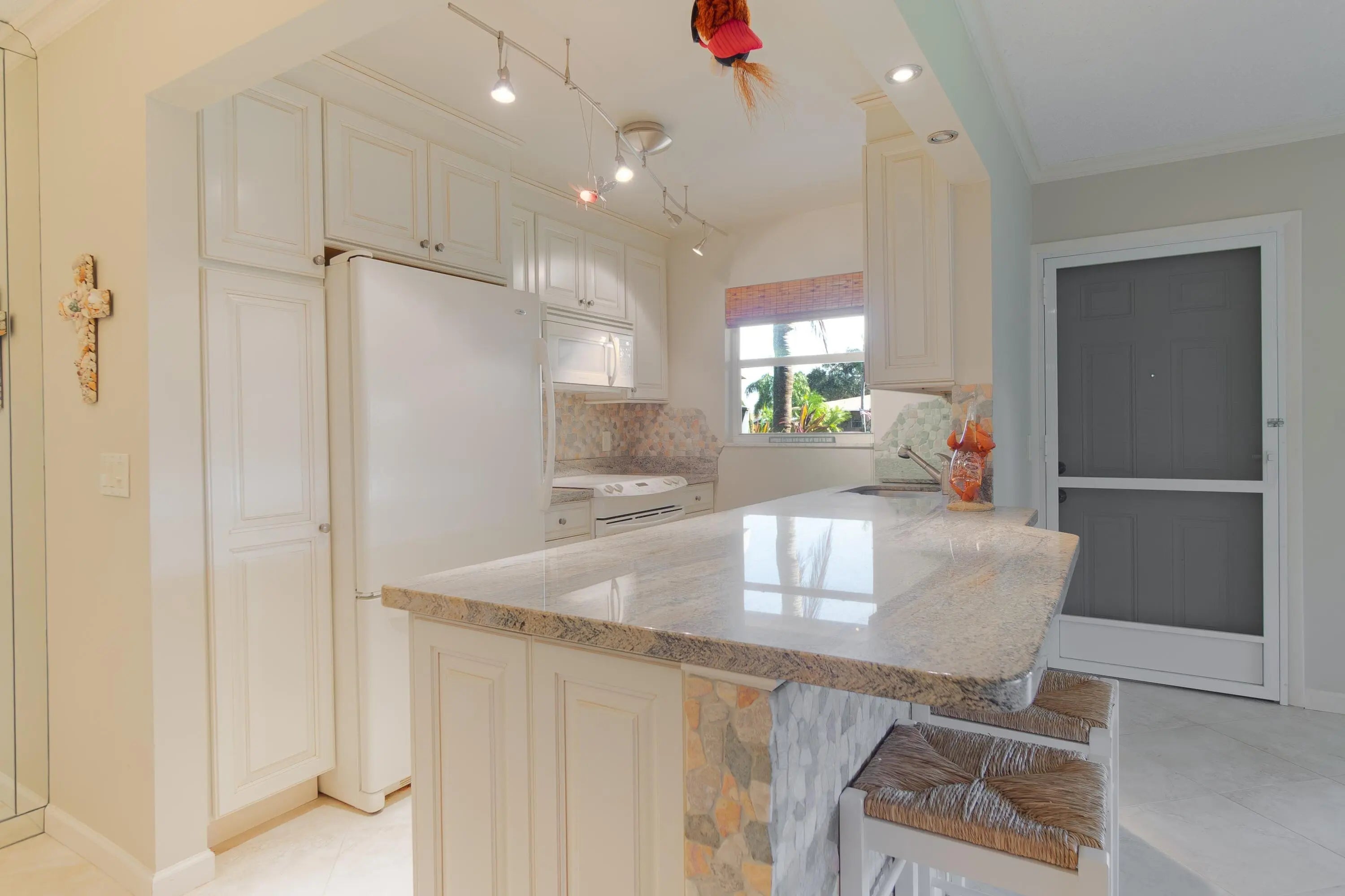 Stylish two bedroom, two Bath 1st floor villa-style condo with Travertine Tile floors throughout. End Unit. Kitchen is opened up to the living room creating an airy feel. Quality Thomasville cabinetry in kitchen and baths. Hall bathroom has a walk-in shower. Front Florida room porch is used as a Den. Rear Open patio with privacy landscaping. Front and rear screen doors added to catch those beautiful balmy winter breezes. Enjoy the Florida lifestyle you deserve. Only 5 miles to the Public Beach! Brand New Electrical panels just installed inside and out! Roof - 2018, A/C - 2019. Washing machine in master suite is included in the sale.