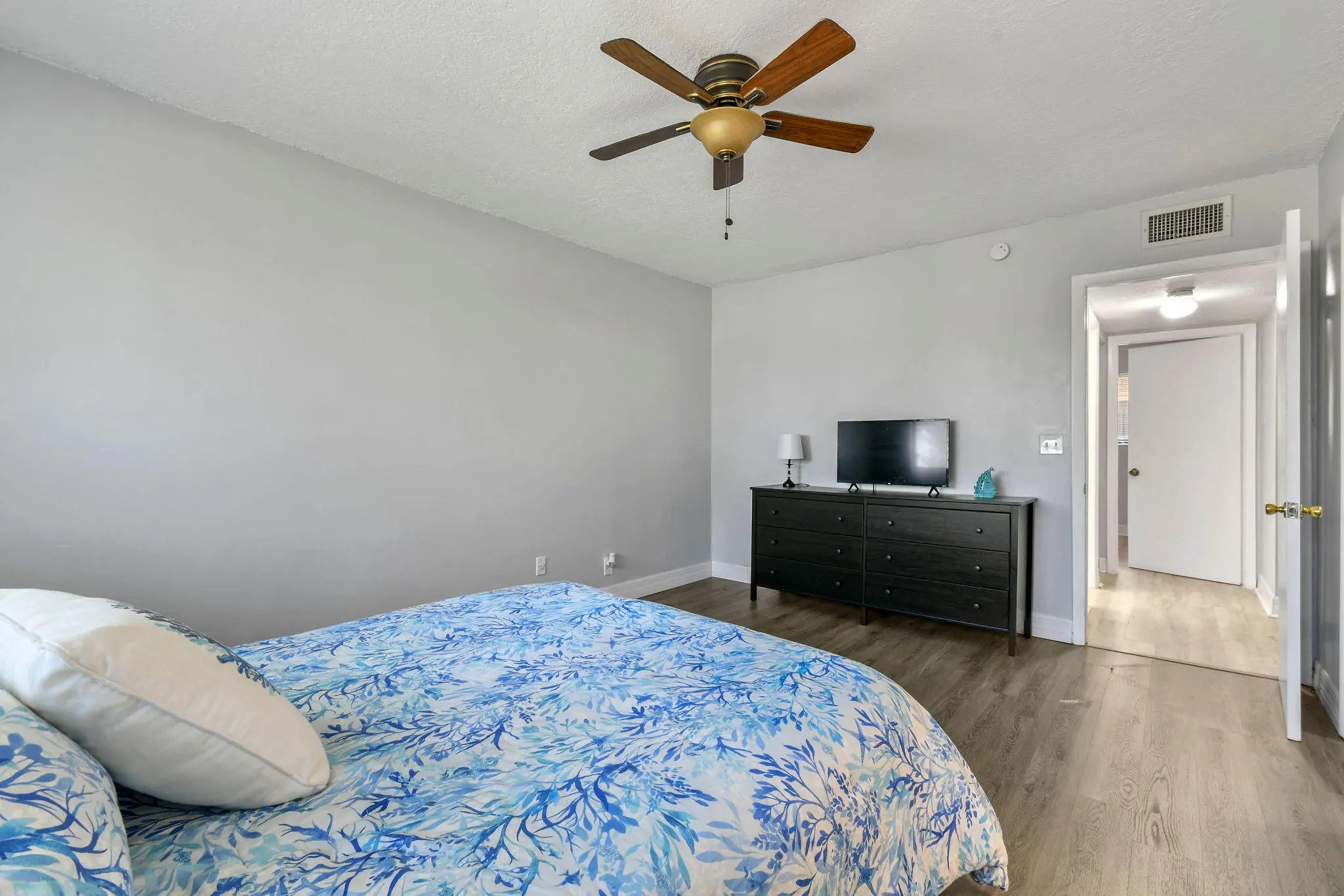 This beautiful top-floor, garden-style condo boasts 3 bedrooms and 2 baths in the highly sought-after Las Verdes community, a non-age-restricted building. The condo features laminated flooring throughout and an updated kitchen with white cabinets and granite countertops. Sliding doors off the kitchen lead to a private screened balcony. Las Verdes offers a host of amenities, including a 24/7 manned gate, a central lake for leisurely walks, three pools, two Jacuzzis, a fitness center, and courts for tennis, pickleball, and bocce ball. Conveniently located 4 miles from Downtown Delray, and is just minutes away from shopping, dining, hospital and I-95.