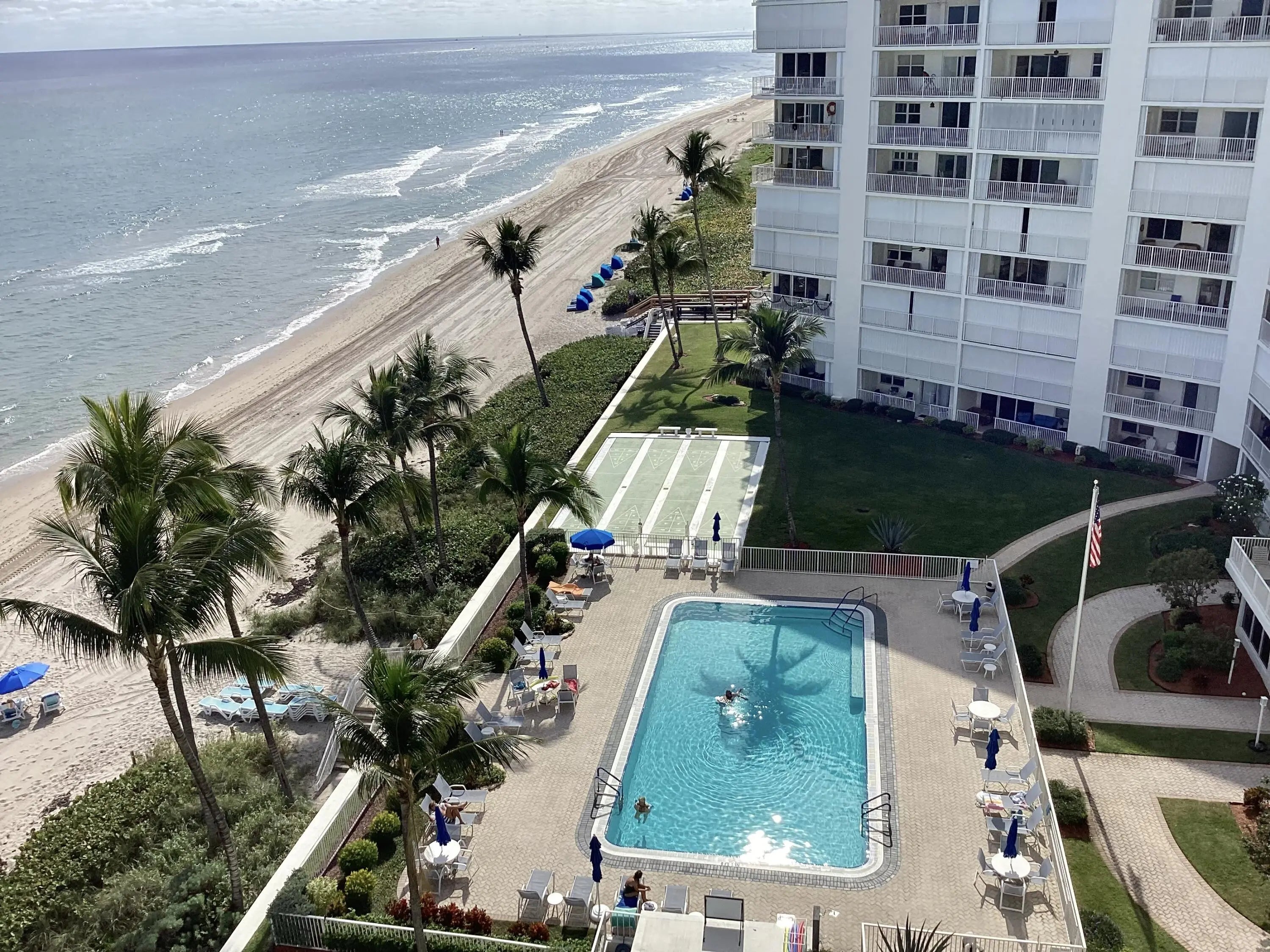 LOCATION! LOCATION! LOCATION! This fully furnished 2 bedroom/ 2 bathroom has direct ocean frontage with large balcony views from kitchen, living room, primary suite and balcony. It is tastefully furnished equipped with kitchen, bedding, bath inventory items. The building has covered parking, activity/card room, library, fitness area. The pool is surrounded by green space and tropical palms adjacent to beach access with lounge chairs just waiting for you! This highly desirable Highland Beach location is nestled between Boca Raton and Delray Beach close to restaurants, shopping, and downtown activities. Available for annual rental or six months + day. Donâ™t miss this opportunity to enjoy sunrise over the ocean and moon lite ocean views!