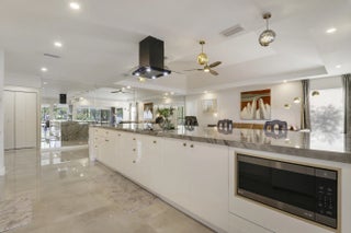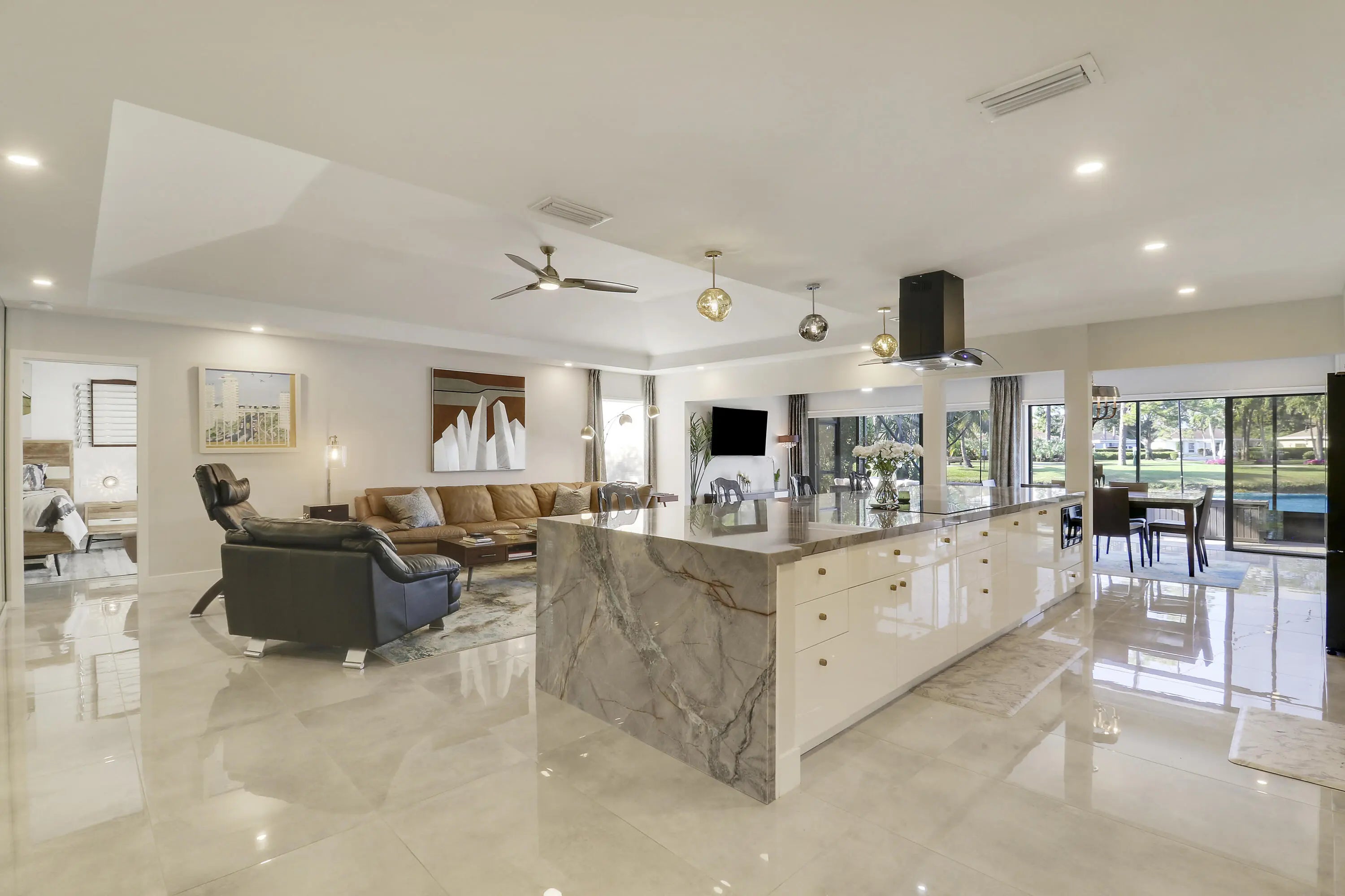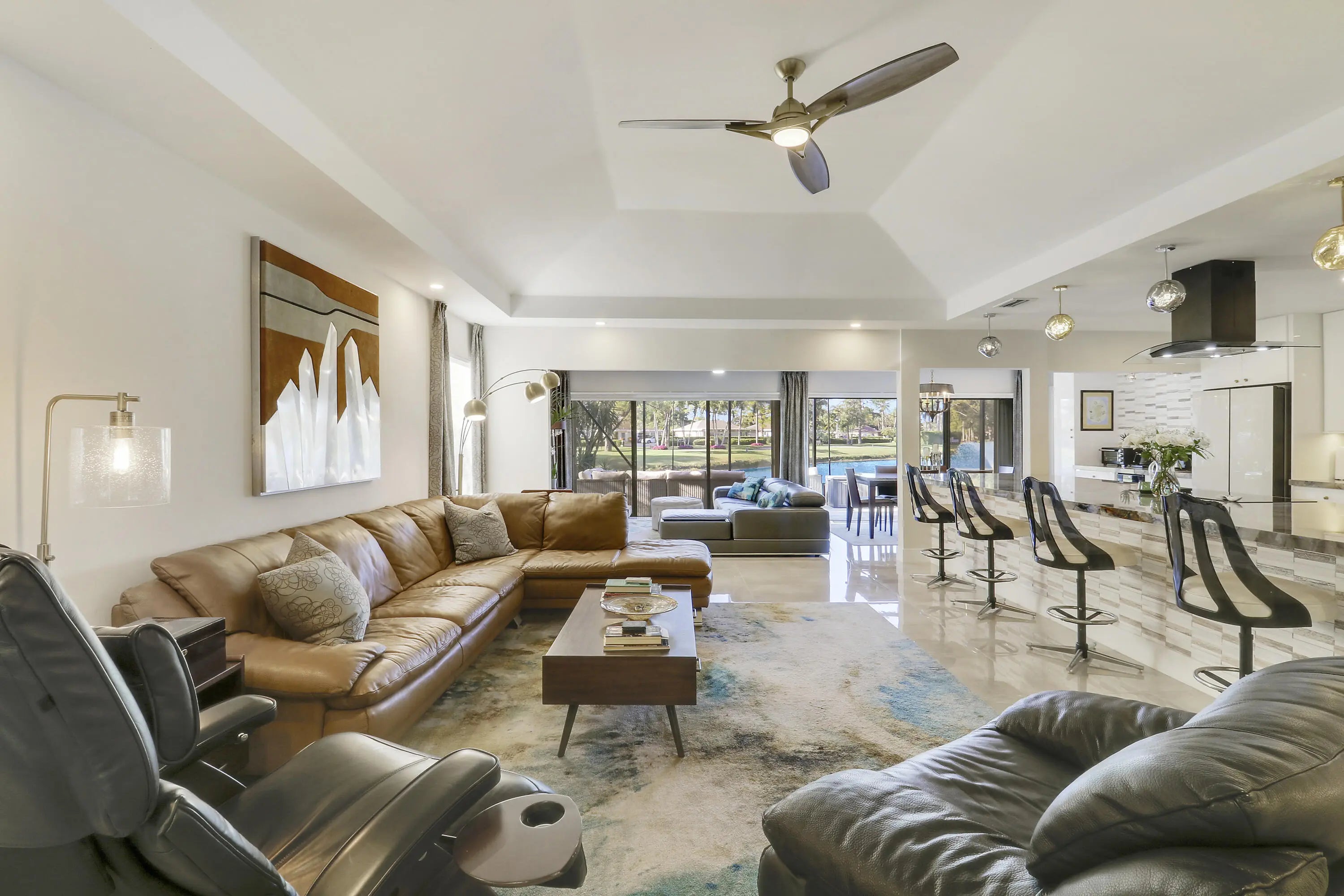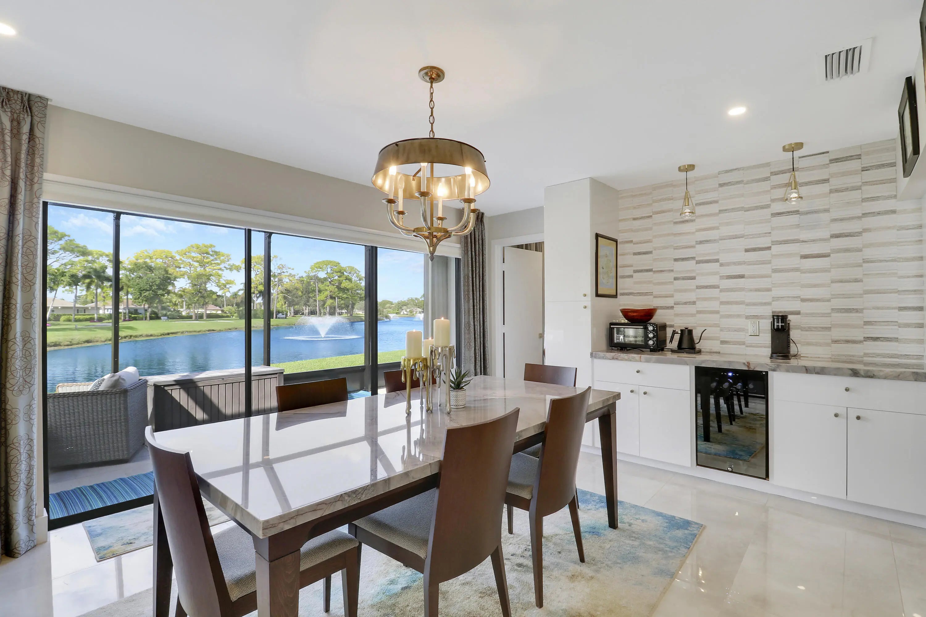 Welcome to 13397 Garth Court, an exceptional lakefront residence in Eastpointe Country Club. Completely reimagined in 2023 by award-winning EcoDecor Design Company, this 3-bed, 3-bath, 2,534 sq ft home offers modern luxury and timeless comfort. Abundant natural light and wall-to-wall sliders frame sweeping lake views. Large-format porcelain tile flows throughout. The showstopping kitchen features a 17-ft Brazilian Blue Ijen quartzite waterfall island, matching countertops, backsplash, and custom dining table. Premium black stainless appliances include double convection ovens, induction cooktop & bespoke Samsung refrigerator. Primary suite is a spa-like retreat with a double walk-in shower, soaking tub, and custom closet. New 2025 A/C and water heater, 2021 roof, full wind mitigation. Two-car garage plus golf cart garage -golf cart conveys! Steps to the first tee, driving range, pool and East clubhouse. Lakefront living at its finest.