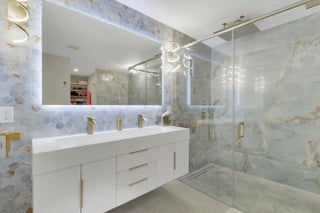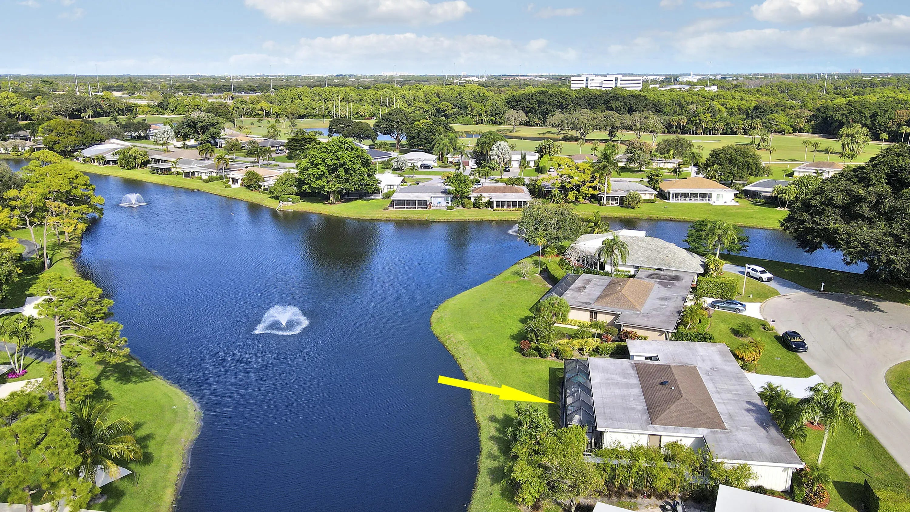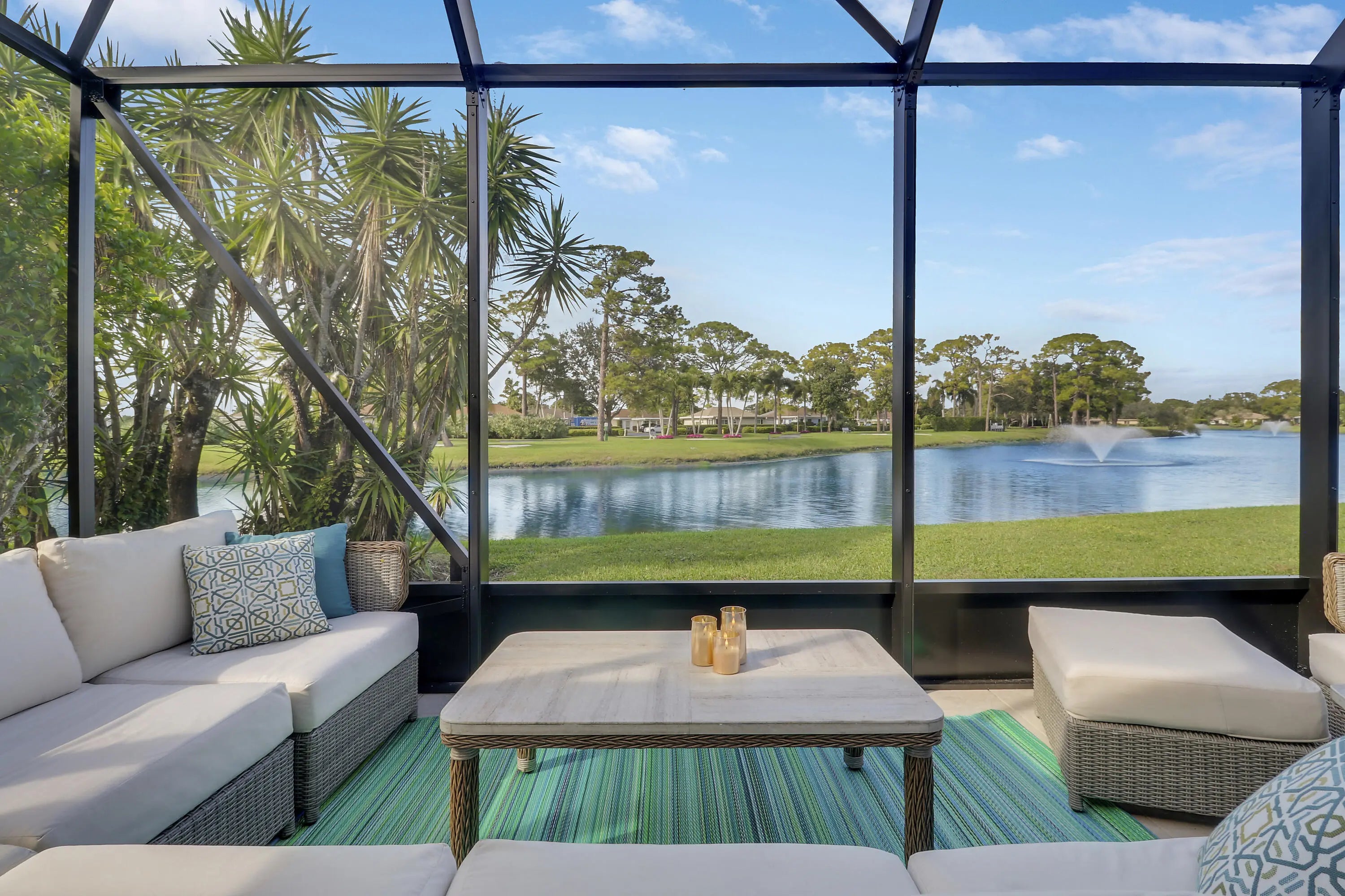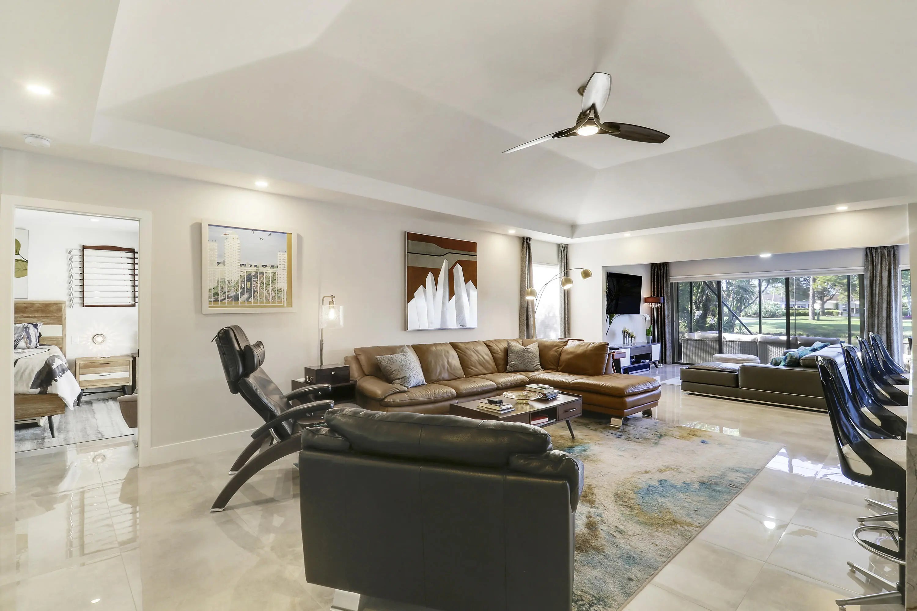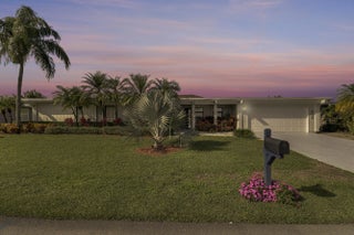 Welcome to 13397 Garth Court, an exceptional lakefront residence in Eastpointe Country Club. Completely reimagined in 2023 by award-winning EcoDecor Design Company, this 3-bed, 3-bath, 2,534 sq ft home offers modern luxury and timeless comfort. Abundant natural light and wall-to-wall sliders frame sweeping lake views. Large-format porcelain tile flows throughout. The showstopping kitchen features a 17-ft Brazilian Blue Ijen quartzite waterfall island, matching countertops, backsplash, and custom dining table. Premium black stainless appliances include double convection ovens, induction cooktop & bespoke Samsung refrigerator. Primary suite is a spa-like retreat with a double walk-in shower, soaking tub, and custom closet. New 2025 A/C and water heater, 2021 roof, full wind mitigation. Two-car garage plus golf cart garage -golf cart conveys! Steps to the first tee, driving range, pool and East clubhouse. Lakefront living at its finest.