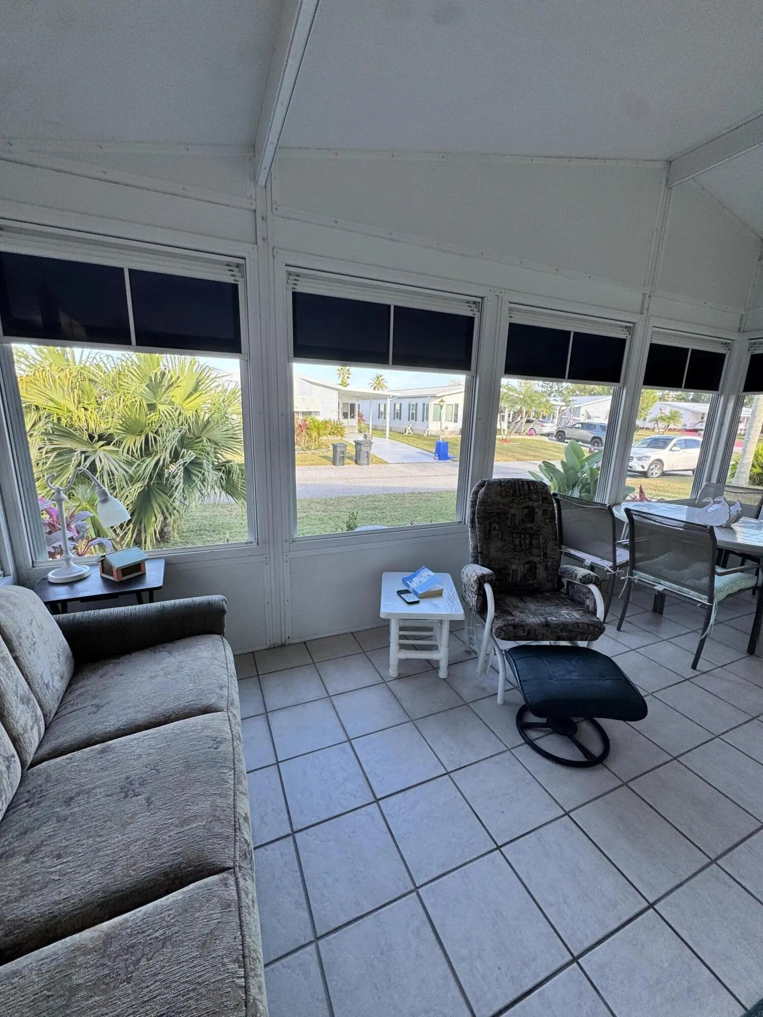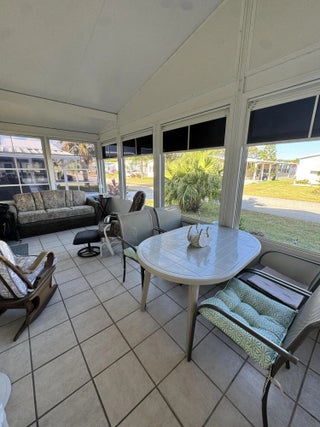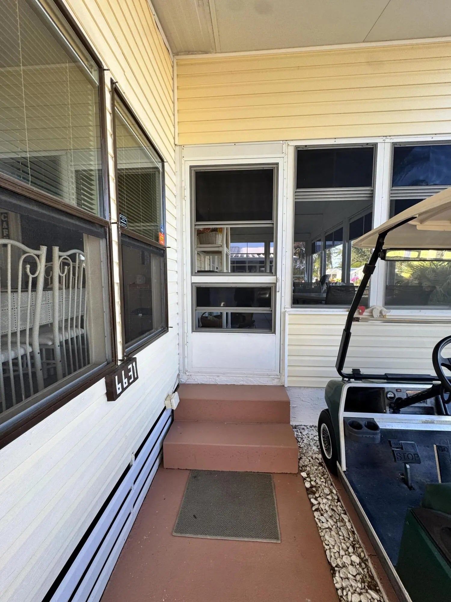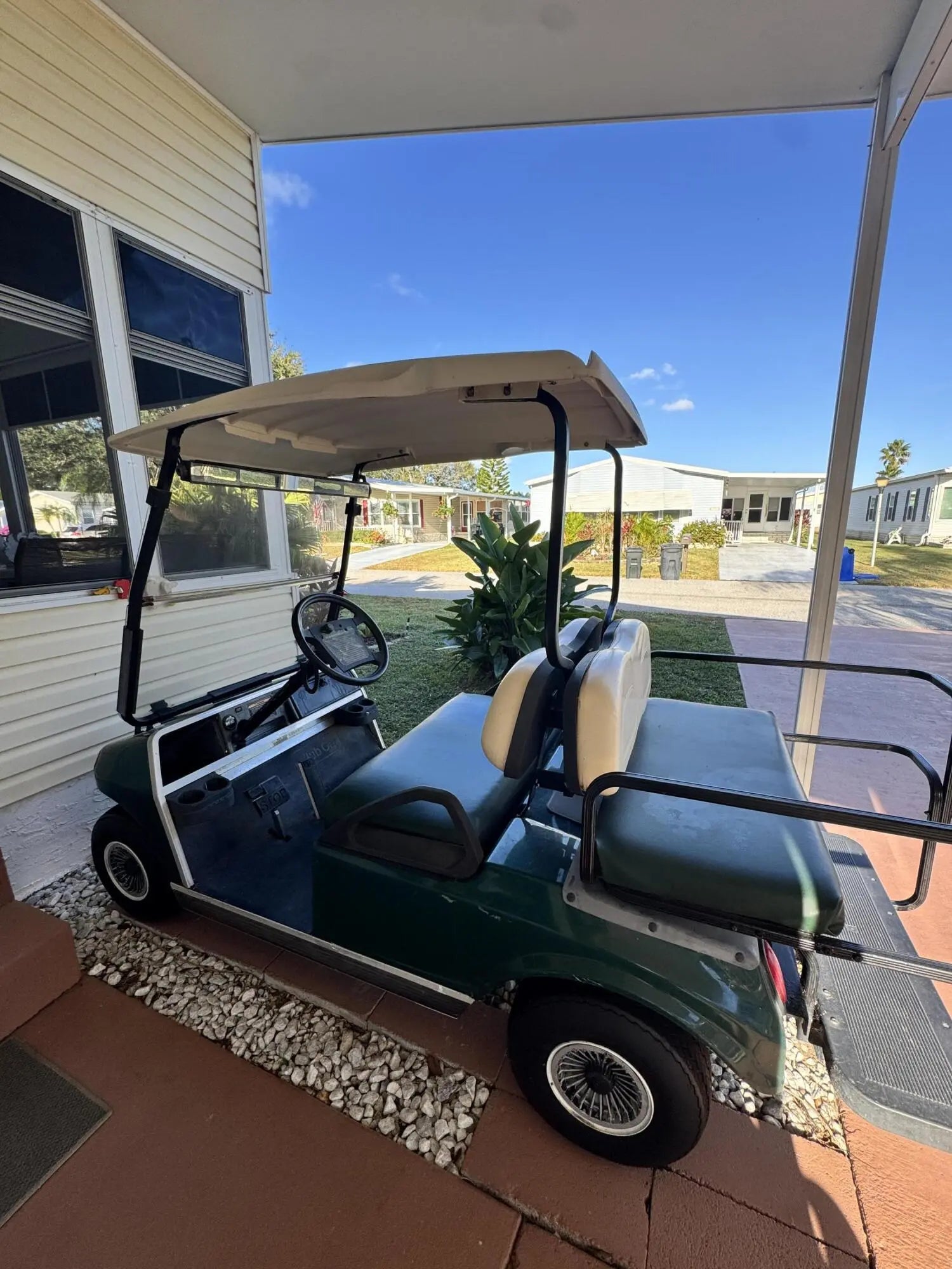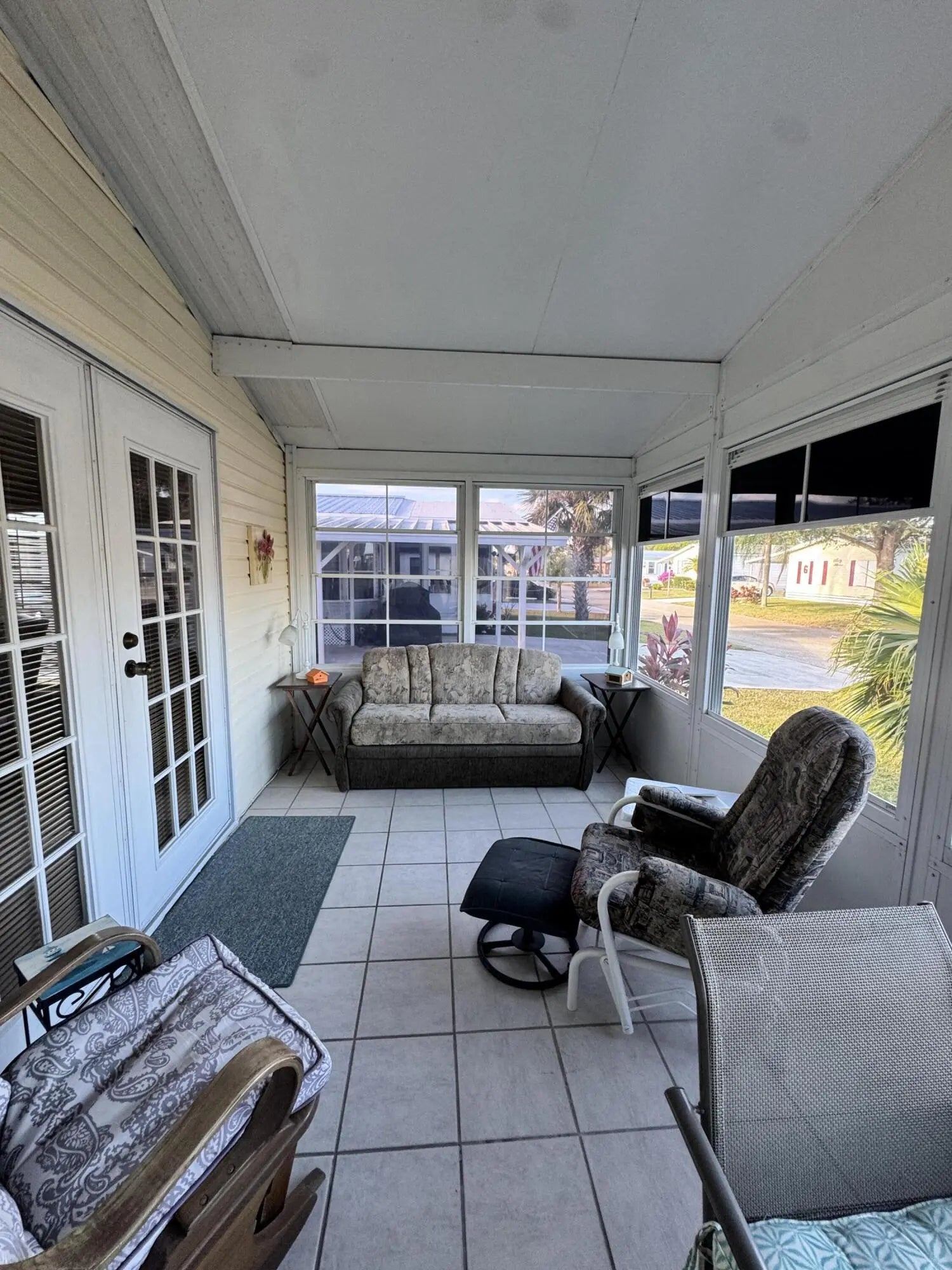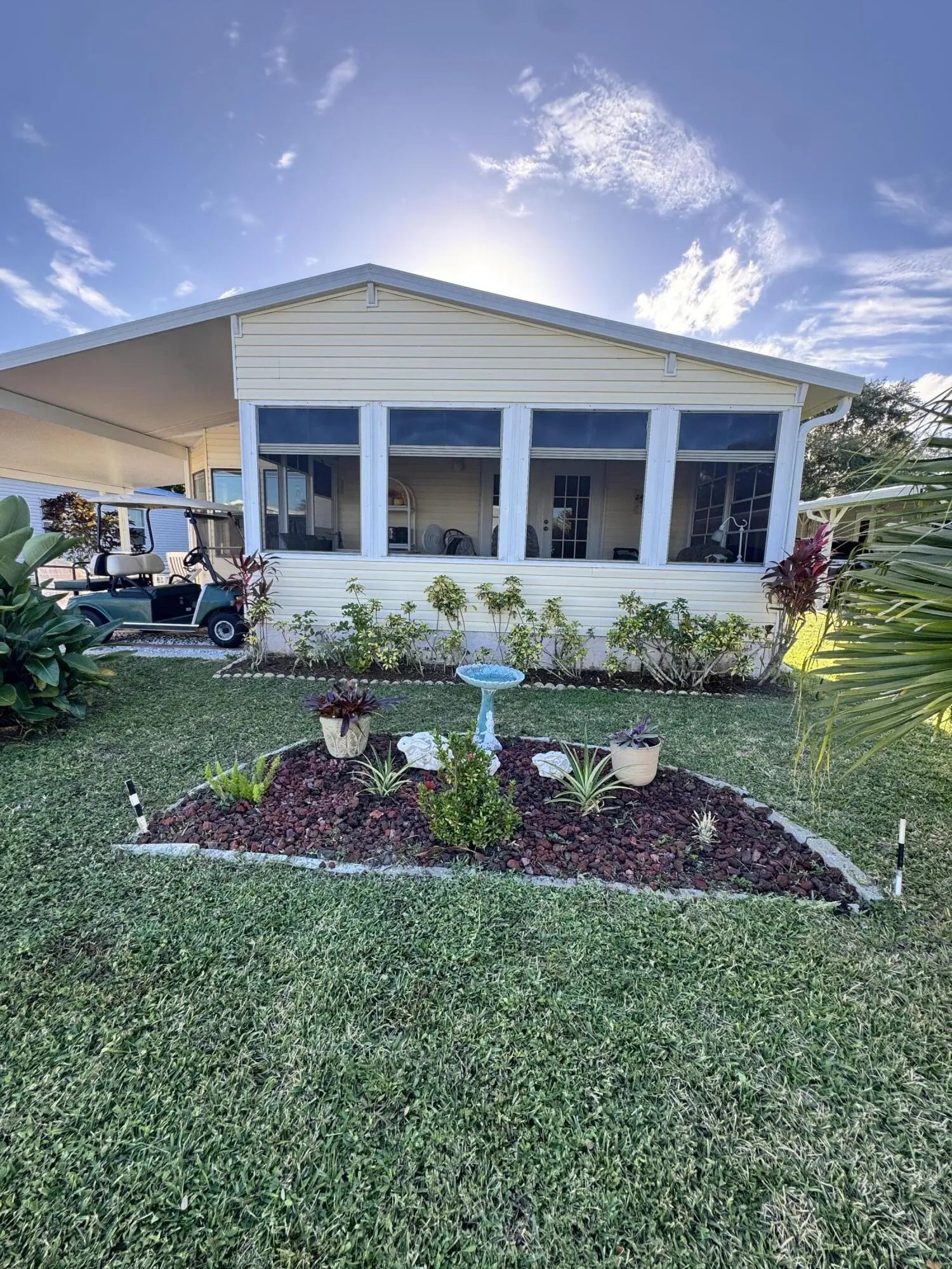 This lovely 2-bedroom 2-bath home is being sold with a golf cart. TURN-KEY home in the desirable 55+Spanish Lakes Fairways community. Home is being sold fully furnished. All kitchen items and linens are provided. 2 sets of golf clubs, six beach chairs. All you will need is your suitcase. Home sits on a quiet cal da sac street. This home has a peaceful, screened-in front patio, great for morning coffee or evening cocktails. French doors lead into the main living area. This home has a great sitting area outside for soaking up the Florida sun. Waterproof vinyl plank flooring NO CARPET. The kitchen has an eat-in area with a coffee bar. Kitchen and dinette total 198 sq ft. Laundry is inside the home. An 18-hole golf course, two pools, tennis, pickleball, bocce ball, shuffleboard, and clubhouse
