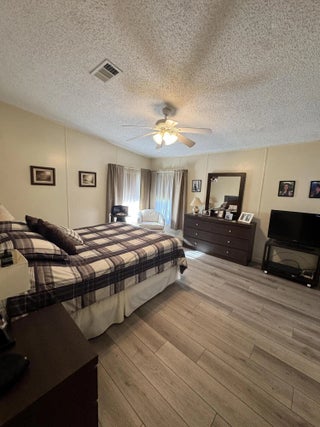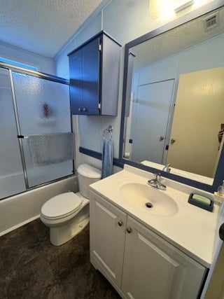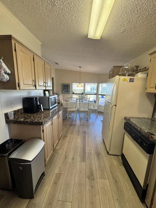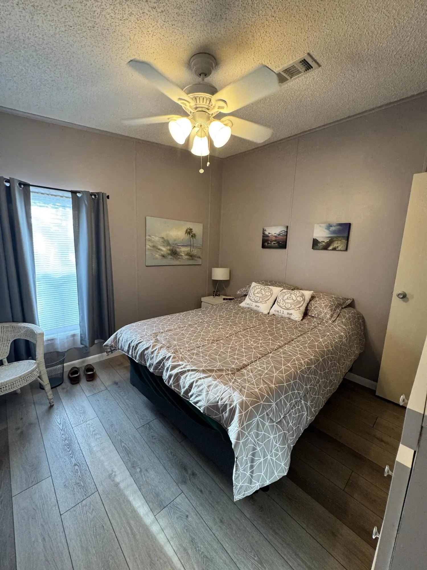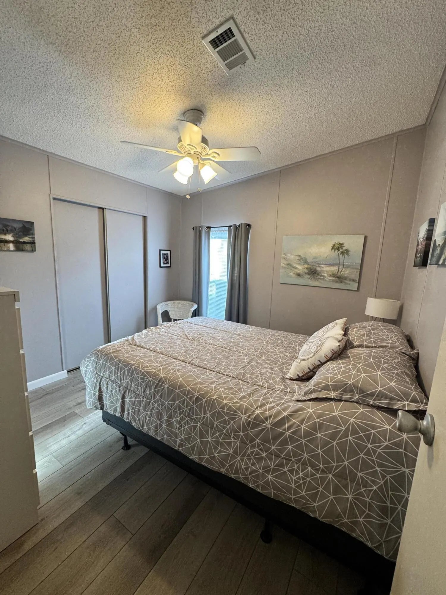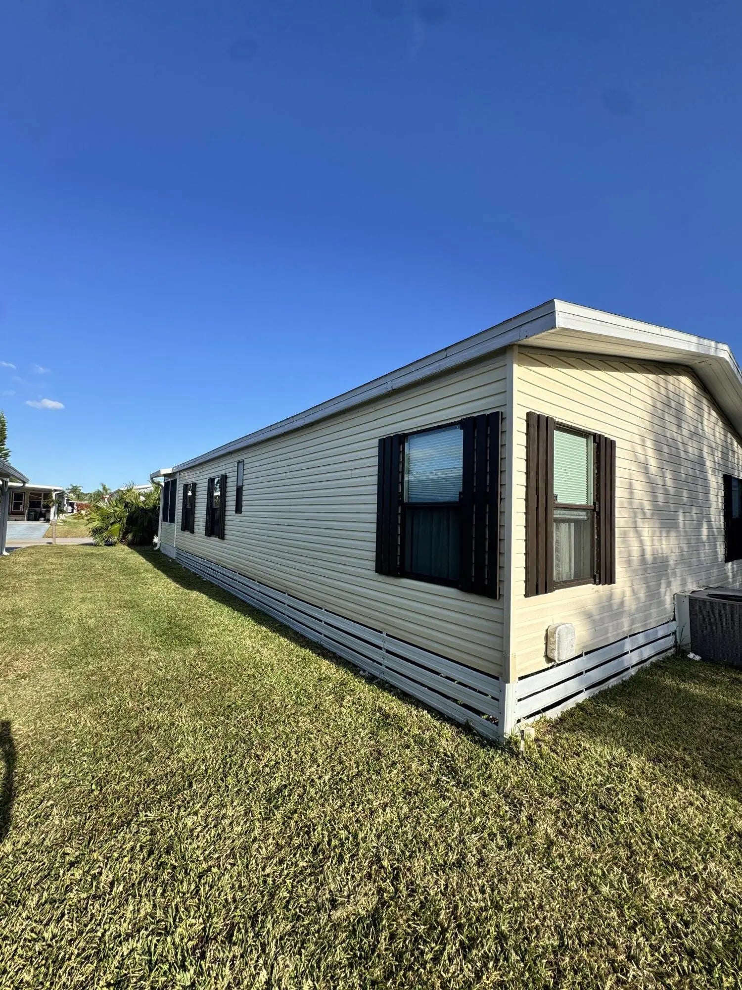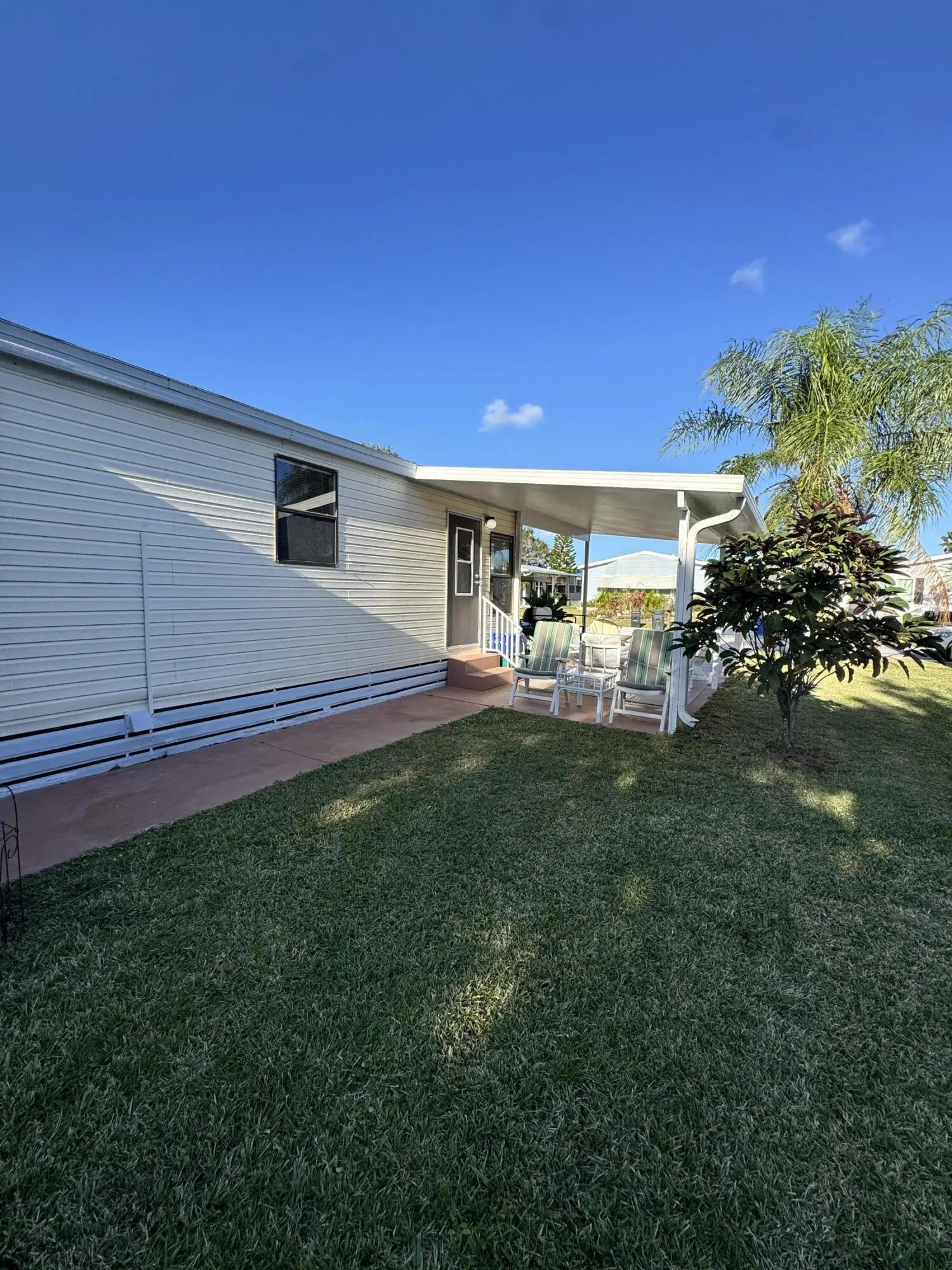 This lovely 2-bedroom 2-bath home is being sold with a golf cart. TURN-KEY home in the desirable 55+Spanish Lakes Fairways community. Home is being sold fully furnished. All kitchen items and linens are provided. 2 sets of golf clubs, six beach chairs. All you will need is your suitcase. Home sits on a quiet cal da sac street. This home has a peaceful, screened-in front patio, great for morning coffee or evening cocktails. French doors lead into the main living area. This home has a great sitting area outside for soaking up the Florida sun. Waterproof vinyl plank flooring NO CARPET. The kitchen has an eat-in area with a coffee bar. Kitchen and dinette total 198 sq ft. Laundry is inside the home. An 18-hole golf course, two pools, tennis, pickleball, bocce ball, shuffleboard, and clubhouse